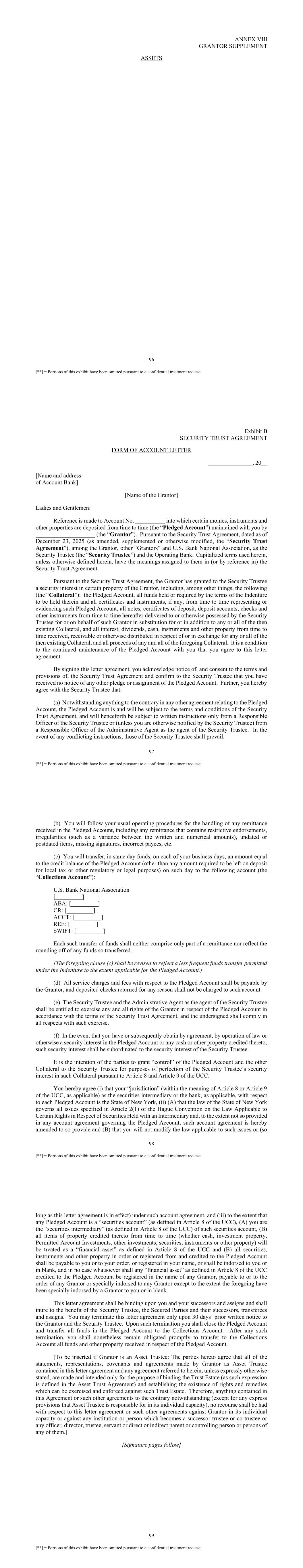 96 [**] = Portions of this exhibit have been omitted pursuant to a confidential treatment request. ANNEX VIII GRANTOR SUPPLEMENT ASSETS 97 [**] = Portions of this exhibit have been omitted pursuant to a confidential treatment request. Exhibit B SECURITY TRUST AGREEMENT FORM OF ACCOUNT LETTER _______________, 20__ [Name and address of Account Bank] [Name of the Grantor] Ladies and Gentlemen: Reference is made to Account No. __________ into which certain monies, instruments and other properties are deposited from time to time (the “Pledged Account”) maintained with you by ____________________ (the “Grantor”). Pursuant to the Security Trust Agreement, dated as of December 23, 2025 (as amended, supplemented or otherwise modified, the “Security Trust Agreement”), among the Grantor, other “Grantors” and U.S. Bank National Association, as the Security Trustee (the “Security Trustee”) and the Operating Bank. Capitalized terms used herein, unless otherwise defined herein, have the meanings assigned to them in (or by reference in) the Security Trust Agreement. Pursuant to the Security Trust Agreement, the Grantor has granted to the Security Trustee a security interest in certain property of the Grantor, including, among other things, the following (the “Collateral”): the Pledged Account, all funds held or required by the terms of the Indenture to be held therein and all certificates and instruments, if any, from time to time representing or evidencing such Pledged Account, all notes, certificates of deposit, deposit accounts, checks and other instruments from time to time hereafter delivered to or otherwise possessed by the Security Trustee for or on behalf of such Grantor in substitution for or in addition to any or all of the then existing Collateral, and all interest, dividends, cash, instruments and other property from time to time received, receivable or otherwise distributed in respect of or in exchange for any or all of the then existing Collateral, and all proceeds of any and all of the foregoing Collateral. It is a condition to the continued maintenance of the Pledged Account with you that you agree to this letter agreement. By signing this letter agreement, you acknowledge notice of, and consent to the terms and provisions of, the Security Trust Agreement and confirm to the Security Trustee that you have received no notice of any other pledge or assignment of the Pledged Account. Further, you hereby agree with the Security Trustee that: (a) Notwithstanding anything to the contrary in any other agreement relating to the Pledged Account, the Pledged Account is and will be subject to the terms and conditions of the Security Trust Agreement, and will henceforth be subject to written instructions only from a Responsible Officer of the Security Trustee or (unless you are otherwise notified by the Security Trustee) from a Responsible Officer of the Administrative Agent as the agent of the Security Trustee. In the event of any conflicting instructions, those of the Security Trustee shall prevail. 98 [**] = Portions of this exhibit have been omitted pursuant to a confidential treatment request. (b) You will follow your usual operating procedures for the handling of any remittance received in the Pledged Account, including any remittance that contains restrictive endorsements, irregularities (such as a variance between the written and numerical amounts), undated or postdated items, missing signatures, incorrect payees, etc. (c) You will transfer, in same day funds, on each of your business days, an amount equal to the credit balance of the Pledged Account (other than any amount required to be left on deposit for local tax or other regulatory or legal purposes) on such day to the following account (the “Collections Account”): U.S. Bank National Association [_________] ABA: [_________] CR: [_________] ACCT: [_________] REF: [_________] SWIFT: [_________] Each such transfer of funds shall neither comprise only part of a remittance nor reflect the rounding off of any funds so transferred. [The foregoing clause (c) shall be revised to reflect a less frequent funds transfer permitted under the Indenture to the extent applicable for the Pledged Account.] (d) All service charges and fees with respect to the Pledged Account shall be payable by the Grantor, and deposited checks returned for any reason shall not be charged to such account. (e) The Security Trustee and the Administrative Agent as the agent of the Security Trustee shall be entitled to exercise any and all rights of the Grantor in respect of the Pledged Account in accordance with the terms of the Security Trust Agreement, and the undersigned shall comply in all respects with such exercise. (f) In the event that you have or subsequently obtain by agreement, by operation of law or otherwise a security interest in the Pledged Account or any cash or other property credited thereto, such security interest shall be subordinated to the security interest of the Security Trustee. It is the intention of the parties to grant “control” of the Pledged Account and the other Collateral to the Security Trustee for purposes of perfection of the Security Trustee’s security interest in such Collateral pursuant to Article 8 and Article 9 of the UCC. You hereby agree (i) that your “jurisdiction” (within the meaning of Article 8 or Article 9 of the UCC, as applicable) as the securities intermediary or the bank, as applicable, with respect to each Pledged Account is the State of New York, (ii) (A) that the law of the State of New York governs all issues specified in Article 2(1) of the Hague Convention on the Law Applicable to Certain Rights in Respect of Securities Held with an Intermediary and, to the extent not so provided in any account agreement governing the Pledged Account, such account agreement is hereby amended to so provide and (B) that you will not modify the law applicable to such issues or (so 99 [**] = Portions of 