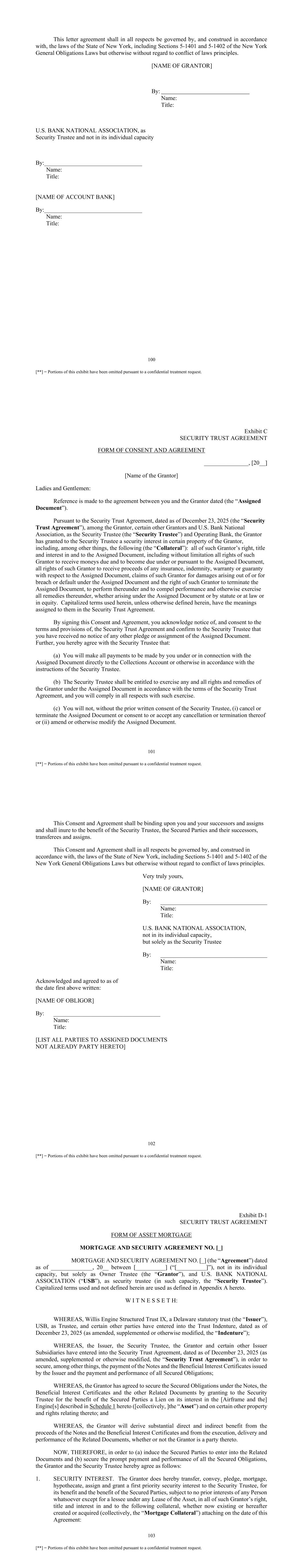 100 [**] = Portions of this exhibit have been omitted pursuant to a confidential treatment request. This letter agreement shall in all respects be governed by, and construed in accordance with, the laws of the State of New York, including Sections 5-1401 and 5-1402 of the New York General Obligations Laws but otherwise without regard to conflict of laws principles. [NAME OF GRANTOR] By: Name: Title: U.S. BANK NATIONAL ASSOCIATION, as Security Trustee and not in its individual capacity By:_________________________________ Name: Title: [NAME OF ACCOUNT BANK] By:_________________________________ Name: Title: 101 [**] = Portions of this exhibit have been omitted pursuant to a confidential treatment request. Exhibit C SECURITY TRUST AGREEMENT FORM OF CONSENT AND AGREEMENT _______________, [20__] [Name of the Grantor] Ladies and Gentlemen: Reference is made to the agreement between you and the Grantor dated (the “Assigned Document”). Pursuant to the Security Trust Agreement, dated as of December 23, 2025 (the “Security Trust Agreement”), among the Grantor, certain other Grantors and U.S. Bank National Association, as the Security Trustee (the “Security Trustee”) and Operating Bank, the Grantor has granted to the Security Trustee a security interest in certain property of the Grantor, including, among other things, the following (the “Collateral”): all of such Grantor’s right, title and interest in and to the Assigned Document, including without limitation all rights of such Grantor to receive moneys due and to become due under or pursuant to the Assigned Document, all rights of such Grantor to receive proceeds of any insurance, indemnity, warranty or guaranty with respect to the Assigned Document, claims of such Grantor for damages arising out of or for breach or default under the Assigned Document and the right of such Grantor to terminate the Assigned Document, to perform thereunder and to compel performance and otherwise exercise all remedies thereunder, whether arising under the Assigned Document or by statute or at law or in equity. Capitalized terms used herein, unless otherwise defined herein, have the meanings assigned to them in the Security Trust Agreement. By signing this Consent and Agreement, you acknowledge notice of, and consent to the terms and provisions of, the Security Trust Agreement and confirm to the Security Trustee that you have received no notice of any other pledge or assignment of the Assigned Document. Further, you hereby agree with the Security Trustee that: (a) You will make all payments to be made by you under or in connection with the Assigned Document directly to the Collections Account or otherwise in accordance with the instructions of the Security Trustee. (b) The Security Trustee shall be entitled to exercise any and all rights and remedies of the Grantor under the Assigned Document in accordance with the terms of the Security Trust Agreement, and you will comply in all respects with such exercise. (c) You will not, without the prior written consent of the Security Trustee, (i) cancel or terminate the Assigned Document or consent to or accept any cancellation or termination thereof or (ii) amend or otherwise modify the Assigned Document. 102 [**] = Portions of this exhibit have been omitted pursuant to a confidential treatment request. This Consent and Agreement shall be binding upon you and your successors and assigns and shall inure to the benefit of the Security Trustee, the Secured Parties and their successors, transferees and assigns. This Consent and Agreement shall in all respects be governed by, and construed in accordance with, the laws of the State of New York, including Sections 5-1401 and 5-1402 of the New York General Obligations Laws but otherwise without regard to conflict of laws principles. Very truly yours, [NAME OF GRANTOR] By: ____________________________________ Name: Title: U.S. BANK NATIONAL ASSOCIATION, not in its individual capacity, but solely as the Security Trustee By: ____________________________________ Name: Title: Acknowledged and agreed to as of the date first above written: [NAME OF OBLIGOR] By: ____________________________________ Name: Title: [LIST ALL PARTIES TO ASSIGNED DOCUMENTS NOT ALREADY PARTY HERETO] 103 [**] = Portions of this exhibit have been omitted pursuant to a confidential treatment request. Exhibit D-1 SECURITY TRUST AGREEMENT FORM OF ASSET MORTGAGE MORTGAGE AND SECURITY AGREEMENT NO. [_] MORTGAGE AND SECURITY AGREEMENT NO. [_] (the “Agreement”) dated as of ______________, 20__ between [__________] (“[__________]”), not in its individual capacity, but solely as Owner Trustee (the “Grantor”), and U.S. BANK NATIONAL ASSOCIATION (“USB”), as security trustee (in such capacity, the “Security Trustee”). Capitalized terms used and not defined herein are used as defined in Appendix A hereto. W I T N E S S E T H: WHEREAS, Willis Engine Structured Trust IX, a Delaware statutory trust (the “Issuer”), USB, as Trustee, and certain other parties have entered into the Trust Indenture, dated as of December 23, 2025 (as amended, supplemented or otherwise modified, the “Indenture”); WHEREAS, the Issuer, the Security Trustee, the Grantor and certain other Issuer Subsidiaries have entered into the Security Trust Agreement, dated as of December 23, 2025 (as amended, supplemented or otherwise modified, the “Security Trust Agreement”), in order to secure, among other things, the payment of the Notes and the Beneficial Interest Certificates issued by the Issuer and the payment and performance of all Secured Obligations; WHEREAS, the Grantor has agreed to secure the Secured Obligations under the Notes, the Beneficial Interest Certificates and the other Related Documents by granting to the Security Trustee for the benefit of the Secured Parties a Lien on its interest in the [Airframe and the] Engine[s] described in Schedule 1 hereto ([collectively, ]the “Asset”) and on certain ot