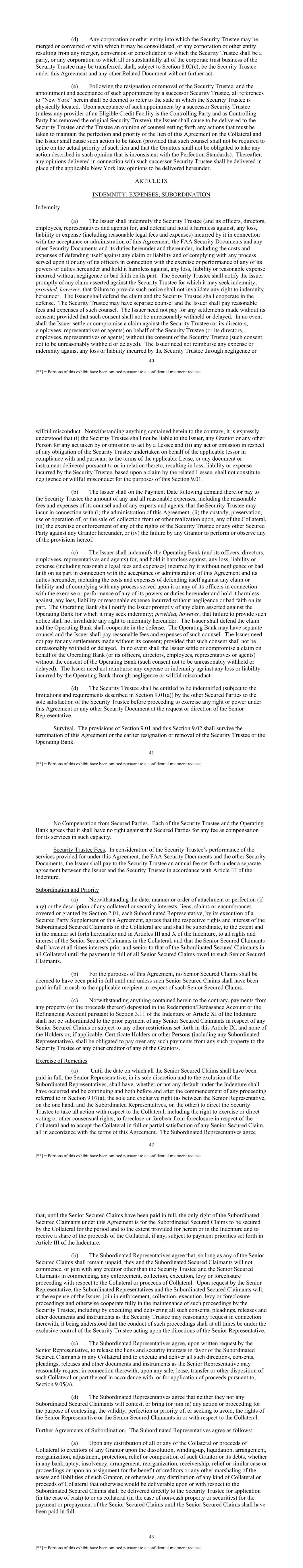 40 [**] = Portions of this exhibit have been omitted pursuant to a confidential treatment request. (d) Any corporation or other entity into which the Security Trustee may be merged or converted or with which it may be consolidated, or any corporation or other entity resulting from any merger, conversion or consolidation to which the Security Trustee shall be a party, or any corporation to which all or substantially all of the corporate trust business of the Security Trustee may be transferred, shall, subject to Section 8.02(c), be the Security Trustee under this Agreement and any other Related Document without further act. (e) Following the resignation or removal of the Security Trustee, and the appointment and acceptance of such appointment by a successor Security Trustee, all references to “New York” herein shall be deemed to refer to the state in which the Security Trustee is physically located. Upon acceptance of such appointment by a successor Security Trustee (unless any provider of an Eligible Credit Facility is the Controlling Party and as Controlling Party has removed the original Security Trustee), the Issuer shall cause to be delivered to the Security Trustee and the Trustee an opinion of counsel setting forth any actions that must be taken to maintain the perfection and priority of the lien of this Agreement on the Collateral and the Issuer shall cause such action to be taken (provided that such counsel shall not be required to opine on the actual priority of such lien and that the Grantors shall not be obligated to take any action described in such opinion that is inconsistent with the Perfection Standards). Thereafter, any opinions delivered in connection with such successor Security Trustee shall be delivered in place of the applicable New York law opinions to be delivered hereunder. ARTICLE IX INDEMNITY; EXPENSES; SUBORDINATION Indemnity (a) The Issuer shall indemnify the Security Trustee (and its officers, directors, employees, representatives and agents) for, and defend and hold it harmless against, any loss, liability or expense (including reasonable legal fees and expenses) incurred by it in connection with the acceptance or administration of this Agreement, the FAA Security Documents and any other Security Documents and its duties hereunder and thereunder, including the costs and expenses of defending itself against any claim or liability and of complying with any process served upon it or any of its officers in connection with the exercise or performance of any of its powers or duties hereunder and hold it harmless against, any loss, liability or reasonable expense incurred without negligence or bad faith on its part. The Security Trustee shall notify the Issuer promptly of any claim asserted against the Security Trustee for which it may seek indemnity; provided, however, that failure to provide such notice shall not invalidate any right to indemnity hereunder. The Issuer shall defend the claim and the Security Trustee shall cooperate in the defense. The Security Trustee may have separate counsel and the Issuer shall pay reasonable fees and expenses of such counsel. The Issuer need not pay for any settlements made without its consent; provided that such consent shall not be unreasonably withheld or delayed. In no event shall the Issuer settle or compromise a claim against the Security Trustee (or its directors, employees, representatives or agents) on behalf of the Security Trustee (or its directors, employees, representatives or agents) without the consent of the Security Trustee (such consent not to be unreasonably withheld or delayed). The Issuer need not reimburse any expense or indemnity against any loss or liability incurred by the Security Trustee through negligence or 41 [**] = Portions of this exhibit have been omitted pursuant to a confidential treatment request. willful misconduct. Notwithstanding anything contained herein to the contrary, it is expressly understood that (i) the Security Trustee shall not be liable to the Issuer, any Grantor or any other Person for any act taken by or omission to act by a Lessee and (ii) any act or omission in respect of any obligation of the Security Trustee undertaken on behalf of the applicable lessor in compliance with and pursuant to the terms of the applicable Lease, or any document or instrument delivered pursuant to or in relation thereto, resulting in loss, liability or expense incurred by the Security Trustee, based upon a claim by the related Lessee, shall not constitute negligence or willful misconduct for the purposes of this Section 9.01. (b) The Issuer shall on the Payment Date following demand therefor pay to the Security Trustee the amount of any and all reasonable expenses, including the reasonable fees and expenses of its counsel and of any experts and agents, that the Security Trustee may incur in connection with (i) the administration of this Agreement, (ii) the custody, preservation, use or operation of, or the sale of, collection from or other realization upon, any of the Collateral, (iii) the exercise or enforcement of any of the rights of the Security Trustee or any other Secured Party against any Grantor hereunder, or (iv) the failure by any Grantor to perform or observe any of the provisions hereof. (c) The Issuer shall indemnify the Operating Bank (and its officers, directors, employees, representatives and agents) for, and hold it harmless against, any loss, liability or expense (including reasonable legal fees and expenses) incurred by it without negligence or bad faith on its part in connection with the acceptance or administration of this Agreement and its duties hereunder, including the costs and expenses of defending itself against any claim or liability and of complying with any process served upon it or any of its officers in connection with the exercise or performance of any of its powers or duties hereunder and hold it harmless against, any loss, liability or reasonable expense in