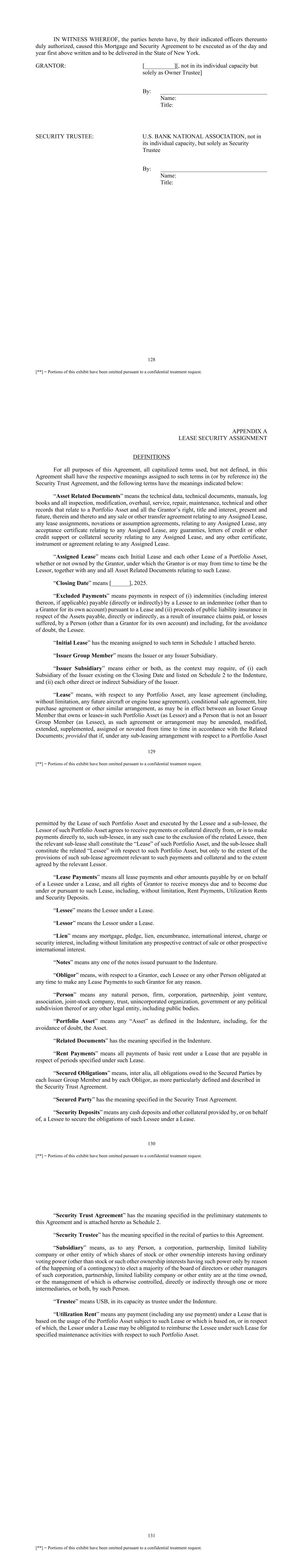 128 [**] = Portions of this exhibit have been omitted pursuant to a confidential treatment request. IN WITNESS WHEREOF, the parties hereto have, by their indicated officers thereunto duly authorized, caused this Mortgage and Security Agreement to be executed as of the day and year first above written and to be delivered in the State of New York. GRANTOR: [__________][, not in its individual capacity but solely as Owner Trustee] By: ____________________________________ Name: Title: SECURITY TRUSTEE: U.S. BANK NATIONAL ASSOCIATION, not in its individual capacity, but solely as Security Trustee By: ____________________________________ Name: Title: 129 [**] = Portions of this exhibit have been omitted pursuant to a confidential treatment request. APPENDIX A LEASE SECURITY ASSIGNMENT DEFINITIONS For all purposes of this Agreement, all capitalized terms used, but not defined, in this Agreement shall have the respective meanings assigned to such terms in (or by reference in) the Security Trust Agreement, and the following terms have the meanings indicated below: “Asset Related Documents” means the technical data, technical documents, manuals, log books and all inspection, modification, overhaul, service, repair, maintenance, technical and other records that relate to a Portfolio Asset and all the Grantor’s right, title and interest, present and future, therein and thereto and any sale or other transfer agreement relating to any Assigned Lease, any lease assignments, novations or assumption agreements, relating to any Assigned Lease, any acceptance certificate relating to any Assigned Lease, any guaranties, letters of credit or other credit support or collateral security relating to any Assigned Lease, and any other certificate, instrument or agreement relating to any Assigned Lease. “Assigned Lease” means each Initial Lease and each other Lease of a Portfolio Asset, whether or not owned by the Grantor, under which the Grantor is or may from time to time be the Lessor, together with any and all Asset Related Documents relating to such Lease. “Closing Date” means [______], 2025. “Excluded Payments” means payments in respect of (i) indemnities (including interest thereon, if applicable) payable (directly or indirectly) by a Lessee to an indemnitee (other than to a Grantor for its own account) pursuant to a Lease and (ii) proceeds of public liability insurance in respect of the Assets payable, directly or indirectly, as a result of insurance claims paid, or losses suffered, by a Person (other than a Grantor for its own account) and including, for the avoidance of doubt, the Lessee. “Initial Lease” has the meaning assigned to such term in Schedule 1 attached hereto. “Issuer Group Member” means the Issuer or any Issuer Subsidiary. “Issuer Subsidiary” means either or both, as the context may require, of (i) each Subsidiary of the Issuer existing on the Closing Date and listed on Schedule 2 to the Indenture, and (ii) each other direct or indirect Subsidiary of the Issuer. “Lease” means, with respect to any Portfolio Asset, any lease agreement (including, without limitation, any future aircraft or engine lease agreement), conditional sale agreement, hire purchase agreement or other similar arrangement, as may be in effect between an Issuer Group Member that owns or leases-in such Portfolio Asset (as Lessor) and a Person that is not an Issuer Group Member (as Lessee), as such agreement or arrangement may be amended, modified, extended, supplemented, assigned or novated from time to time in accordance with the Related Documents; provided that if, under any sub-leasing arrangement with respect to a Portfolio Asset 130 [**] = Portions of this exhibit have been omitted pursuant to a confidential treatment request. permitted by the Lease of such Portfolio Asset and executed by the Lessee and a sub-lessee, the Lessor of such Portfolio Asset agrees to receive payments or collateral directly from, or is to make payments directly to, such sub-lessee, in any such case to the exclusion of the related Lessee, then the relevant sub-lease shall constitute the “Lease” of such Portfolio Asset, and the sub-lessee shall constitute the related “Lessee” with respect to such Portfolio Asset, but only to the extent of the provisions of such sub-lease agreement relevant to such payments and collateral and to the extent agreed by the relevant Lessor. “Lease Payments” means all lease payments and other amounts payable by or on behalf of a Lessee under a Lease, and all rights of Grantor to receive moneys due and to become due under or pursuant to such Lease, including, without limitation, Rent Payments, Utilization Rents and Security Deposits. “Lessee” means the Lessee under a Lease. “Lessor” means the Lessor under a Lease. “Lien” means any mortgage, pledge, lien, encumbrance, international interest, charge or security interest, including without limitation any prospective contract of sale or other prospective international interest. “Notes” means any one of the notes issued pursuant to the Indenture. “Obligor” means, with respect to a Grantor, each Lessee or any other Person obligated at any time to make any Lease Payments to such Grantor for any reason. “Person” means any natural person, firm, corporation, partnership, joint venture, association, joint-stock company, trust, unincorporated organization, government or any political subdivision thereof or any other legal entity, including public bodies. “Portfolio Asset” means any “Asset” as defined in the Indenture, including, for the avoidance of doubt, the Asset. “Related Documents” has the meaning specified in the Indenture. “Rent Payments” means all payments of basic rent under a Lease that are payable in respect of periods specified under such Lease. “Secured Obligations” means, inter alia, all obligations owed to the Secured Parties by each Issuer Group Member and by each Obligor, as m