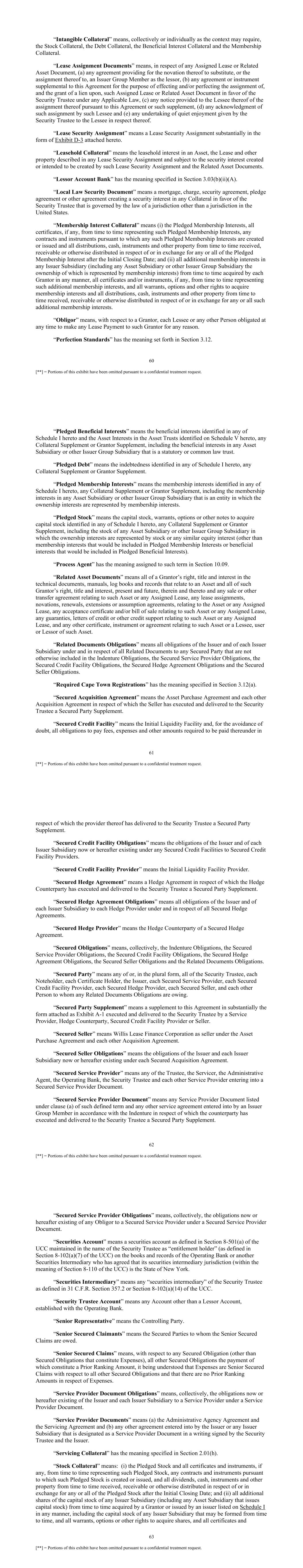 60 [**] = Portions of this exhibit have been omitted pursuant to a confidential treatment request. “Intangible Collateral” means, collectively or individually as the context may require, the Stock Collateral, the Debt Collateral, the Beneficial Interest Collateral and the Membership Collateral. “Lease Assignment Documents” means, in respect of any Assigned Lease or Related Asset Document, (a) any agreement providing for the novation thereof to substitute, or the assignment thereof to, an Issuer Group Member as the lessor, (b) any agreement or instrument supplemental to this Agreement for the purpose of effecting and/or perfecting the assignment of, and the grant of a lien upon, such Assigned Lease or Related Asset Document in favor of the Security Trustee under any Applicable Law, (c) any notice provided to the Lessee thereof of the assignment thereof pursuant to this Agreement or such supplement, (d) any acknowledgment of such assignment by such Lessee and (e) any undertaking of quiet enjoyment given by the Security Trustee to the Lessee in respect thereof. “Lease Security Assignment” means a Lease Security Assignment substantially in the form of Exhibit D-3 attached hereto. “Leasehold Collateral” means the leasehold interest in an Asset, the Lease and other property described in any Lease Security Assignment and subject to the security interest created or intended to be created by such Lease Security Assignment and the Related Asset Documents. “Lessor Account Bank” has the meaning specified in Section 3.03(b)(ii)(A). “Local Law Security Document” means a mortgage, charge, security agreement, pledge agreement or other agreement creating a security interest in any Collateral in favor of the Security Trustee that is governed by the law of a jurisdiction other than a jurisdiction in the United States. “Membership Interest Collateral” means (i) the Pledged Membership Interests, all certificates, if any, from time to time representing such Pledged Membership Interests, any contracts and instruments pursuant to which any such Pledged Membership Interests are created or issued and all distributions, cash, instruments and other property from time to time received, receivable or otherwise distributed in respect of or in exchange for any or all of the Pledged Membership Interest after the Initial Closing Date; and (ii) all additional membership interests in any Issuer Subsidiary (including any Asset Subsidiary or other Issuer Group Subsidiary the ownership of which is represented by membership interests) from time to time acquired by each Grantor in any manner, all certificates and/or instruments, if any, from time to time representing such additional membership interests, and all warrants, options and other rights to acquire membership interests and all distributions, cash, instruments and other property from time to time received, receivable or otherwise distributed in respect of or in exchange for any or all such additional membership interests. “Obligor” means, with respect to a Grantor, each Lessee or any other Person obligated at any time to make any Lease Payment to such Grantor for any reason. “Perfection Standards” has the meaning set forth in Section 3.12. 61 [**] = Portions of this exhibit have been omitted pursuant to a confidential treatment request. “Pledged Beneficial Interests” means the beneficial interests identified in any of Schedule I hereto and the Asset Interests in the Asset Trusts identified on Schedule V hereto, any Collateral Supplement or Grantor Supplement, including the beneficial interests in any Asset Subsidiary or other Issuer Group Subsidiary that is a statutory or common law trust. “Pledged Debt” means the indebtedness identified in any of Schedule I hereto, any Collateral Supplement or Grantor Supplement. “Pledged Membership Interests” means the membership interests identified in any of Schedule I hereto, any Collateral Supplement or Grantor Supplement, including the membership interests in any Asset Subsidiary or other Issuer Group Subsidiary that is an entity in which the ownership interests are represented by membership interests. “Pledged Stock” means the capital stock, warrants, options or other notes to acquire capital stock identified in any of Schedule I hereto, any Collateral Supplement or Grantor Supplement, including the stock of any Asset Subsidiary or other Issuer Group Subsidiary in which the ownership interests are represented by stock or any similar equity interest (other than membership interests that would be included in Pledged Membership Interests or beneficial interests that would be included in Pledged Beneficial Interests). “Process Agent” has the meaning assigned to such term in Section 10.09. “Related Asset Documents” means all of a Grantor’s right, title and interest in the technical documents, manuals, log books and records that relate to an Asset and all of such Grantor’s right, title and interest, present and future, therein and thereto and any sale or other transfer agreement relating to such Asset or any Assigned Lease, any lease assignments, novations, renewals, extensions or assumption agreements, relating to the Asset or any Assigned Lease, any acceptance certificate and/or bill of sale relating to such Asset or any Assigned Lease, any guaranties, letters of credit or other credit support relating to such Asset or any Assigned Lease, and any other certificate, instrument or agreement relating to such Asset or a Lessee, user or Lessor of such Asset. “Related Documents Obligations” means all obligations of the Issuer and of each Issuer Subsidiary under and in respect of all Related Documents to any Secured Party that are not otherwise included in the Indenture Obligations, the Secured Service Provider Obligations, the Secured Credit Facility Obligations, the Secured Hedge Agreement Obligations and the Secured Seller Obligations. “Required Cape Town Registration
