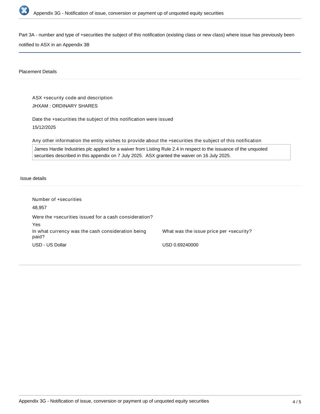 附录3G-发行、转换或缴付未上市股本证券的通知附录3G-发行通知,未上市股本证券的转换或缴款4/5第3A部分-本通知标的(现有类别或新类别)的+证券的数量和类型,其中问题先前已在附录3B中通知ASX配售详情ASX +证券代码和说明JHXAM:普通股日期本通知标的的+证券已发行15/12/2025实体希望提供的有关本通知标的的+证券的任何其他信息詹姆斯哈迪 plc于2025年7月7日就本附录所述的未上市证券的发行申请了上市规则第2.4条的豁免。ASX于2025年7月16日授予该豁免。发行详情+证券数量48,957 +证券是以现金对价发行的吗?现金对价是用什么货币支付的?美元-美元每+证券发行价是多少?0.69 240000美元是