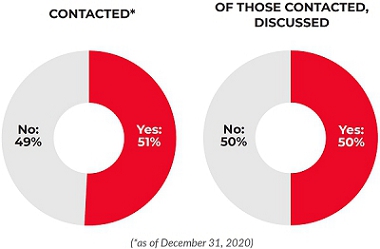 我们强大的周期性和非周期性参与确保我们听到股东的反馈(截至2020年12月31日):(a)我们向代表约50.7%流通股的股东提供了与治理委员会主席会面的机会,(b)在提供的建议中,49.8%接受了邀请,(c)在我们邮寄了2020年委托书之后,但在2020年股东大会之前,我们提供了与前10名股东讨论委托书的机会(截至2019年12月31日); |
