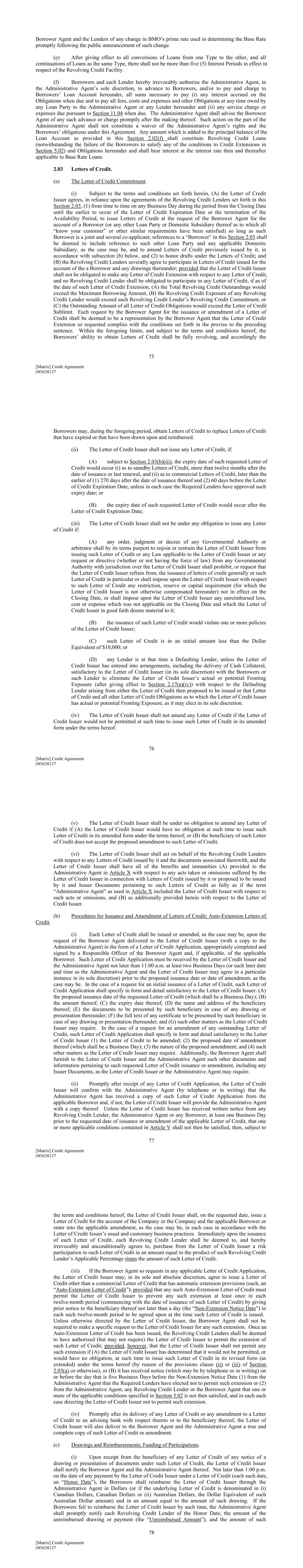 借款人代理和贷款人对用于确定基准利率的BMO最优惠利率的任何变化在此类变化的公告发布后立即作出。(e)在将所有贷款从一种类型转换为另一种类型并将所有贷款延续为同一类型后,循环信贷融资的有效利息期不得超过五(5)个。(f)借款人及每名贷款人在此不可撤销地授权行政代理人全权酌情向借款人垫付款项,及/或向借款人根据本协议的贷款账户支付及收取所有必要款项,以支付(i)到期债务的任何应计利息,以及在任何时间支付任何贷款方根据本协议欠行政代理人或任何贷款人的所有费用、成本及开支及其他债务,以及(ii)到期时根据第11.04条应付的任何服务费或开支。行政代理人应当在作出任何此类垫款或收费后,立即告知借款人代理人。行政代理人的这种行为,不构成对行政代理人权利和借款人在本协议项下义务的放弃。任何按本条第2.02(f)款规定加入贷款账户本金余额的款额,均构成循环信用贷款(尽管借款人未能满足第5.02条中信贷展期的任何条件)和本协议项下的义务,并应按当时及其后适用于基本利率贷款的利率计息。2.03信用证。(a)信用证承诺。(i)在符合本条款及条件的规定下,(a)信用证发行人依据本条第2.03条所载的循环信贷贷款人的协议,不时同意(1)在自信用证截止日起至该信用证到期日或可用期终止(以较早者为准)的期间内的任何营业日,应借款人代理人的请求为借款人(或任何其他贷款方或其境内子公司就其所有“了解您的客户”或其他类似要求已得到满足)的账户签发信用证,只要该借款人是共同和若干共同申请人;本条第2.03款中对“借款人”的提述应被视为包括对该其他贷款方和任何适用的境内子公司(视情况而定)的提述,并根据下文(b)款修订其先前签发的信用证,(2)根据信用证承兑汇票;及(b)循环信贷放款人分别同意参与为借款人的帐户签发的信用证及其项下的任何提款;但信用证发行人无须就任何信用证作出任何信用证延期的义务,且任何循环信贷放款人均无义务参与任何信用证,如截至该信用证延期之日,(a)循环信贷未结清总额将超过最高借款金额,(b)任何循环信贷贷款人的循环信贷风险敞口将超过该循环信贷贷款人的循环信贷承诺,或(c)所有信用证债务的未偿金额将超过信用证分限额。借款人代理人提出的签发或修改信用证的每一项请求,均应视为借款人代理人对如此请求的信用证延期符合前句但书所述条件的陈述。在上述限额内,并在符合本协议条款和条件的情况下,借款人取得信用证的能力应是完全循环的,据此,75 [矩阵]信用协议# 85638137借款人可在前述期间内取得信用证,以取代已到期或已提款并偿付的信用证。(ii)如出现以下情况,信用证发行人不得签发任何信用证:(a)在符合第2.03(b)(iii)条的规定下,所要求的该等信用证的到期日将发生在(i)备用信用证,自签发或最后一次续期之日起超过十二个月;及(ii)商业信用证,迟于其签发日期后的(1)270天后及(2)信用证到期日前60天中较早者,除非在每种情况下,规定贷款人已批准该等到期日;或(b)该等所要求的信用证的到期日将发生在信用证到期日之后;(iii)在以下情况下,信用证发行人不承担任何开具任何信用证的义务:(a)任何订单, 任何政府当局或仲裁员的判决或裁定,根据其条款,应旨在禁止或限制信用证发行人签发该信用证或适用于信用证发行人的任何法律或对信用证发行人有管辖权的任何政府当局的任何请求或指示(无论是否具有法律效力),均应禁止或要求信用证发行人不这样做,信用证的签发一般或特别是该信用证,或应就该信用证向信用证发行人施加任何在截止日期不生效的限制、准备金或资本要求(信用证发行人未根据本协议获得其他补偿),或应向信用证发行人施加任何未偿付的损失,在截止日不适用且信用证发行人善意认为对其具有重要意义的成本或费用;(b)签发此类信用证将违反信用证发行人的一项或多项政策;(c)此类信用证的初始金额低于相当于10,000美元的美元;或(d)任何贷款人当时是违约贷款人,除非信用证发行人已订立安排,包括交付现金抵押品,信纳信用证发行人(其全权酌情决定权)与借款人或该等贷款人消除信用证发行人对违约贷款人的实际或潜在的前置风险敞口(在使第2.17(a)(iv)节生效后),该违约贷款人因当时提议签发的信用证或该信用证和信用证发行人具有实际或潜在前置风险敞口的所有其他信用证义务而产生,由其全权酌情选择。(iv)如根据本协议的条款,信用证发行人当时将不被允许以经修订的形式签发该信用证,则信用证发行人不得对任何信用证进行修订。76 [ Matrix ]信用协议# 85638137(v)如果(a)信用证发行人当时没有义务根据本协议的条款以经修订的形式签发该信用证,或(b)该信用证的受益人不接受对该信用证的拟议修订,则信用证发行人没有义务修改任何信用证。(vi)信用证发行人应就其签发的任何信用证及其相关单证代表循环信贷贷款人行事,信用证发行人就信用证发行人就其签发或拟签发的信用证所采取或不采取的任何作为或不作为以及与该等信用证有关的发行人单证,享有第十条向行政代理人提供的全部利益和豁免(甲),犹如第十条所使用的“行政代理人”一词包括与该等作为或不作为有关的信用证发行人,及(b)就信用证发行人在此另作规定。(b)信用证签发和修改程序;自动延期信用证。(i)每份信用证须应以信用证申请书形式交付