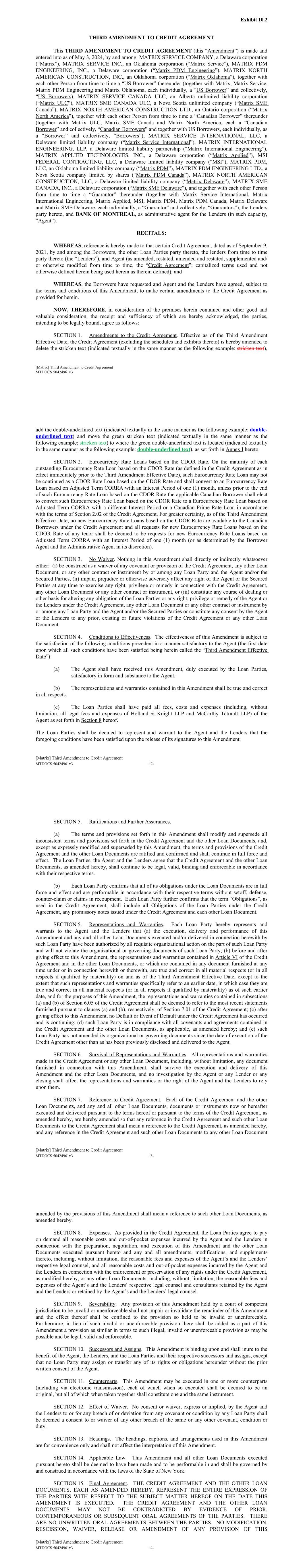 信贷协议的第三次修订信贷协议的第三次修订(本“修订”)是由特拉华州公司Matrix Service Company(“Matrix”)、俄克拉荷马州公司Matrix Service INC.(“美佳工程”)、特拉华州公司Matrix PDM Engineering,INC.(“Matrix PDM Engineering”)、俄克拉荷马州公司Matrix Northern American Construction,INC.(“Matrix Oklahoma”)作出并于2024年5月3日订立的,连同其他人不时为其项下的“美国借款人”(连同Matrix,艾伯塔省无限责任公司(“Matrix ULC”)、新斯科舍省无限公司MATRIX SME CANADA ULC(“Matrix SME Canada”)、安大略省公司MATRIX NORICAN CONSTRUCTION LTD.(“Matrix North America”),连同彼此不时成为其下的“加拿大借款人”(连同Matrix ULC、Matrix SME Canada和Matrix North America,各自为“加拿大借款人”,统称为“加拿大借款人”,并与美国借款人一起,各自为“借款人”,统称为“借款人”),特拉华州有限责任公司MATRIX SERVICE INTERNATIONAL,LLC(“美佳工程 International”),MATRIX ININRIX INRIX INER(“MatriMatrix Applied TECHNOLOGIES,INC.,a Delaware corporation(“Matrix Applied”)、MSI FEDERAL CONTRACTing,LLC,a Delaware limited liability company(“MSI”)、Matrix PDM,LLC,a Oklahoma limited liability company(“Matrix PDM”)、Matrix PDM Engineering LTD.,a Nova Scotia company(“Matrix PDM Canada”)、Matrix NORTH AMERICAN Construction,LLC,a Delaware limited liability company(“Matrix Delaware”)、Matrix SME CANADA,INC.,aMatrix Delaware和Matrix SME Delaware,各自为“担保人”,统称为“担保人”),本协议的贷款方,以及蒙特利尔银行,作为贷款人的行政代理人(以这种身份,“代理人”)。RECITALS:然而,兹提述借款人、其他贷款方、不时作为贷款方的贷款人(“贷款人”)和代理人(经不时修订、重述、修订和重述、补充和/或以其他方式修改的“信贷协议”;此处使用且未另行定义的大写术语如其中所定义)于2021年9月9日签署的某些信贷协议;鉴于借款人已提出要求且代理人和贷款人已同意,但以本修订的条款和条件为限,根据本协议的规定对信贷协议进行某些修订。现据此,考虑到此处所载前提及其他良好、有价值的对价,特此确认其收受及充分性,拟受法律约束的当事人约定如下:第一节。信贷协议的修订。自第三次修订生效日期起生效,现修订信贷协议(不包括其附表及证物),以删除被删除的文字(以与以下示例相同的方式以文字表示:被删除的文字),附件 10.2 [矩阵]信贷协议第三修正案MTDOCS 50424961v3增加双下划线文本(以与以下示例相同的方式以文本方式表示:双下划线文本)并将绿色的下划线文本(以与以下示例相同的方式以文本方式表示:下划线文本)移动到绿色双下划线文本所在的位置(以与以下示例相同的方式以文本方式表示:双下划线文本),详见附件一。第2节。基于CDOR利率的欧元货币利率贷款。在每笔基于CDOR利率(定义见紧接第三次修订生效日期之前有效的信贷协议)的未偿还欧元货币利率贷款到期时,该等欧元货币利率贷款不得作为基于CDOR利率的CDOR利率贷款继续进行,并应转换为基于一(1)个月计息期的调整后期限CORRA的欧元货币利率贷款,除非在此类基于CDOR利率的欧元汇率贷款结束之前,适用的加拿大借款人应根据信贷协议第2.02节的条款,选择将基于CDOR利率的此类欧元汇率贷款转换为基于不同利息期的调整后期限CORRA的欧元汇率贷款或加拿大最优惠利率贷款。为了更大的确定性,截至第三修正案生效日期, 根据信贷协议,加拿大借款人不得获得基于CDOR利率的新的欧元货币利率贷款,所有基于任何期限的CDOR利率的新的欧元货币利率贷款请求均应被视为基于一(1)个月利息期的调整后期限CORRA的新的欧元货币利率贷款请求(或由借款人代理人和行政代理人酌情确定)。第3节。不放弃。本修订不得直接或间接作出任何规定:(i)被解释为任何贷款方与代理人和/或有担保当事人之间或之间对信贷协议、任何其他贷款文件或任何其他合同或文书的任何契诺或规定的放弃,(ii)损害、损害或以其他方式对代理人或有担保当事人在任何时候行使与信贷协议、任何其他贷款文件或任何其他合同或文书有关的任何权利、特权或补救措施的任何权利产生不利影响,或(iii)构成任何交易过程或其他基础,以改变贷款方的任何义务或代理人或贷款人在信贷协议、任何其他贷款文件或任何其他合同或文书下的任何权利、特权或补救,由任何贷款方与代理人及/或有担保方或在其之间,或构成代理人或贷款人对任何先前、现有或未来违反信贷协议或任何其他贷款文件的任何同意。第4节。生效条件。本修正案的有效性须以代理人满意的方式满足以下先决条件(所有这些条件得到满足的第一个日期在此称为“第三次修正生效日期”):(a)代理人应已收到本修正案,并由贷款方正式签署,在形式和实质上均令代理人满意。(b)本修订所载的陈述及保证在各方面均属真实及正确。(c)贷款方应已支付本协议第8条规定的代理人的所有费用、成本和开支(包括但不限于Holland & Knight LLP和McCarthy T é trault LLP的所有法律费用和开支)。贷款方应被视为在其对本修正案的签字解除时向代理人和出借人声明并保证前述条件已经满足。[矩阵]信贷协议第三修正案MTDOCS50424961v3-2-第5节。批准和进一步保证。(a)本修正案所载的条款和规定应修改和取代信贷协议和其他贷款文件所载的所有不一致的条款和规定,除本修正案明确修改和取代外,信贷协议和其他贷款文件的条款和规定经批准和