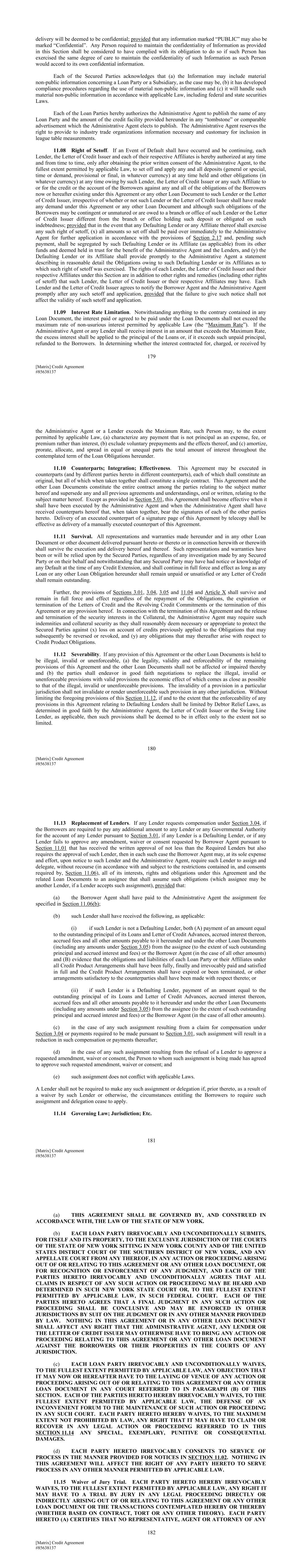 交付将被视为机密;前提是任何标记为“公开”的信息也可能被标记为“机密”。任何须按本条规定保持资料保密性的人,如已行使与该人对其本身的机密资料所给予的同等程度的谨慎以保持该等资料的保密性,即视为已遵守其这样做的义务。每一有担保方都承认,(a)信息可能包括有关贷款方或子公司的重大非公开信息(视情况而定),(b)它制定了有关使用重大非公开信息的合规程序,(c)它将根据适用法律(包括联邦和州证券法)处理此类重大非公开信息。每一贷款方特此授权行政代理人在行政代理人选择发布的任何“墓碑”或类似广告中公布任何贷款方的名称和本协议项下提供的信贷额度。行政代理人保留向行业贸易组织提供纳入排行榜计量所必需和惯常信息的权利。11.08抵销权。违约事件应当已经发生并仍在继续的,特此授权各贷款人、信用证发行人及其各自的关联机构在取得行政代理人的事先书面同意后,在适用法律允许的最大范围内,随时、不时地抵销和适用该贷款人在任何时间持有的任何和所有存款(一般或特别、时间或活期、临时或最终、以任何货币计)以及在任何时间所欠的其他债务(以任何货币计),信用证发行人或任何该等附属公司或为借款人的信贷或账户针对借款人根据本协议或对该贷款人或信用证发行人的任何其他贷款文件现在或以后存在的任何及所有义务,无论该贷款人或信用证发行人是否已根据本协议或任何其他贷款文件提出任何要求,尽管借款人的该等义务可能是或有的或未到期的,或欠该贷款人的分支机构或办事处或信用证发行人与持有该存款的分支机构或办事处不同,或对该债务承担义务;但如果任何违约贷款人或其任何关联机构应行使任何该等抵销权,(x)如此抵销的所有款项须立即付予行政代理人,以便按照第2.17条的规定进一步申请,并在该等付款前,由该违约贷款人或其关联机构(如适用)与其其他资金分开,并当作为行政代理人及贷款人的利益而以信托方式持有,(y)违约贷款人或其关联机构应迅速向行政代理人提供一份说明,合理详细地说明行使该抵销权所欠该违约贷款人或其关联机构的义务。每个贷款人、信用证发行人及其各自的关联公司在本节项下的权利是该贷款人、信用证发行人或其各自的关联公司可能拥有的其他权利和补救措施(包括其他抵销权)之外的权利。各贷款人和信用证发行人同意在发生该等抵销和申请后,及时通知借款人代理人和行政代理人,但未发出该通知不影响该抵销和申请的有效性。11.09利率限制。尽管任何贷款文件中有任何相反的规定,根据贷款文件已支付或同意支付的利息不得超过适用法律允许的非高利贷利息的最高利率(“最高利率”)。行政代理人或者任何贷款人收取的利息超过最高利率的,超过的利息应当计入贷款本金,或者超过该未付本金的,退还给借款人。在确定179 [矩阵]信贷协议# 85638137行政代理人或贷款人所约定、收取或收取的利息是否超过最高利率时,该人可在适用法律允许的范围内,(a)将任何非本金的付款定性为费用、费用或溢价而不是利息,(b)排除自愿预付款及其影响,以及(c)摊销、按比例分配、分配, 并在本协议项下贷款义务的整个预期期限内以相等或不相等的部分分摊利息总额。11.10对口单位;一体化;有效性。本协议可以在对应方(以及在不同对应方的不同合同方)中执行,每一项应构成原件,但所有这些合并在一起应构成单一合同。本协议及其他借款文件构成双方就本协议标的事项订立的全部合同,并取代此前就本协议标的事项订立的任何和所有口头或书面协议和谅解。除第5.01节另有规定外,本协议自行政代理人签署之日起生效,且行政代理人已收到本协议的对应方,合并后附有本协议其他各方的签字。以电传方式交付本协议签字页的已执行对应方,应具有交付本协议手工执行对应方的效力。11.11生存。根据本协议以及在依据本协议或其交付的任何其他贷款文件或其他文件中作出的所有陈述和保证,或与本协议或其相关的所有陈述和保证,均应在本协议及其执行和交付后继续有效。无论任何有担保方或代表其进行任何调查,尽管任何有担保方在任何信贷展期时可能已收到任何违约的通知或知道任何违约,有担保当事人已经或将依赖此类陈述和保证,并且只要本协议项下的任何贷款或任何其他贷款义务仍未支付或未得到履行或任何信用证仍未清偿,则应继续完全有效。此外,第3.01、3.04、3.05和11.04条以及第十条的规定,无论债务的偿还、信用证和循环信贷承诺的到期或终止,或本协议或本协议的任何规定的终止,均应继续存在并保持完全有效。关于本协议的终止以及担保物上的担保权益的解除和终止,行政代理人可要求提供其合理认为必要或适当的赔偿和担保,以保护有担保当事人免受(x)先前适用于随后可能被撤销或撤销的债务的信贷造成的损失,以及(y)此后可能产生的与信贷产品债务有关的任何债务。11.12可分割性。如本协议或其他借款单证的任何条款被认定为非法、无效或不可执行,(a)本协议其余条款和其他借款单证的合法性、有效性和可执行性不因此而受到影响或损害;(b)各方应努力通过善意协商,以其经济效果尽可能接近于非法、无效或不可执行条款的有效条款取代非法、无效或不可执行条款。某一规定在某一特定法域无效,不得使该规定在任何其他法