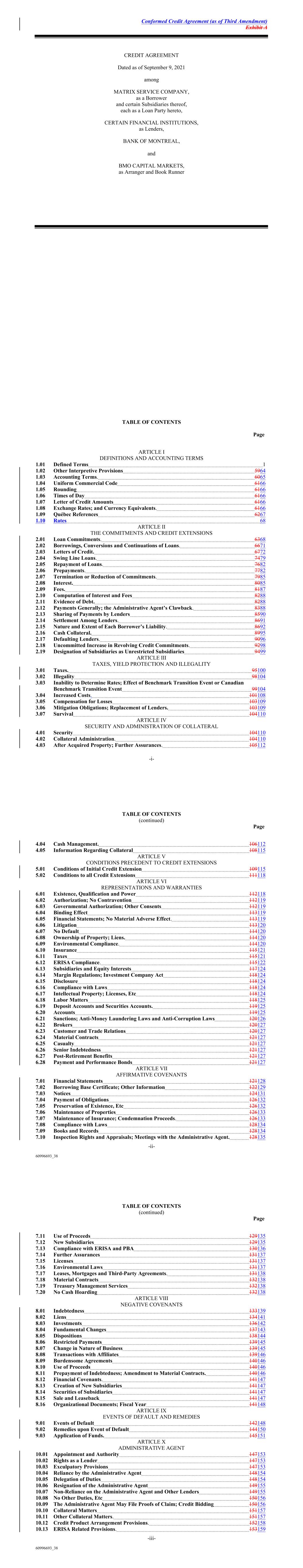 合规信贷协议(截至第三次修订)附件截至2021年9月9日,作为借款人的Matrix Service Company及其若干子公司(各自作为贷款方)、作为贷款人的某些金融机构、作为贷款人的蒙特利尔银行和作为安排者和账簿管理人的信贷协议目录页-i-第一条定义和会计术语1.01定义的术语11.02其他解释性规定59641.03会计术语。60651.04统一商码61661.05四舍五入61661.06日倍61661.07信用证金额61661.08汇率;及货币等价物。61661.09 Qu é bec参考文献62671.10对68第二条承诺和信贷扩展2.01贷款承诺进行评级。63682.02借款、转换及续贷。66712.03信用证。67722.04周转线贷款。74792.05偿还贷款。76822.06预付款项。77822.07终止或减少承诺。79852.08利息。80852.09费用。81872.10利息和费用的计算82882.11债务的证据。82882.12一般付款;行政代理的回拨。83882.13贷款人分担付款85902.14贷款人之间结算。86912.15各借款人责任的性质和程度。86922.16现金抵押品。89952.17违约贷款人。90962.18循环信贷承诺未承诺增加。92982.19将子公司指定为非限制性子公司9499第三条税收、收益保护和违法3.01税收。95 1003.02违法981043.03无法确定费率;基准过渡事件或加拿大基准过渡事件的影响991043.04增加了成本。1011083.05赔偿损失1031093.06缓解义务;更换出借人。1031093.07存续期104110第四条担保与担保物管理4.01担保1041104.02担保物管理。1041104.03收购财产后;进一步保证。105112目录(续)page-ii-60996693 _ 384.04现金管理。1061124.05关于担保品的信息108115第五条信贷展期的先决条件5.01初始信贷展期的条件1091155.02所有信贷展期的条件111118第六条代表和权证6.01存在、资格和权力1121186.02授权;无违反1121196.03政府授权;其他同意1121196.04具有约束力的效力1131196.05财务报表;无重大不利影响。1131196.06诉讼1131206.07无违约1141206.08财产所有权;留置权。1141206.09环境合规。1141206.10保险1151216.11税收1151216.12 ERISA合规。1151226.13子公司和股权1171246.14保证金规定;投资公司法1181246.15披露1181246.16遵守法律1181246.17知识产权;许可证等1181246.18劳动事项1181256.19存款账户和证券账户。1191256.20账户1191256.21制裁;反洗钱法和反腐败法1201266.22经纪人1201276.23客户和贸易关系1201276.24物资合同1211276.25伤亡1211276.26高级负债1211276.27退休后福利金1211276.28付款和履约保证金121127第七条固定契约7.01财务报表1211287.02借款基础证明;其他信息1221297.03通知1241317.04支付义务1261327.05保全存续等1261327.06维护财产1261337.07维护保险;谴责收益。1261337.08遵守法律1281347.09账簿和记录1281347.10检查权和评估;与行政代理人的会议。128135目录(续)page-III-60996693 _ 387.11所得款项用途1291357.12新设子公司1291357.13符合ERISA和PBA 1301367.14进一步保证1311377.15许可1311377.16环境法1311377.17租赁, 抵押和第三方协议。1311387.18物资合同1321387.19资金管理服务1321387.20无现金囤积132138第八条负面契约8.01债务1331398.02留置权1341418.03投资1361428.04基本变化1371438.05处置1381448.06限制性付款1391458.07业务性质变化1391458.08与关联公司的交易1391468.09繁重的协议1401468.10收益的使用1401468.11提前偿还债务;修订物资合同。1401468.12财政契约。1411478.13新设子公司1411478.14子公司证券1411478.15售后回租1411478.16组织文件;会计年度141148第九条违约事件和补救措施9.01违约事件1421489.02违约事件时的补救措施1441509.03申请资金。145151第十条行政代理人10.01任命和授权14715310.02作为出借人的权利14715310.03免责条款14715310.04行政代理人的依赖14815410.05职责的下放14815410.06行政代理人的离职14915510.07不依赖行政代理人和其他出借人14915510.08无其他职责等150156 10.09行政代理人可以提出债权证明;信用招标150156 10.10担保物事项15115710.11其他担保物事项。15115710.12信用产品安排备抵。15215810.13 ERISA相关规定。153159