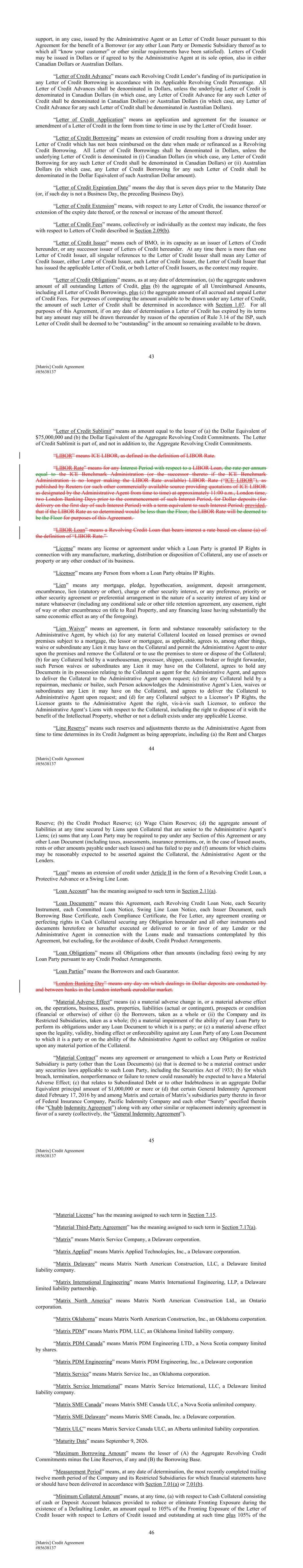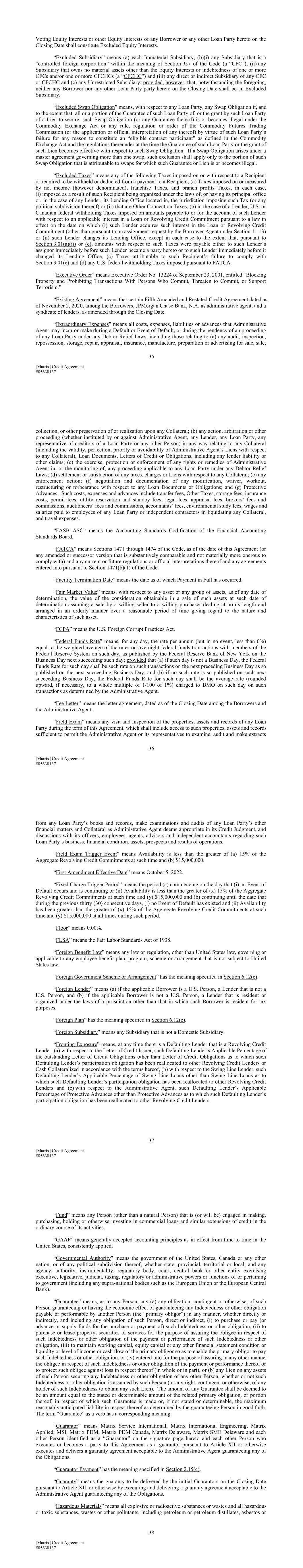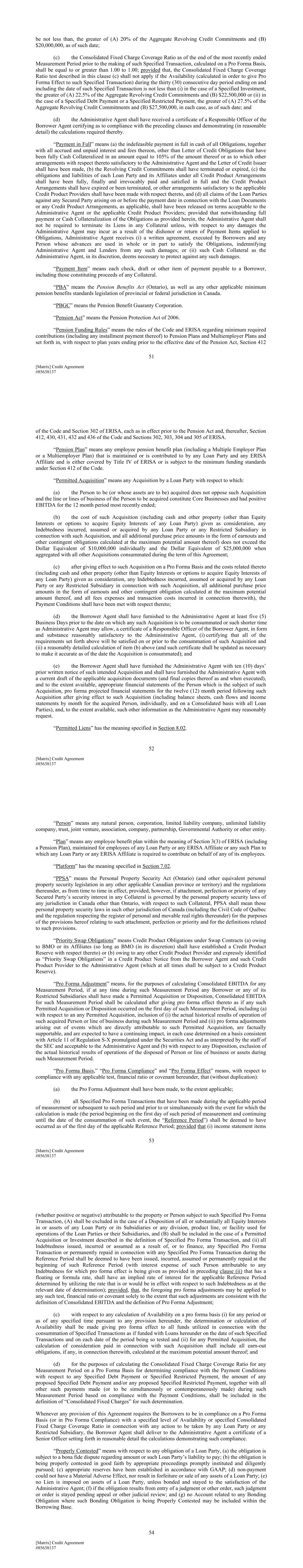 不低于(a)截至该日期的循环信贷承诺总额的20%和(b)20,000,000美元中的较高者;(c)截至作出该指明交易前最近结束的计量期结束时的合并固定费用覆盖率,按备考基准计算,应等于或大于1.00至1.00;但,本条款(c)所述的综合固定费用覆盖率测试,如在截至该指明交易日期(包括该日期)的连续三十(30)天期间内的可用性(为给予该指明交易的形式上的影响而计算)不少于(i)(如属指明投资)(a)总循环信贷承诺的22.5%及(b)22,500,000美元或(ii)(如属指明债务付款或指明受限制付款)中的较高者,则不适用,(a)循环信贷承付款项总额的27.5%和(b)27500000美元(在每种情况下,截至该日期)中的较高者;(d)行政代理人应已收到借款人代理人负责官员的证明,证明遵守上述条款,并证明(在合理的细节上)由此所要求的计算。“全额付款”是指(a)不可撤销地以现金全额支付所有债务,连同所有应计和未支付的利息和费用,但已以相当于其金额105%的金额全额现金抵押的信用证债务或已就此作出行政代理人和信用证发行人满意的其他安排的信用证债务除外,(b)循环信贷承诺已终止或到期,(c)每一贷款方及其关联公司在所有信贷产品安排下的义务和责任应已全部、最终和不可撤销地得到支付和全额清偿,信贷产品安排应已到期或终止,或已就此作出适用的信贷产品提供人满意的其他安排,以及(d)贷款方在付款日期或之前就贷款单证或任何信贷产品安排(如适用)产生的对任何有担保方的所有债权,应已按行政代理人或适用的信贷产品提供者可接受的条款解除;但即使按照本协议的规定全额支付或以现金抵押债务,也不得要求行政代理人终止其在任何抵押品上的留置权,除非就行政代理人可能因适用于债务的支付项目被拒付或退回而招致的任何损害而言,行政代理人收到(i)由借款人和其垫款被全部或部分用于履行债务的任何人签署的书面协议,向行政代理人和贷款人赔偿任何此类损害;或(ii)行政代理人酌情认为有必要保护其免受任何此类损害的现金抵押品。“付款项目”是指应付给借款人的每张支票、汇票或其他付款项目,包括构成任何抵押品收益的项目。“PBA”是指《养老金福利法案》(安大略省),以及加拿大省级或联邦司法管辖区任何其他适用的最低养老金福利标准立法。“PBGC”是指养老金福利担保公司。“养老金法案”是指2006年的《养老金保护法》。“养老金筹资规则”是指《守则》和ERISA中关于养老金计划和多雇主计划的最低要求缴款(包括任何分期付款)的规则,并在《养老金法案》生效日期之前结束的计划年度、《守则》第41251条[矩阵]信贷协议# 85638137和《ERISA》第302条中规定,每一条均在《养老金法案》之前生效,此后,《守则》第412条、430条、431条、432条和436条以及《ERISA》第302条、303条、304条和305条。“养老金计划”是指由任何贷款方和任何ERISA关联机构维持或供款的任何雇员养老金福利计划(包括多雇主计划或多雇主计划),该计划或由ERISA标题IV涵盖,或受《守则》第412条规定的最低资金标准约束。“许可收购”是指贷款方就以下事项进行的任何收购:(a)拟被收购人(或其资产将被收购)不反对此类收购,且拟被收购人的一个或多个业务线构成核心业务,且在最近结束的12个月期间EBITDA为正;(b)作为对价给予的此类收购的成本(包括现金和其他财产(收购任何贷款方股权或期权除外), 任何贷款方或任何受限制附属公司就该等收购而招致、承担或取得的任何债务,以及以收益和其他或有债务形式按其最大潜在金额计算的所有额外购买价格金额)不超过单独的10,000,000美元等值美元和与本协议期限内完成的所有其他收购合并后的25,000,000美元等值美元;(c)在以备考方式实施此类收购以及与此相关的成本(包括作为对价给予的现金和其他财产(股权或收购任何贷款方股权的期权除外)后,产生的任何债务,任何贷款方或任何受限制附属公司就该等收购承担或取得的、以收益形式的所有额外购买价格金额和按其最大潜在金额计算的其他或有债务,以及与此有关的所有费用支出和交易成本),应已满足有关的付款条件;(d)借款人代理人应已在任何该等收购完成之日前至少五(5)个营业日或行政代理人允许的较短时间内向行政代理人提供,借款人代理人负责官员的证明,在形式和实质上均令行政代理人合理满意,(i)证明上述所有要求将在该收购完成时或之前得到满足,以及(ii)对上述(b)项进行合理详细的计算(且该证书应根据需要进行更新,以使其在收购完成之日准确);(e)借款人代理人应已提前十(10)天就该意向收购向行政代理人提供书面通知,并应已向行政代理人提供适用的收购文件的当前草稿(及其在签署时的最终副本),以及在可获得的范围内,作为此类收购标的的人的适当财务报表、在此类收购生效后的此类收购后十二(12)个月期间的备考预计财务报表(包括被收购人的资产负债表、现金流量和损益表,按月单独和与所有贷款方合并),以及在可获得的范围内,行政代理人可能合理要求的其他信息。“许可留置权”具有第8.02条规定的含义。52 [矩阵]信贷协议# 85638137“人”是指任何自然人、公司、有限责任公司、无限责任公司、信托、合资、协会、公司、合伙企业、政府机关或其他实体。“计划”指ERISA第3(3)节含义内的任何员工福利计划(包括养老金计划),为任何贷款方或任何ERISA关联公司的员工维护,或任何