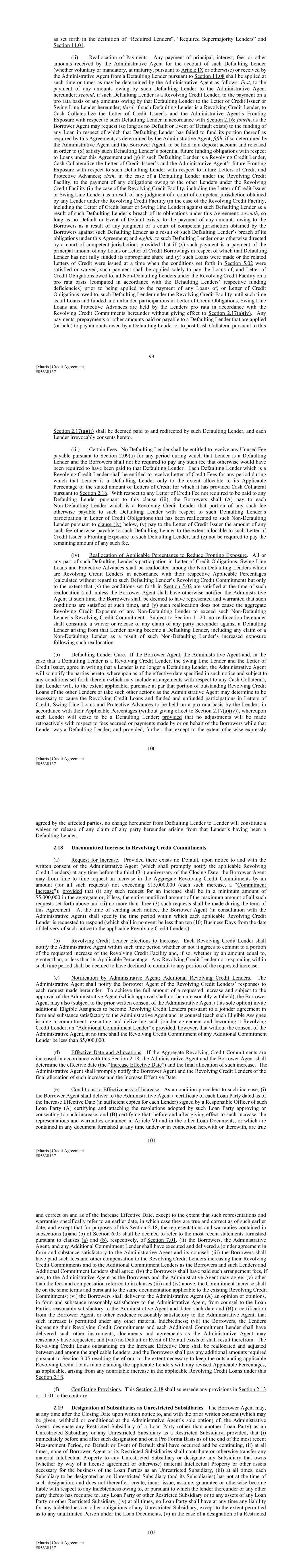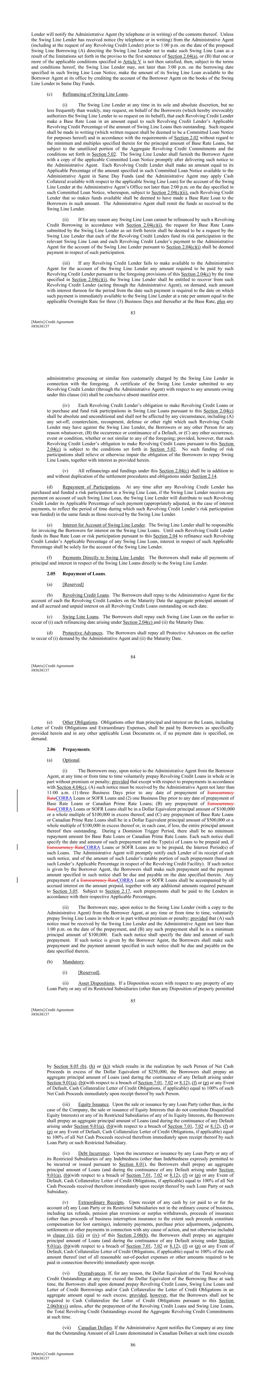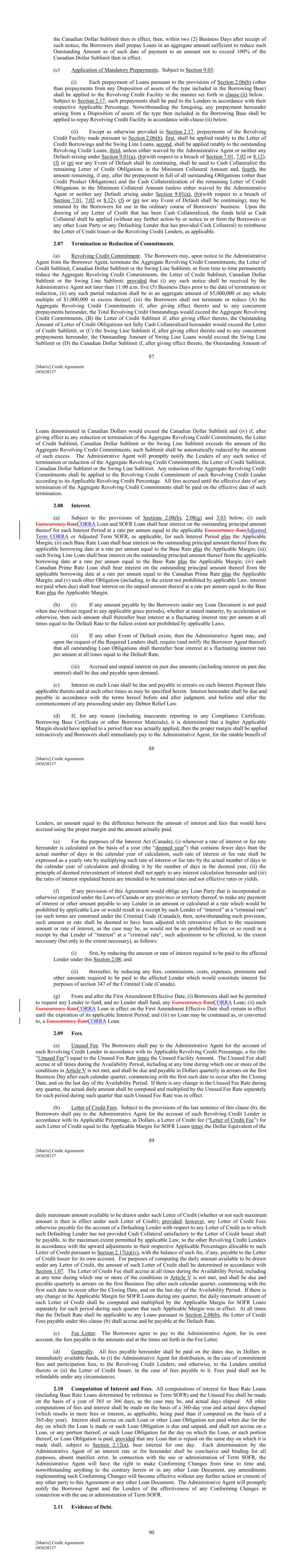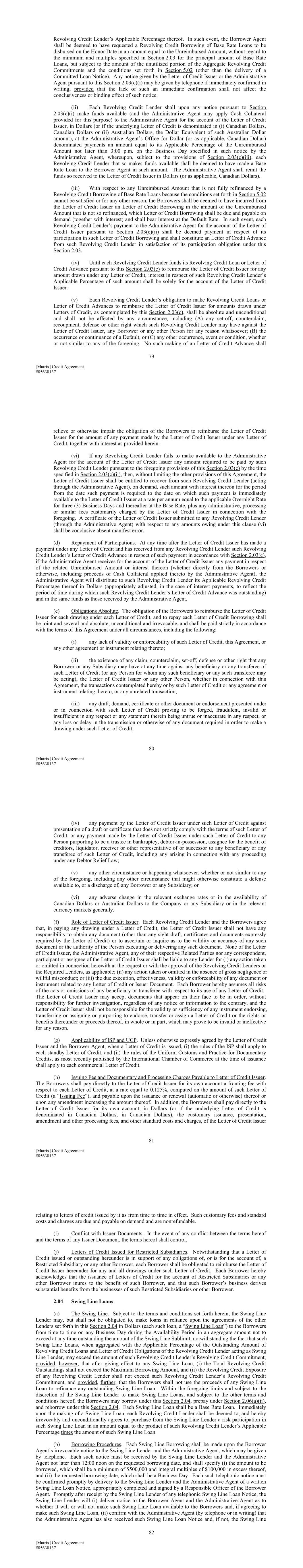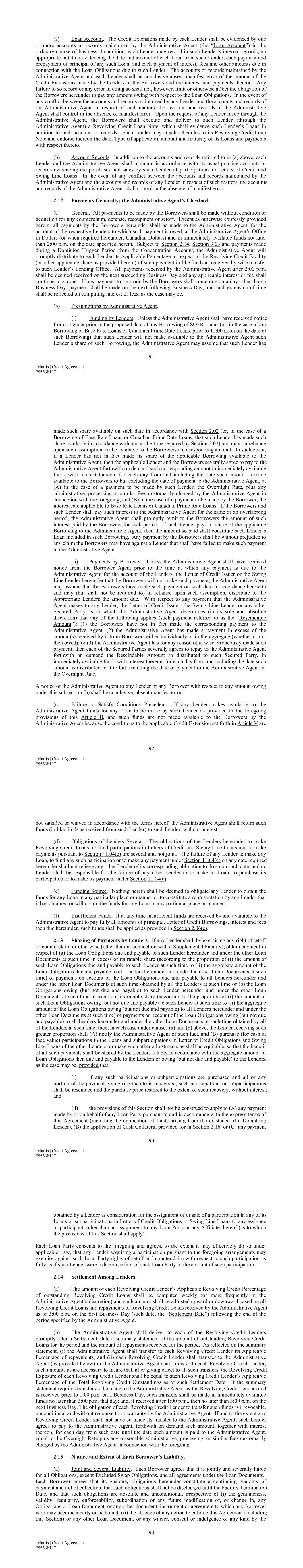 第二条承诺和信贷展期2.01贷款承诺。(a)循环信贷承诺。根据此处规定的条款和条件,每个贷款人各自同意在可用期内不时以美元或加元向借款人提供贷款(每笔此类贷款,“循环信用贷款”),总金额在任何时候均不超过(i)该贷款人的循环信用承诺金额或(ii)该贷款人在借款基础中适用的循环信用百分比中的较低者;但前提是,在任何循环信用借款生效后,立即,(a)循环信贷未偿还总额的等值美元不得超过最高借款金额的等值美元,(b)每个贷款人的循环信贷敞口不得超过该贷款人的循环信贷承诺,以及(c)所有以加元计价的贷款的循环信贷未偿还总额不得超过加元分限额。在此种限额内并在符合本条款其他条款和条件的情况下,借款人可根据本条第2.01(a)款借款,根据第2.06(a)款预付款项,并根据本条第2.01(a)款再借款。(b)[保留]。(c)超支和保护性垫款。(i)超支。(a)如在任何时候,所有贷款的本金余额总额超过最高借款金额(“超额垫款”),则借款人应在(x)行政代理人的要求(可通过电子邮件)和(ii)任何贷款方的任何负责人员知悉该超额垫款中较早者的一个(1)营业日内支付超过的金额。所有超支贷款应构成以担保物为担保的债务,并有权享有贷款单证的一切利益。(b)行政代理人可全权酌情(但绝对没有义务)要求贷款人兑现超额垫款贷款请求,并避免要求适用的借款人纠正超额垫款,只要(a)该超额垫款没有持续超过连续三十(30)天,以及(b)任何时候存在的超额垫款总额连同任何时候未偿还的保护性垫款不超过当时有效的循环信贷承诺的10.0%。即使未满足第5.02节规定的条件,也可能需要超额贷款。在任何情况下均不得要求提前发放会导致循环信贷未偿总额超过循环信贷承诺总额的贷款。被要求的贷款人可以随时通过向行政代理人送达的书面通知,前瞻性地撤销行政代理人向任何或所有借款人提供进一步超额贷款的权力。任何超支贷款的资金或超支的承受不应构成71 [矩阵]信贷协议# 85638137的行政代理人或贷款人放弃由此引起的违约事件。在任何情况下,任何借款人或其他贷款方不得被视为本条2.01(c)的受益人,也不得被授权强制执行其任何条款。(二)保护性进展。(a)行政代理人应由每个借款人和贷款人不时全权酌情授权(但绝对没有义务),代表贷款人向借款人提供基准利率贷款(任何此类贷款在此称为“保护性垫款”),而行政代理人认为这是必要或可取的,以便(a)保全或保护抵押品或其任何部分,或(b)提高可能性或最大限度地提高金额,偿还贷款和其他信贷敞口;但任何保护性垫款不得导致当时的循环信贷未偿还总额超过当时有效的循环信贷承诺总额。行政代理人提供的所有保护性垫款均构成债务,由抵押品担保,在所有用途上均应被视为基准利率贷款。(b)任何时候未偿还的保护性垫款总额不得超过当时有效的循环信贷承诺总额的10.0%,该等保护性垫款连同任何时候存在的超额垫款总额不得超过当时有效的循环信贷承诺总额的10.0%。即使没有满足第5.02节规定的条件,也可以进行保护性垫款。每个贷款人应在可评定的基础上参与每个保护性垫款。被要求的出借人可以随时以书面通知行政代理人的方式撤销行政代理人向任何或所有借款人作出进一步保护性垫款的权力。如果没有这样的撤销, 行政代理人对保护性垫资的认定是适当的,应当是结论性的。在任何时候,如果有足够的可用资金,并且第5.02条规定的先决条件已经满足,行政代理人可以要求贷款人提供贷款,以偿还保护性垫款。在任何其他时间,行政代理人可以要求贷款人为第2.01(c)(二)(c)节所述的风险参与提供资金。(c)在行政代理人作出保护性垫款时(不论是在违约或违约事件发生之前还是之后),每一贷款人应被视为在无追索权或保证的情况下,无条件和不可撤销地向行政代理人购买了该保护性垫款的不可分割权益和参与,该权益和参与该保护性垫款的比例等于该贷款人的总信用敞口占所有贷款人的总信用敞口(其“应评级份额”)的比例。各贷款人应在向行政代理人提出要求时,将该贷款人购买的权益和参与的金额迅速转入(“转入”)该行政代理人可能指定的行政代理人账户,但无论如何不得迟于通知的营业日下午3:00(如行政代理人在下午12:00之前提供通知,则在紧接其后的营业日(“转入日”)另行通知)。转让可能发生在违约或违约事件存在期间,也可能发生在是否满足第5.02节规定的适用先决条件的情况下。转让给行政代理人的这类金额应与适用的保护性垫款金额相对应,并应分别构成这类贷款人的贷款。如任何贷款人未在该转让日将任何该等金额转移至72 [矩阵]信贷协议# 85638137行政代理人,则该行政代理人有权按要求向该贷款人收回该等金额,连同自该款项到期之日起至该款项支付给行政代理人之日止每一天的利息,按隔夜利率三(3)个工作日,其后按基准利率。自任何贷款人被要求提供资金、资金、其在本协议项下购买的任何保护性垫款的权益和参与之日(如有的话)起及之后,行政代理人应立即向该贷款人分配该贷款人就该保护性垫款收到的本金和利息的所有付款以及抵押品的所有收益的应予评定份额。(d)借款基数的确定。借款基础应按以下方式不时建立和调整:(i)借款基础的金额应在借款人代理人根据第7.02(a)节交付给行政代理人的每份借款基础凭证中初步建立。行政代理人有权在截止日及截止日当日及