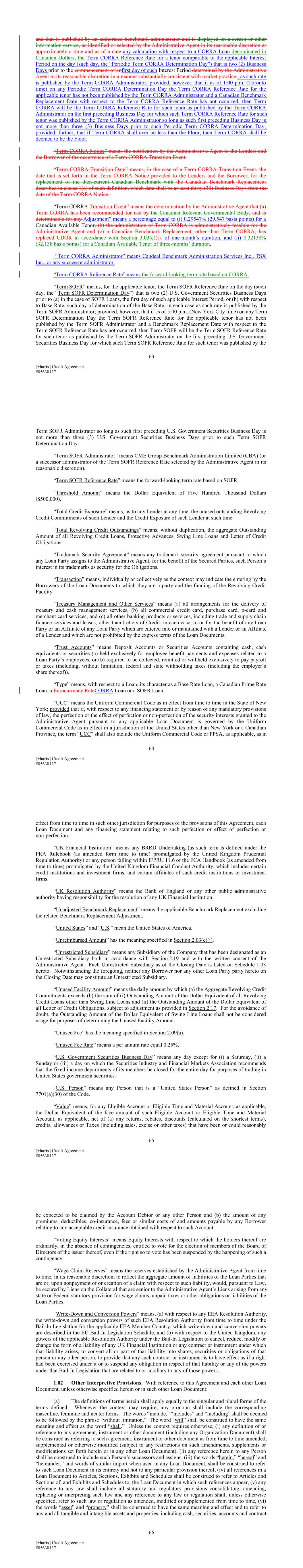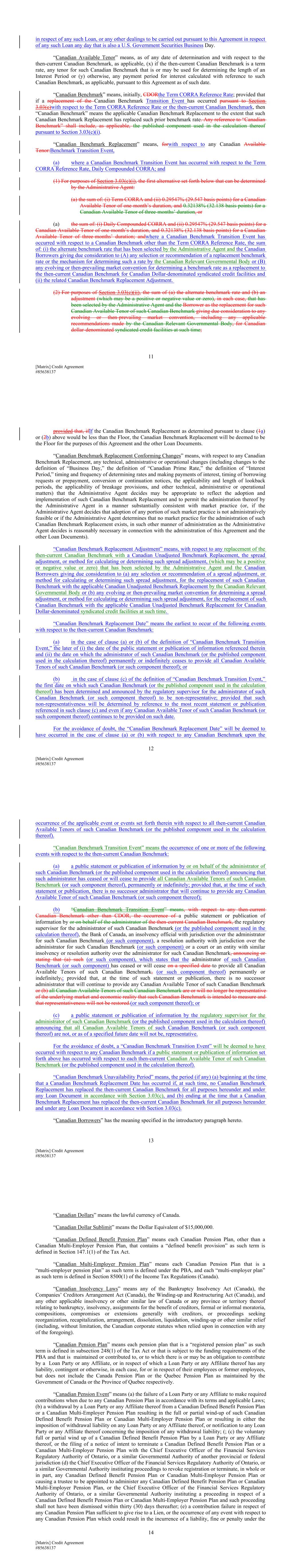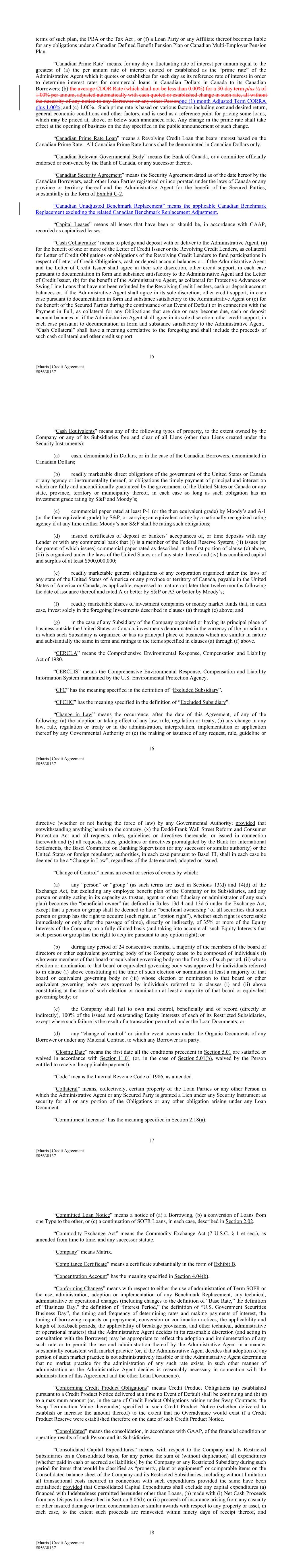以及由获授权基准管理人发布并显示在屏幕或其他信息服务上的信息,由行政代理人在大约某一时间和截至某一日期以加元计价的CORRA贷款的任何计算确定或选择,期限CORRA参考利率相当于当日适用的利息期(该日,“定期期限CORRA确定日”)指行政代理人以其合理酌情权以基本符合市场惯例的方式确定的该利息期的第一天开始前两(2)个工作日,因为该利率由期限CORRA管理人公布;但前提是,如果截至下午1:00(多伦多时间)在任何定期期限CORRA确定日,适用期限的期限CORRA参考利率尚未由期限CORRA管理人公布,并且没有发生关于期限CORRA参考利率的加拿大基准替换日期,则CORRA Term将是CORRA Term Administrator在CORRA Term Administrator公布该期限的CORRA参考利率的前一个工作日公布的该期限的CORRA Term参考利率,只要该前一个工作日不超过该定期期限CORRA确定日前三(3)个工作日;此外,如果CORRA Term应永远低于下限,则CORRA Term应被视为下限。“期限CORRA通知”是指行政代理人向出借人和借款人发出的发生期限CORRA转换事件的通知。“Term CORRA转换日期”是指,在Term CORRA转换事件的情况下,向贷款人和借款人提供的Term CORRA通知中规定的日期,用于用该定义第1(a)条所述的加拿大基准替换当时当前的加拿大基准,该日期应为自Term CORRA通知之日起至少三十(30)个工作日。“Term CORRA过渡事件”是指行政代理人确定(a)Term CORRA已被推荐给加拿大相关政府机构使用,并且可对任何调整进行确定”是指等于(i)加拿大可用期限的0.29547%(29.547个基点)的百分比,(b)Term CORRA的管理对行政代理人而言在行政上是可行的,以及(c)除Term CORRA之外的加拿大基准更替已根据第3.03(c)(i)节替换了1个月期限的CDOR,以及(ii)0.32 138%(32.138个基点)加拿大可用期限为三个月期限。“术语CORRA管理员”是指Candeal Benchmark Administration Services Inc.、TSX Inc.或任何继任管理员。“期限CORRA参考利率”是指基于CORRA的前瞻性期限利率。“Term SOFR”就适用期限而言是指(a)在SOFR贷款的情况下,在(a)前两(2)个美国政府证券营业日(“Term SOFR确定日”)的Term SOFR参考利率,该适用利息期的第一天,或(b)就基准利率而言,基准利率的确定日,在每种情况下,该利率由Term SOFR管理员公布;但是,前提是,如果截至任何期限SOFR确定日下午5:00(纽约市时间),期限SOFR管理人尚未公布适用期限的期限SOFR参考利率,也没有发生关于期限SOFR参考利率的基准替换日期,然后,Term SOFR将是Term SOFR Administrator在63 [ Matrix ] Credit Agreement # 85638137 Term SOFR Administrator发布的该期限SOFR参考利率的前第一个美国政府证券营业日发布的该期限SOFR参考利率,只要该前第一个美国政府证券营业日不超过该期限SOFR确定日前三(3)个美国政府证券营业日。“任期SOFR管理人”是指芝加哥商品交易所 BenchMark Administration Limited(CBA)(或由行政代理人合理酌情选择的任期SOFR参考利率的继任管理人)。“期限SOFR参考利率”是指基于SOFR的前瞻性期限利率。“门槛金额”是指相当于五十万美元(50万美元)的美元。“总信用敞口”是指,对于任何贷款人在任何时间,该贷款人未使用的未偿还循环信贷承诺以及该贷款人在该时间的信用敞口。“循环信贷未偿总额”是指,不重复,所有循环信贷未偿总额、保护性垫款、 周转额度贷款和信用证义务。“商标担保协议”是指任何贷款方为担保方的利益向行政代理人转让该人在其商标中的权益作为债务担保的任何商标担保协议。“交易”是指单独或集体作为上下文可能表明借款人输入其作为当事方的贷款文件以及循环信贷融资的资金。“金库管理及其他服务”是指(a)交付金库和现金管理服务的所有安排,(b)所有商业信用卡、采购卡、p卡和商户卡服务;(c)在每种情况下,向任何贷款方或任何贷款方的关联公司订立或维持且不受贷款文件明文条款禁止的所有其他银行产品或服务,包括贸易和供应链金融服务和租赁,但信用证除外。“信托账户”是指存款账户或证券账户,其中包含现金、现金等价物或证券(a)专为雇员福利付款和与贷款方雇员相关的费用而持有,或(b)专为支付工资或税款(包括但不限于联邦和州预扣税(包括雇主的份额)而需要收取、汇出或扣缴的款项。“类型”是指,就贷款而言,其性质为基本利率贷款、加拿大最优惠利率贷款、欧洲货币利率CORRA贷款或SOFR贷款。“UCC”是指在纽约州不时生效的统一商法典;条件是,如果就任何融资报表而言,或由于任何强制性法律规定,根据任何适用的贷款文件授予行政代理人的担保权益的完善性或完善性或非完善性的效果受在除纽约州或加拿大省以外的美国司法管辖区有效的统一商法典管辖,“UCC”一词还应包括统一商法典或PPSA,如适用,如64 [ Matrix ]信贷协议# 85638137中所述,就本协议的规定而言,每份贷款文件和与此种完善或完善或不完善的效果有关的任何融资报表在该等其他司法管辖区不时生效。“英国金融机构”是指任何BRRD承诺(该术语在英国审慎监管局颁布的《PRA规则手册》(不时修订的表格)下定义)或属于英国金融行为监管局颁布的《FCA手册》(不时修订的)IFPRU 11.6范围内的任何人,其中包括某些信贷机构和投资公司,以及此类信贷机构或投资公司的某些关联公司。“英国决议当局”是指英国央行或任何其他公共行政当局,对任何英国金融机构的决议负有责任。“未调整基准更换”是指不包括相关基准更换调整的适用