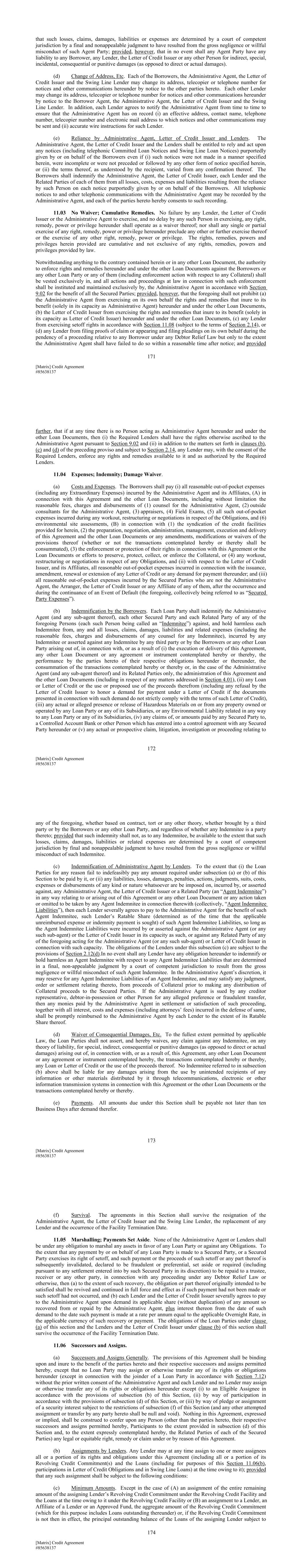 此类损失、索赔、损害赔偿、责任或费用由有管辖权的法院通过最终且不可上诉的判决确定为该代理方的重大过失或故意不当行为所致;但条件是,在任何情况下,任何代理方均不得就间接、特殊、附带、后果性或惩罚性损害(而不是直接或实际损害)对任何借款人、任何贷款人、信用证发行人或任何其他人承担任何责任。(d)地址变更等。借款人、行政代理人、信用证发行人和周转额度贷款人各自可通过向协议其他方发出通知的方式变更其地址、电传复印机或本协议项下通知及其他通信的电话号码。其他出借人可以向借款人代理人、行政代理人、信用证发行人和周转额度出借人发出通知的方式变更其地址、电传复印机或本协议项下通知及其他通信的电话号码。此外,每个贷款人同意不时通知行政代理人,以确保行政代理人有记录在案的(i)可以发送通知和其他通信的有效地址、联系人姓名、电话号码、电传复印号码和电子邮件地址,以及(ii)为此类贷款人提供准确的电汇指示。(e)行政代理人、信用证发行人和贷款人的依赖。行政代理人、信用证发行人和贷款人有权依赖借款人或其代表所发出的任何通知(包括电话承诺贷款通知和周转额度贷款通知)并根据其行事,即使(i)该等通知并非以本协议规定的方式作出、不完整或在本协议规定的任何其他形式通知之前或之后没有,或(ii)其条款(如收件人所理解,与任何确认有关的内容不同)。借款人应赔偿行政代理人、信用证开证人、各贷款人及其各自的关联方因该人依赖借款人声称或代表借款人发出的每一份通知而产生的一切损失、成本、费用和责任。向行政代理人发出的所有电话通知以及与行政代理人进行的其他电话通信,均可由行政代理人进行记录,本合同各方当事人在此同意进行记录。11.03不放弃;累计补救。任何贷款人、信用证发行人或行政代理人未行使,以及任何该等人在行使本协议项下的任何权利、补救措施、权力或特权时未有延误,均不得作为放弃行使本协议项下的任何权利、补救措施、权力或特权而运作;亦不得因任何单一或部分行使本协议项下的任何权利、补救措施、权力或特权而排除任何其他或进一步行使或任何其他权利、补救措施、权力或特权的行使。本文提供的权利、救济、权力和特权是累积的,不排斥法律规定的任何权利、救济、权力和特权。尽管本协议或任何其他贷款文件中有任何相反的规定,对借款人或任何其他贷款方或其中任何一方强制执行本协议项下和其他贷款文件项下的权利和补救措施(包括与任何抵押品有关的强制执行行动)的权力应完全归属于该行政代理人,与此种强制执行有关的所有诉讼和法律程序应完全由该行政代理人根据第9.02条为所有有担保当事人的利益提起和维持;但是,条件是,前述并不禁止(a)行政代理人根据本协议和其他贷款单证(仅以其作为行政代理人的身份)自行行使对其有利的权利和补救措施,(b)信用证发行人根据本协议和其他贷款单证(仅以其作为信用证发行人的身份)行使对其有利的权利和补救措施,(c)任何贷款人根据第11.08条(以第2.14条的条款为准)行使抵销权,或(d)任何贷款人在根据任何债务人救济法与任何借款人有关的程序待决期间,但仅限于行政代理人在收到通知后的合理时间内未这样做的情况下,从提交债权证明或出庭并代表自己提交书状;并进一步规定171 [ Matrix ]信贷协议# 85638137,如果在任何时候没有人根据本协议和其他贷款文件担任行政代理人,则(i)除前项但书(b)、(c)及(d)条所列事宜外,规定贷款人除拥有根据第9.02及(ii)条以其他方式赋予行政代理人的权利外,在符合第2.14条的规定下,任何贷款人可在规定贷款人同意下, 强制执行其可利用的任何权利和补救措施,并按所需贷款人的授权执行。11.04费用;赔偿;损害免责。(a)成本和费用。借款人应支付(i)行政代理人及其附属机构发生的所有合理自付费用(包括任何非常费用),(a)与本协议和其他贷款文件有关的费用,包括但不限于(1)行政代理人的法律顾问,(2)行政代理人的外部顾问,(3)评估师,(4)实地考试,(5)在与义务有关的任何锻炼、重组或谈判期间发生的所有此类自付费用,以及(6)环境场地评估,(b)与(1)本协议规定的信贷便利的银团有关的费用,(2)本协议和其他贷款文件的编制、谈判、管理、执行和交付或对其条款的任何修改、修改或放弃(无论是否在此或由此设想的交易应予完成),(3)其与本协议或贷款文件有关的权利的强制执行或保护,或为保全、保护、收集或强制执行担保物所作的努力,或(4)与任何义务有关的任何解决、重组或谈判,以及(ii)就信用证发行人及其附属公司而言,与任何信用证的签发、修订、续期或延期或根据该信用证提出的任何付款要求有关的所有合理自付费用;及(iii)非行政代理人、安排人、信用证发行人或其中任何一方的任何关联人的有担保当事人在违约事件发生后和在违约事件持续期间发生的所有合理自付费用(上述,统称“有担保当事人费用”)。(b)借款人的赔偿。各贷款方应向上述任何一人的行政代理人(及其任何次级代理人)、彼此担保方和每一关联方(每一此类人被称为“受偿人”)作出赔偿,并使每一受偿方免受任何受偿方因任何第三方或借款人或任何其他贷款方因以下原因而产生的任何和所有损失、索赔、损害、责任和相关费用(包括任何大律师