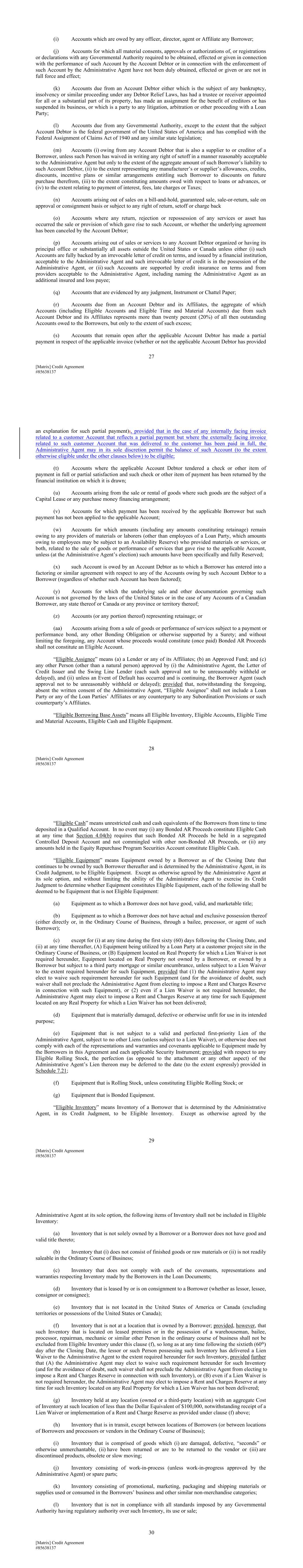 (i)任何高级人员、董事、代理人或附属任何借款人所欠的帐目;(j)与帐户债务人履行该帐目或与行政代理人强制执行该帐目有关而须取得、生效或给予的所有重要同意、批准或授权,或向任何政府当局作出的登记或声明的帐目,尚未妥为取得、生效或给予,或并不具有完全的效力和效力;(k)作为任何破产标的的帐户债务人所欠的帐目,任何债务人救济法规定的破产或类似程序,为其全部或大部分财产指定了受托人或接管人,为债权人的利益进行了转让或暂停了其业务,或是与贷款方的任何诉讼、仲裁或其他程序的一方;(l)应收任何政府当局的账款,除非标的账户债务人是美利坚合众国联邦政府,并遵守了1940年《联邦债权转让法》和任何类似的州立法;(m)账户(i)从同时也是借款人的供应商或债权人的任何账户债务人欠下的款项,除非该人以行政代理人合理接受的方式书面放弃任何抵销权,但仅限于该借款人对该账户债务人的赔偿责任总额,(ii)在代表任何制造商或供应商的津贴、信贷、折扣、奖励计划或类似安排的范围内,使该借款人有权在未来从中购买时获得折扣,(iii)在构成与贷款或垫款有关的欠款的范围内,或(iv)在与支付利息、费用、滞纳金或税款有关的范围内;(n)因以票据持有方式销售、保证销售、销售或退货、按批准或托运方式销售或受任何退货、抵销或退款权利约束的情况下产生的账户(o)任何退货的账户,拒绝或收回产生该账户的任何服务或资产,或基础协议是否已被账户债务人取消;(p)因向任何有组织或有其主要办事处或在美国或加拿大境外的几乎所有资产的账户债务人的销售或服务而产生的账户,除非(i)该等账户有按条款提供的不可撤销信用证完全支持,并由金融机构签发,行政代理人可接受,且该不可撤销信用证由行政代理人管有,或(ii)该等账户按行政代理人可接受的条款和提供者提供信用保险支持,包括指定该行政代理人为额外的被保险人和损失受款人;(q)有任何判决、文书或动产票据证明的账户;(r)账户债务人及其关联公司应收的账户,该账户债务人及其关联机构应收账款(包括合格账户和合格时间和材料账户)的总和占当时欠借款人的所有未偿账户的百分之二十(20%)以上,但仅限于该超额部分;(s)在适用账户债务人就适用发票进行部分付款后仍未开立的账户(无论适用账户债务人是否已就该部分付款提供27 [矩阵]信贷协议# 85638137的解释);,前提是在与客户账户相关的任何内部对开发票反映部分付款但已交付给客户的与该客户账户相关的外部对开发票已全额付款的情况下,行政代理人可全权酌情准许该账户的余额(在以下其他条款另有资格的范围内)符合资格;(t)适用账户债务人以全额或部分清偿方式提出支票或其他付款项目的账户及该支票或其他付款项目已由提取该支票或其他付款项目的金融机构退回;(u)在该等货物是资本租赁或任何购置款融资安排标的的情况下,因销售或出租货物而产生的账户;(v)适用的借款人已收到付款但该等付款未应用于适用账户的账户;(w)仍欠任何材料提供者或劳动者(贷款方的雇员除外)的款项(包括构成保留的任何金额)的账户,欠雇员的款项可能受制于可用性准备金)谁提供了与产生适用账户的商品销售或服务履行有关的材料或服务,或两者兼而有之, 除非(经行政代理人选择)已具体和全额保留该等金额;(x)该账户债务人所欠该账户,借款人已就该账户债务人欠借款人的任何账户订立保理或类似协议(无论该账户是否已保理);(y)该账户的基础销售和管辖该账户的其他文件不受美国法律管辖的账户,或就加拿大借款人的任何账户而言,其任何州或加拿大或其任何省或地区;(z)代表保留金的账户(或其任何部分);或(aa)受付款或履约保证金、任何其他担保义务或由担保人以其他方式支持的货物销售或服务履行所产生的账户;在不限制前述规定的情况下,其收益将构成(一旦支付)保税AR收益的任何账户均不构成合格账户。“合资格受让人”是指(a)贷款人或其任何关联机构;(b)经批准的基金;(c)经(i)行政代理人、信用证发行人和周转额度贷款人批准的任何其他人(自然人除外)(每一项此类批准不得被无理拒绝或延迟),以及(ii)除非违约事件已经发生并仍在继续,借款人代理人(该批准不得被无理拒绝或延迟);但尽管有上述规定,未经行政代理人书面同意,“合资格受让人”不包括贷款方或任何贷款方的关联公司或任何从属条款的任何交易对手或该交易对手的关联公司。“合格借款基础资产”是指所有符合条件的存货、符合条件的账户、符合条件的时间和物资账户、符合条件的现金和符合条件的设备。28 [矩阵]信贷协议# 85638137“合格现金”是指借款人不时存入合格账户的非限制性现金及现金等价物。在任何情况下,不得(i)在第4.04(b)节要求此类保税AR收益存放在单独的受控存款账户中且不与其他非保税AR收益混合的任何时间,(i)任何保税AR收益构成合格现金,或(ii)在股权回购计划证券账户中持有的任何金额构成合格现金。“合格设备”是指借款人在截止日期拥有的设备,此后继续由该借款人拥有,并由行政代理人在其信用判断中确定为合格设备。除行政代理人自行选择另有约定外,在不限制行政代理人行使信用判断确定设备是否构成合格设备的能力的情况下,下列各项均应视为不属于合格设备的设备:(a)借款人不具有良好、有效、