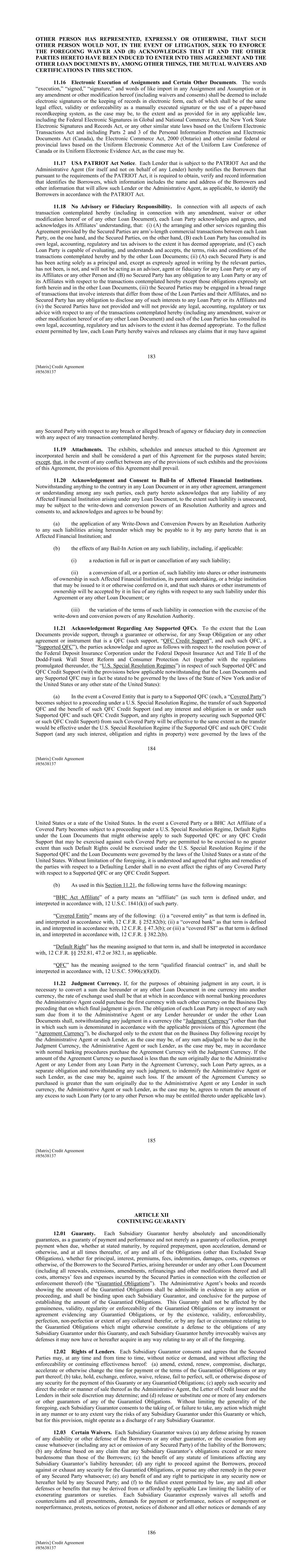 另一人已明示或以其他方式表示,在发生诉讼的情况下,该另一人不会寻求强制执行上述豁免,并且(b)承认,除其他外,该另一方已通过本节中的相互豁免和证明等方式促使其与此处的其他各方订立本协议和其他贷款文件。11.16转让和某些其他文件的电子执行。“执行”、“签名”、“签名”等字样以及在任何转让和假设中或在本协议的任何修订或其他修改(包括放弃和同意)中具有相同重要性的词语,均应被视为包括电子签名或以电子形式保存记录,每一项均应在任何适用法律(包括《全球联邦电子签名法》和《国家商务法案》等法律规定的范围内并按情况与人工签署或使用纸质记录保存系统(视情况而定)具有相同的法律效力、有效性或可执行性,纽约州电子签名和记录法,或基于统一电子交易法并包括《个人信息保护和电子文件法》第2和第3部分(加拿大)、《2000年电子商务法》(安大略省)的任何其他类似州法律,以及基于加拿大统一法律会议的《统一电子商务法》或其《统一电子证据法》(视情况而定)的其他类似联邦或省级法律。11.17美国爱国者法案通知。受《爱国者法案》约束的每个贷款人和行政代理人(为自己而不是代表任何贷款人)特此通知借款人,根据《爱国者法案》的要求,它需要获得、核实和记录识别借款人的信息,这些信息包括借款人的姓名和地址以及允许此类贷款人或适用的行政代理人根据《爱国者法案》识别借款人的其他信息。11.18不承担咨询或信托责任。就本协议所设想的每项交易的所有方面(包括与本协议或任何其他贷款文件的任何修订、放弃或其他修改有关)而言,每一贷款方承认并同意,并承认其关联公司的理解:(i)(a)担保方提供的有关本协议的安排和其他服务一方面是各贷款方与担保方之间的公平商业交易,另一方面,(b)各贷款方在其认为适当的范围内咨询了其自己的法律、会计、监管和税务顾问,(c)每一贷款方有能力评估、理解和接受特此设想的交易的条款、风险和条件以及其他贷款文件;(ii)(a)每一有担保方现在和一直仅作为委托人行事,除非有关各方以书面明确约定,否则过去没有、现在没有、将来也不会作为顾问行事,任何贷款方或其任何关联公司或任何其他人的代理人或受托人,以及(b)除本文和其他贷款文件中明确规定的义务外,任何有担保方均不对任何贷款方或其任何关联公司就本协议所设想的交易承担任何义务,(iii)有担保方可能参与涉及与贷款方及其关联公司的利益不同的广泛交易,任何有担保方均无义务向任何贷款方或其关联公司披露任何此类权益,并且(iv)有担保方没有也不会就本协议所设想的任何交易(包括本协议或任何其他贷款文件的任何修订、放弃或其他修改)提供任何法律、会计、监管或税务建议,并且每一贷款方均在其认为适当的范围内咨询了其自己的法律、会计、监管和税务顾问。在法律允许的最大范围内,每一贷款方特此放弃并解除其可能对183 [ Matrix ]信贷协议# 85638137任何有担保方就与本协议所设想的任何交易的任何方面有关的任何违约或涉嫌违反代理或信托义务而拥有的任何债权。11.19附件。本协议所附的展品、附表和附件均纳入本协议,并应被视为本协议的一部分,用于本协议所述目的;但如此类展品的任何条款与本协议的条款发生冲突,则以本协议的条款为准。11.20受影响的金融机构的保释金和同意书。尽管在任何贷款文件或任何其他协议中有任何相反的规定, 任何此类各方之间的安排或谅解,本协议各方均承认,任何受影响的金融机构在任何贷款文件下产生的任何负债,只要该负债是无担保的,可能会受到解决机构的减记和转换权力的约束,并同意并同意,并承认并同意受以下约束:(a)解决机构对根据本协议产生的任何此类负债适用任何减记和转换权,而这些负债可能由作为受影响金融机构的任何一方支付给它;(b)任何保释诉讼对任何此类负债的影响,包括(如适用):(i)全部或部分减少或取消任何此类负债;(ii)将此类负债的全部或部分转换为该受影响金融机构及其母公司的股份或所有权的其他工具,或可能向其发行或以其他方式授予其的过桥机构,且该等股份或其他所有权文书将由其接受,以代替与本协议或任何其他贷款文件项下的任何该等责任有关的任何权利;或(iii)就行使任何处置当局的减记和转换权力而更改该等责任的条款。11.21关于任何受支持的QFII的致谢。如果贷款文件通过担保或其他方式为属于QFC的任何掉期义务或任何其他协议或工具提供支持(此类支持,“QFC信用支持”,以及每个此类QFC,“支持的QFC”),则各方就联邦存款保险公司根据《联邦存款保险法》和《多德-弗兰克华尔街改革和消费者保护法》第二章(连同根据该法案颁布的条例,“美国特别决议制度”)就此类受支持的QFC和QFC信贷支持(尽管贷款文件和任何受支持的QFC实际上可能被声明受纽约州和/或美国或美国任何其他州的法律管辖,但仍适用以下条款):(a)如果作为受支持的QFC缔约方的涵盖实体(各自称为“被覆盖方”)成为根据美国特别决议制度进行的程序的主体,此类受支持的QFC的转让和此类QFC信用支持的利益(以及此类受支持的QFC和此类QFC信用支持中或项下的任何利益和义务,以及为此类受支持的QFC或此类QFC信用支持提供担保的财产上的任何权利)将在同等程度上有效,因为如果受支持的QFC和此类QFC信用支持(以