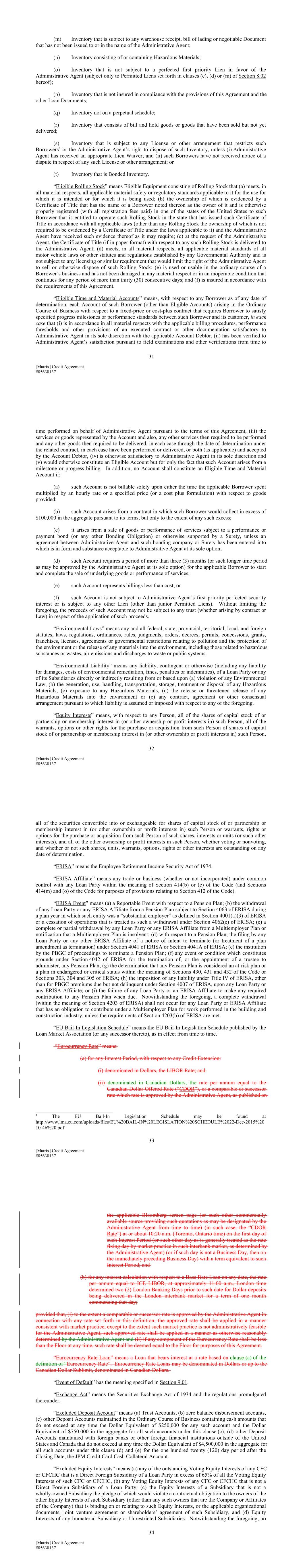 (m)受未签发给行政代理人或以其名义签发的任何仓单、提单或可转让单证约束的库存品;(n)由或含有危险材料的库存品;(o)不受有利于行政代理人的完善的第一优先留置权约束的库存品(仅受(c)条规定的许可留置权约束,(d)或(m)本协议第8.02条);(p)未按照本协议和其他贷款单证的规定投保的库存品;(q)不按永久时间表的库存品;(r)由已售出但尚未交付的票据和持有货物或货物组成的库存品;(s)受任何许可或其他安排约束的库存品,这些许可证或安排限制了此类借款人或行政代理人处置此类库存品的权利,除非(i)行政代理人已收到适当的留置权豁免;及(ii)该等借款人未收到与任何该等许可或其他安排有关的争议通知;或(t)库存即保税库存。“合格机车车辆”是指由(a)在所有重大方面满足的机车车辆组成的合格设备,适用于它的所有适用的材料安全或监管标准,适用于它打算用于或正在使用它的用途;(b)其所有权由一份所有权证书证明,该证书上注明借款人的名称是它的所有者,并且在美国的一个州以其他方式向有权在该州运营此类机车车辆的借款人进行了适当注册(已支付所有注册费)已根据所有适用法律(根据适用法律,其所有权无须以所有权证书作为证明的任何机车车辆除外)签发该所有权证书,而行政代理人已收到其可能要求的有关证据;(c)应行政代理人的要求,将任何该等机车车辆的所有权证书(如以纸质形式)交付给行政代理人;(d)在所有重大方面符合,所有机动车辆法律或任何政府当局制定的其他法规和条例的所有适用的材料标准,不受任何许可或类似要求的限制,这些要求会限制行政代理人出售或以其他方式处置此类机车车辆的权利;(e)在借款人的正常业务过程中使用或可用,并且没有在任何重大方面受到损害或处于持续超过连续三十(30)天的任何时期的不可操作状态;(f)按照本协议的要求投保。“合格时间和材料账户”是指,就截至任何确定日期的任何借款人而言,该借款人的每个账户(合格账户除外)在正常业务过程中产生的固定价格或成本加成合同要求借款人满足该借款人与其客户之间指定的进度里程碑或绩效标准,在每种情况下,(i)在所有重大方面均符合适用的账单程序,行政代理人全权酌情与适用的账户债务人达成的已执行合同或其他文件的履约门槛和其他规定,(ii)已根据实地检查和其他核查得到行政代理人满意的验证,并在31 [矩阵]信贷协议# 85638137时间内根据本协议的条款代表行政代理人履行,(iii)该账户所代表的服务或货物,以及当时要求履行的任何其他服务和当时要求交付的任何其他货物,在每一种情况下直至相关合同下的确定日期,在每一种情况下,已履行或交付,或两者(如适用)并被账户债务人接受,(iv)在其他方面令行政代理人全权酌情满意,以及(v)否则将构成合格账户,但仅限于该账户产生于里程碑或进度账单这一事实。此外,在以下情况下,任何账户均不构成合格的时间和物资账户:(a)该账户不能仅根据适用的借款人所花费的时间乘以每小时费率或就所提供的货物规定的价格(或成本加成的提法)进行结算;(b)该账户产生于一份合同,在该合同中,该借款人将根据其条款收取总额超过100,000美元,但仅限于任何此类超额的范围;(c)它产生于受履约或付款保证金(或任何其他担保义务)或由担保人以其他方式支持的货物销售或服务履行, 除非行政代理人与该担保公司或担保人订立的协议在形式和实质上是行政代理人可自行选择接受的;(d)该账户要求适用的借款人有三(3)个月以上的期限(或行政代理人自行选择批准的较长期限)开始并完成基础货物的销售或服务的履行;(e)该账户代表低于成本的账单;或(f)该账户不受行政代理人的第一优先权完善担保权益或受任何其他留置权(初级许可留置权除外)的约束。在不限制前述规定的情况下,此类账户的收益可能不会因此类收益的应用而受到任何信托(无论是合同或法律产生的)的约束。“环境法”是指任何和所有联邦、州、省、地区、地方和外国法规、法律、法规、条例、规则、判决、命令、法令、许可、特许权、赠款、特许、许可、协议或政府限制与污染和环境保护或向环境释放任何材料有关,包括与有害物质或废物、空气排放和向废物或公共系统排放有关的限制。“环境责任”是指贷款方或其任何子公司因(a)违反任何环境法、(b)产生、使用、处理、运输、储存、处理或处置任何危险材料、(c)接触任何危险材料、(d)向环境中释放或威胁释放任何危险材料或(e)任何合同而直接或间接产生的任何或有的或其他责任(包括对损害、环境补救费用、罚款、处罚或赔偿的任何责任),协议或其他双方同意的安排,据此对上述任何一项承担或施加责任。“股权权益”是指,就任何人而言,该人的全部股本股份或合伙或成员权益(或其其他所有权或利润权益)、向该人购买或取得该人的股本股份或合伙或成员权益(或其其他所有权或利润权益)的所有认股权证、期权或其他权利,32 [ Matrix ]信贷协议# 8563813733 [ Matrix ]信贷协议# 85638137所有可转换为或可交换为该人的股本股份或合伙或成员权益(或其他所有权或利润权益)的证券或认股权证、向该人购买或收购该等股份、权益或单位(或该等其他权益)的权利或期权,以及该人的所有其他所有权或利润权益,无论是否有投票权或无投票权,以及该等股份、单位、认股权证、期权
