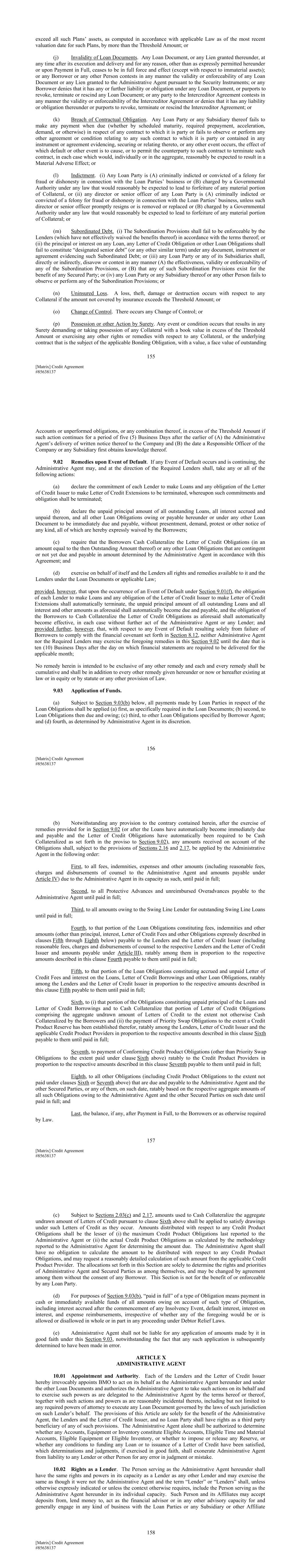 超过所有此类计划的资产(根据适用法律计算,截至此类计划的最近估值日)超过阈值金额;或(j)贷款文件无效。任何贷款文件,或根据该文件所授出的任何留置权,在其签立及交付后的任何时间,并因任何理由(根据本协议明示准许或在全额付款时除外)而停止具有完全效力及效力(非物质资产除外);或任何借款人或任何其他人以任何方式对根据担保文书授予行政代理人的任何贷款文件或任何留置权的有效性或可执行性提出异议;或任何借款人否认其根据任何贷款文件承担任何或进一步的责任或义务,或意图撤销,终止或解除任何贷款文件;或债权人间协议的任何一方以任何方式对债权人间协议的有效性或可执行性提出异议,或否认其在协议项下承担任何责任或义务或意图撤销、终止或解除债权人间协议;或(k)违反合同义务。任何贷款方或其任何附属公司未能就其作为当事方的任何合同在到期时(无论是通过预定到期日、要求提前还款、加速还款、要求还款或其他方式)支付任何款项,或未能遵守或履行与其作为当事方的任何此类合同有关的任何其他协议或条件,或未遵守或履行与其作为当事方的任何证明、担保或与此相关的任何文书或协议所载的任何其他协议或条件,或发生任何违约或其他事件将导致的后果,或允许该合同的对应方终止该合同,在每个案件中,单独或总体上,合理地预期会导致重大不利影响;或(l)起诉。(i)任何贷款方(a)因与贷款方的业务有关的欺诈或不诚实行为被刑事起诉或定罪,或(b)政府当局根据合理预期会导致抵押品的任何重要部分被没收的任何法律提出指控,或(ii)任何贷款方的任何董事或高级管理人员(a)因与贷款方的业务有关的欺诈或不诚实行为被刑事起诉或定罪,除非该董事或高级人员迅速辞职或被免职或撤换,或(b)根据任何法律被政府当局指控,而该法律将合理地预期会导致抵押品的任何重要部分被没收;或(m)次级债务。(i)放款人(未有效放弃其利益)不能按照其条款强制执行从属条款;或(ii)任何贷款、任何信用证义务或其他贷款义务的本金或利息不能构成证明该次级债务的任何文件、文书或协议项下的“指定优先债务”(或任何其他类似条款);或(iii)任何贷款方或其任何附属公司应以任何方式直接或间接否认或质疑(a)任何从属条款的有效性、有效性或可执行性,或(b)任何该等从属条款是为任何有担保方的利益而存在的;或(iv)任何贷款方或其任何附属公司或任何其他人未遵守或履行任何从属条款;或(n)未投保的损失。如果保险未涵盖的金额超过阈值金额,则任何抵押品发生灭失、被盗、损坏或毁坏;或(o)控制权变更。发生任何控制权变更;或(p)被担保人占有或采取其他行动。发生任何事件或条件,导致任何担保人要求或占有任何账面价值超过阈值金额的抵押品或就任何抵押品行使任何其他权利或补救措施,或作为适用的担保义务标的的基础合同,其价值、面值为未偿155 [矩阵]信贷协议# 85638137账户或未履行的债务,或其任何组合,如果此类行动在(a)行政代理人向公司交付书面通知和(b)公司或任何子公司的负责人员首次获得有关通知之日(以较早者为准)后的五(5)个工作日内持续,则超过阈值金额。9.02发生违约时的补救措施。如任何违约事件发生且仍在继续,行政代理人可在所需贷款人的指示下,采取以下任何或全部行动:(a)宣布终止每一贷款人作出贷款的承诺和信用证发行人作出信用证延期的任何义务,据此,该等承诺和义务应予终止;(b)宣布所有未偿还贷款的未付本金金额, 所有应计未付的利息,以及根据本协议或任何其他贷款文件所欠或应付的所有其他贷款义务立即到期应付,无须出示、要求、抗议或其他任何形式的通知,借款人特此明确放弃所有这些;(c)要求借款人以现金抵押信用证债务(金额等于当时未偿金额)或任何其他或有的或尚未到期应付的贷款债务,金额由行政代理人根据本协议确定;(d)根据贷款文件或适用法律代表其本身和贷款人行使其和贷款人可利用的所有权利和补救措施;但条件是,一旦发生第9.01(f)节规定的违约事件,每个贷款人的贷款义务和信用证发行人的任何信用证展期义务应自动终止,所有未偿还贷款的未付本金以及上述所有利息和其他金额应自动到期应付,借款人以现金抵押信用证债务的义务应自动生效,在每种情况下均无需行政代理人或任何贷款人的进一步行为;但进一步规定,就任何仅因借款人未能遵守第8.12条所列财务契约而导致的违约事件而言,行政代理人和所需贷款人均不得行使本条第9.02款中的上述补救措施,直至要求交付适用月份的财务报表之日起十(10)个工作日之日止;本条款中的任何补救措施均无意排除任何其他补救措施,每一项补救措施均应是累积的,并应是对根据本条款或现在或以后存在于法律上或公平上或通过法规或任何其他法律规定给予的每一其他补救措施的补充。9.03资金运用。(a)除下文第9.03(b)节另有规定外,贷款方就贷款义务支付的所有款项应(a)首先适用于贷款文件中具体要求的;(b)其次适用于当时到期和欠款的贷款义务;(c)第三适用于借款人代理人规定的其他贷款义务;(d)第四适用于行政代理人酌情决定的其他贷款义务。156 [矩阵]信贷协议# 85638137(b)尽管有本协议所载的任何相反规定,但在行使第9.02条规定的补救措施后(或在贷款自动立即到期应付且信用证债务已自动被要求按
