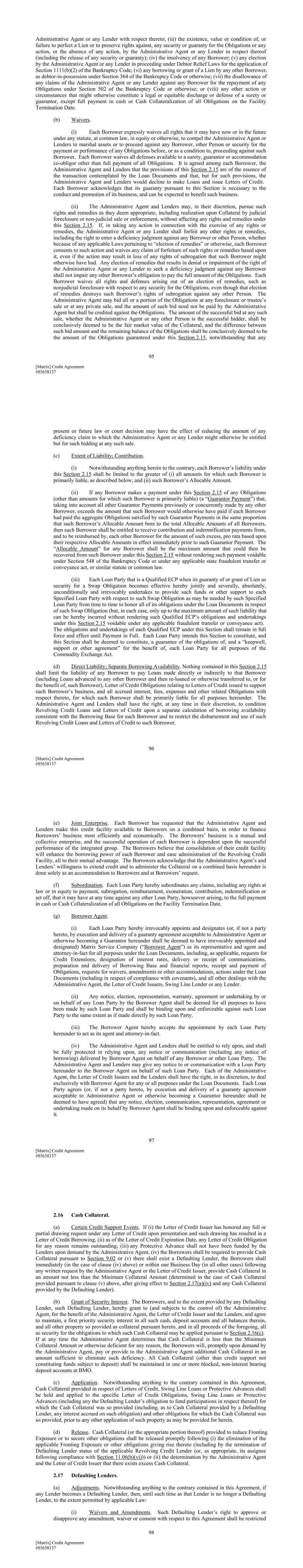 行政代理人或与此有关的任何贷款人;(iii)债务或任何诉讼的任何担保或保证的存在、价值或条件,或未能完善留置权或保全权利,或不存在任何诉讼,由行政代理人或任何贷款人就其作出(包括解除任何担保或保证);(iv)任何借款人的破产;(v)行政代理人或任何贷款人在根据债务人救济法进行的程序中为适用《破产法》第1111(b)(2)条而作出的任何选择;(vi)任何其他借款人的任何借款或授予留置权,根据《破产法》第364条或其他方式作为债务人占有;(vii)不允许行政代理人或任何贷款人就偿还《破产法》第502条或其他方式下的任何义务向任何借款人提出任何债权;或(viii)可能构成对担保人或担保人的合法或衡平法解除或抗辩的任何其他行动或情况,但在融资终止日期以现金全额付款或以现金抵押所有债务除外。(b)豁免。(i)每一借款人明确放弃其现在或将来根据任何法规、在普通法中、在股权或其他方面可能拥有的所有权利,以迫使行政代理人或放款人在对该借款人进行诉讼之前或作为对其进行诉讼的条件下,调集资产或对任何借款人、其他人或担保进行诉讼,以支付或履行任何义务。除全额支付所有债务外,每一借款人放弃担保人、担保人或住宿共同承付人可利用的所有抗辩。各借款人、行政代理人和贷款人约定,本条第2.15款的规定是贷款单证所设想交易的实质内容,若无此类规定,行政代理人和贷款人将拒绝发放贷款和签发信用证。每个借款人都承认,其根据本节提供的担保对于开展和推广其业务是必要的,并且可以预期会使此类业务受益。(ii)行政代理人和贷款人可酌情寻求其认为适当的权利和补救,包括通过司法止赎或非司法出售或强制执行在抵押品上实现,但不影响根据本条2.15规定的任何权利和补救。如果在采取与行使任何权利或补救措施有关的任何行动时,行政代理人或任何贷款人应丧失任何其他权利或补救措施,包括对任何借款人或其他人作出缺陷判决的权利,无论是否由于与“选择补救措施”有关的任何适用法律或其他原因,每个借款人均同意该行动并放弃任何关于没收该等权利或基于其的补救措施的主张,即使该行动可能导致该借款人原本可能拥有的任何代位权的丧失。任何补救办法的选择导致行政代理人或任何贷款人对任何借款人寻求不足判决的权利被拒绝或受到损害,不得损害任何其他借款人全额支付债务的义务。每个借款人都放弃因选择补救办法而产生的所有权利和抗辩,例如与债务的任何担保有关的非司法止赎,即使选择补救办法破坏了该借款人对任何其他人的代位求偿权。行政代理人可以在任何止赎或受托人出售或在任何私下出售时对全部或部分债务进行投标,该投标的金额无需由行政代理人支付,但应记入债务的贷方。在任何该等出售时的中标额,不论行政代理人或任何其他人是中标人,均应最终视为抵押品的公平市场价值,该等中标额与债务余额之间的差额应最终视为根据本条第2.15款担保的债务的金额,尽管任何95 [ Matrix ]信贷协议# 85638137当前或未来的法律或法院判决可能具有减少行政代理人或任何贷款人可能有权获得的任何不足索赔的金额的效果,但在任何此类销售中进行此类投标。(c)赔偿责任的程度;贡献。(i)尽管本条另有相反规定,每名借款人根据本条第2.15条所负的法律责任,须限于(i)该借款人主要负责的所有款额(如下所述)及(ii)该借款人的可分配款额中的较大者。(ii)如任何借款人根据本条第2.15条支付任何债务(该借款人主要须承担法律责任的款额除外)(“担保人付款”), 考虑到任何其他借款人之前或同时支付的所有其他担保人付款,如果每个借款人按照该借款人的可分配金额与所有借款人的可分配总金额所承担的相同比例支付了该担保人付款所满足的总债务,则该借款人应有权根据紧接该担保人付款之前各自有效的可分配金额,按比例从其他借款人处收取分摊和赔偿付款,并由彼此偿还该超出部分的金额。任何借款人的“可分配金额”应是根据本条第2.15款可向该借款人追回的最高金额,而不会根据《破产法》第548条或根据任何适用的州欺诈性转让或转易法,或类似的法规或普通法使此类付款无效。(iii)当其对掉期债务的担保或授予留置权作为担保时,作为合格ECP的每一贷款方在此共同和个别、绝对、无条件和不可撤销地承诺就该特定贷款方可能不时需要的掉期债务向每一特定贷款方提供资金或其他支持,以履行其在贷款文件下就该掉期债务承担的所有义务(但在每种情况下,仅限于在不使此类合格ECP根据本条2.15承担的义务和承诺根据任何适用的欺诈性转让或转易法可作废的情况下可以在此承担的此类责任的最大金额)。每个符合条件的ECP在本节下的义务和承诺应保持完全有效,直至全额付款。每一贷款方都打算由本节构成,并且本节应被视为构成《商品交易法》所有目的的对每一贷款方的义务的担保,以及为其利益的“keepwell、支持或其他协议”。(d)直接责任;单独借款可用性。本条第2.15款不限制任何借款人支付直接或间接向该借款人提供的贷款(包括垫付给任何其他借款人的贷款,然后再贷款或以其他方式转让给该借款人,或为该借款人的利益)的责任、与为支持该借款人的业务而签发的信用证有关的信用证义务,以及与此有关的所有应计利息、费用、开支和其他相关义务,该借款人应为本协议项下
