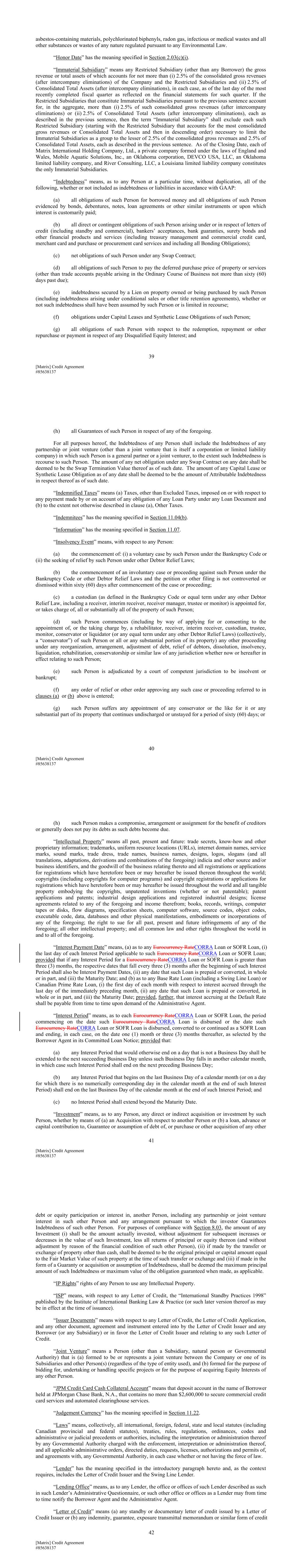 含石棉材料、多氯联苯、氡气、传染性或医疗废物以及根据任何环境法管理的任何性质的所有其他物质或废物。“荣誉日期”具有第2.03(c)(i)节规定的含义。「非物质附属公司」指任何受限制附属公司(任何借款人除外),其毛收入或总资产占公司及受限制附属公司综合毛收入(公司间抵销后)不多于(i)2.5%及(ii)综合总资产(公司间抵销后)的2.5%,在每宗个案中,截至该季度财务报表所反映的最近完成财政季度的最后一天。如果根据上一句构成非实质性子公司的受限制子公司合计占该等合并毛收入(公司间抵销后)的(i)2.5%以上或(ii)合并总资产(公司间抵销后)的2.5%以上,各如上一句所述,那么“非物质子公司”一词应排除每一家此类受限子公司(从占合并毛收入或合并总资产最多的受限子公司开始,然后按降序排列),以将非物质子公司作为一个集团限制为合并毛收入的2.5%和合并总资产的2.5%两者中的较小者,如上一句所述。截至交割日,Matrix International Holding Company,Ltd.(一家根据英格兰和威尔士法律成立的私营公司)、Mobile Aquatic Solutions,Inc.(一家俄克拉荷马州公司)、DEVCO USA,LLC(一家俄克拉荷马州有限责任公司)和River Consulting,LLC(一家路易斯安那州有限责任公司)各自构成唯一的非实质性子公司。“负债”是指,就特定时间的任何人而言,没有重复的,以下所有,无论是否按照公认会计原则计入债务或负债:(a)该人对所借款项的所有义务以及该人以债券、债权证、票据、贷款协议或其他类似工具为证明的或习惯上支付利息的所有义务;(b)该人在信用证(包括备用和商业)、银行承兑汇票、银行担保下产生或与之相关的所有直接或或有义务,担保债券及其他金融产品和服务(包括金库管理和商业信用卡、商户卡和购买或采购卡服务,包括所有担保义务);(c)该人在任何掉期合同下的净债务;(d)该人支付财产或服务的递延购买价款的所有义务(在正常业务过程中产生的应付贸易账款不超过逾期六十(60)天);(e)由该人拥有或正在购买的财产的留置权担保的债务(包括根据有条件出售或其他所有权保留协议产生的债务),不论该等债务是否应由该人承担或追索权有限;(f)该人在资本租赁和合成租赁义务下的义务;(g)该人就任何不合格股权的赎回、偿还或其他回购或付款所承担的所有义务;以及39 [矩阵]信贷协议# 85638137(h)该人就上述任何一项提供的所有担保。就本协议的所有目的而言,任何人的债务应包括该人作为普通合伙人或合营者的任何合伙企业或合营企业(本身为公司或有限责任公司的合营企业除外)的债务,只要该债务对该人有追索权。任何日期的任何掉期合约项下的任何净债务的金额应被视为截至该日期的掉期终止价值。截至任何日期的任何资本租赁或合成租赁债务的金额应被视为截至该日期就其而言的应占债务的金额。“补偿税款”是指(a)对任何贷款方根据任何贷款文件所承担的任何义务所支付的款项或因任何贷款方承担的任何义务而征收或与之相关的税款(不包括税款),以及(b)在(a)条未另有说明的范围内征收的其他税款。“受偿人”具有第11.04(b)条规定的含义。“信息”具有第11.07条规定的含义。“破产事件”是指, 就任何人而言:(a)启动:(i)该人根据《破产法》提出的自愿案件,或(ii)该人根据其他债务人救济法寻求救济;(b)启动根据《破产法》或其他债务人救济法针对该人的非自愿案件或程序,且在案件或程序启动后的六十(60)天内,该呈请或其他提交未被争议或驳回;(c)托管人(定义见《破产法》或任何其他债务人救济法下的同等期限,包括接管人,临时接管人、接管人管理人、受托人或监理人)获委任或掌管该人的全部或基本上全部财产;(d)该人启动(包括通过申请或同意委任整复者、接管人、临时接管人、保管人、受托人、监理人、保管人或清盘人(或任何其他债务人救济法下的任何同等期限)(统称为“保管人”)该人或其全部或大部分财产下的任何其他程序)任何重组、安排、债务调整、债务人救济、解散、无力偿债、清算、恢复正常,监管机构或任何司法管辖区的类似法律,不论现时或以后是否有效,均与该人有关;(e)该人被有管辖权的法院裁定为资不抵债或破产;(f)作出任何济助令或其他命令,批准上述(a)或(b)条所提述的任何该等案件或程序;(g)该人因其或其财产的任何实质部分而遭受任何监管机构或类似机构的委任持续六十(60)天未解除或未中止的;或40 [ Matrix ]信贷协议# 85638137(h)该等人为债权人的利益作出妥协、安排或转让,或一般不在该等债务到期时支付其债务。“知识产权”是指过去、现在和将来的所有:商业秘密、专有技术和其他专有信息;商标、统一资源位置(URL)、互联网域名、服务标记、声音标记、商业外观、商号、商号、商号、商号、商号、设计、标识、标语(以及上述所有翻译、改编、派生和组合)标识和其他来源和/或商业标识,以及与此有关的业务的商誉以及在世界各地以前已经或以后可能在此基础上发布的所有注册或注册申请;在世界各地以前已经或以后可能发布的版权(包括计算机程序的版权)和版权注册或注册申请以及体现版权的所有有形财产、非专利发明(无论是否可申请专利);专利申请和专利;工业设计申请和已注册工业设计;与上述任何一项有关的许可协议以及由此产生的收入;书籍、记录、著作、计算机磁带或磁盘、流程图、规格表