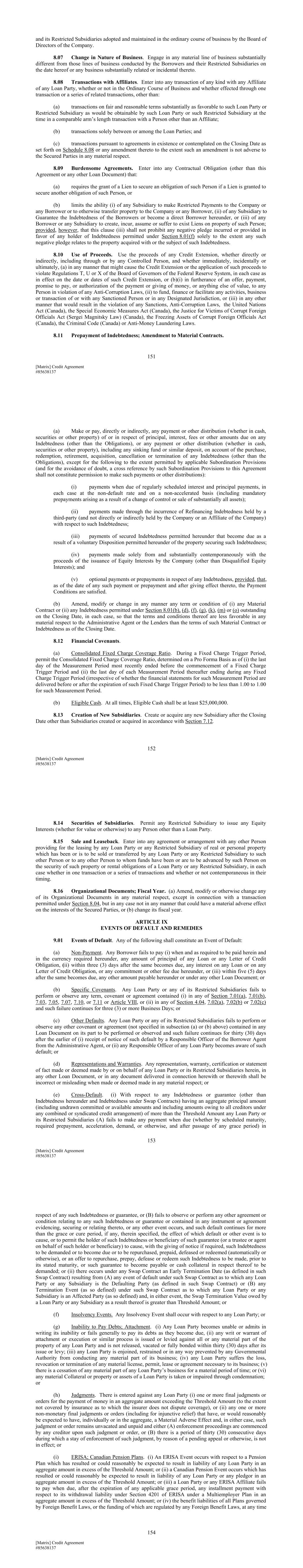 及其受限制附属公司在日常业务过程中获公司董事会采纳及维持。8.07业务性质变更。从事与借款人及其受限制附属公司于本协议日期所进行的业务范围有重大差异的任何重大业务范围或与之有重大关联或附带关系的任何业务。8.08与关联公司的交易。与任何贷款方的任何关联公司进行任何种类的交易,无论是否在正常业务过程中,也无论是否通过一项交易或一系列相关交易达成,但以下情况除外:(a)以公平合理的条件进行的交易,基本上与该贷款方或该受限制子公司在当时与关联公司以外的人进行的可比公平交易中可获得的条件一样有利;(b)仅在贷款方之间或贷款方之间进行的交易;(c)根据附表8.08规定的截止日期已存在或预期的协议进行的交易或对其作出的任何修订,前提是此类修订在任何重大方面均不会对有担保各方不利。8.09繁重的协议。订立任何合同义务(本协议或任何其他贷款文件除外):(a)要求授予留置权以担保该人的义务,如果授予留置权以担保该人的另一项义务,或(b)限制任何附属公司(i)向公司或任何借款人作出受限制付款或以其他方式向公司或任何借款人转移财产的能力,(ii)任何附属公司为借款人的债务提供担保或成为本协议项下的直接借款人,或(iii)任何借款人或任何附属公司创建,对该人的财产产生、承担或承受存在的留置权;但条件是,本条款(iii)不得仅在任何该等负质押涉及与该等债务取得的财产或该等债务的标的有关的范围内,禁止为任何根据第8.01(f)条允许的债务持有人而招致或提供的任何负质押。8.10收益用途。使用任何信贷展期的收益,不论是直接或间接使用,包括通过或由任何受控制的人使用,也不论是立即、偶然或最终使用,(a)以任何可能导致信贷展期或此类收益的应用违反联邦储备系统理事会T、U或X条例的方式,在每种情况下均在此类信贷展期的日期或日期生效,或(b)(i)促进要约、付款、承诺付款或授权付款或给予金钱,或任何其他有价值的东西,对任何违反任何反腐败法律的人,(ii)资助、资助或便利任何受制裁人员或在任何指定司法管辖区与其进行的任何活动、业务或交易,或(iii)以任何其他方式导致违反任何制裁、反腐败法、《联合国法》(加拿大)、《特别经济措施法》(加拿大)、《腐败外国官员受害者司法法》(Sergei Magnitsky Law)(加拿大)、《冻结腐败外国官员资产法》(加拿大)、《刑法》(加拿大)或《反洗钱法》。8.11提前偿还债务;修改重大合同。151 [矩阵]信贷协议# 85638137(a)直接或间接作出或支付任何债务到期的本金、利息、费用或其他金额(债务除外)的任何付款或其他分配(不论是以现金、证券或其他财产),或任何付款或其他分配(不论是以现金、证券或其他财产),包括任何偿债基金或类似存款,因购买、赎回、报废、取得、注销或终止任何债务(债务除外),在适用的从属条款允许的范围内,除以下情况外(为免生疑问,此类从属条款对本协议的交叉引用不构成进行此类付款或其他分配的许可):(i)定期安排的利息和本金付款到期时的付款, 在每种情况下,以非违约率和非加速的方式(包括因控制权变更或出售几乎所有资产而产生的强制性提前还款);(ii)通过发生由第三方(而不是由公司或公司关联公司直接或间接持有)持有的再融资债务而就此类债务支付的款项;(iii)支付本协议允许的有担保债务因根据本协议允许的对担保该债务的财产的自愿处分而到期的;(iv)仅从公司发行股权的收益(不符合资格的股权除外)支付且基本上与其同时支付的款项;(v)就任何债务可选择的付款或预付款,但条件是,截至任何该等付款或预付款的日期并在其生效后,付款条件已获满足。(b)以任何方式修订、修改或更改(i)任何重要合约的任何条款或条件,或(ii)根据第8.01(b)、(d)、(f)、(g)、(k)、(m)或(o)条在截止日期允许的任何未偿债务,在每种情况下,使其条款和条件在对行政代理人或贷款人的任何重大方面不如截至截止日期的该等重要合约或债务的条款有利。8.12财政盟约。(a)合并固定收费覆盖率。在固定费用触发期内,允许在(i)在固定费用触发期开始前最近结束的计量期的最后一天和(ii)此后在任何固定费用触发期内结束的每个计量期的最后一天(无论该计量期的财务报表是否在该固定费用触发期到期之前或之后交付)以备考方式确定的合并固定费用覆盖率低于该计量期的1.00至1.00。(b)符合条件的现金。在任何时候,合格现金应至少为25000000美元。8.13新设子公司。除根据第7.12节创建或收购的子公司外,在截止日期后创建或收购任何新的子公司。152 [矩阵]信用协议# 856381378.14子公司证券。允许任何受限制的子公司向贷款方以外的任何人发行任何股权(无论是价值还是其他)。8.15售后回租。与任何其他人订立任何协议或安排,订定由任何贷款方或任何受限制附属公司租赁已或将由任何贷款方或任何受限制附属公司出售或转让给该等其他人或由该等人垫付或将由该等人垫付资金的任何其他人,以担保贷款方或任何受限制附属公司的该等财产或租金责任,在每种情况下,无论是在一次交易中还是在一系列交易中,以及它们的时间安排是否同步。8.16组织文件;会计年度。(a)在任何重大方面修订、修改或以其他方式更改其任何组织文件,但与第8.04条允许的交易有关的除外,但在任何情况下不得以任何可能对有担保当事人的利益产生重大不利影响的方