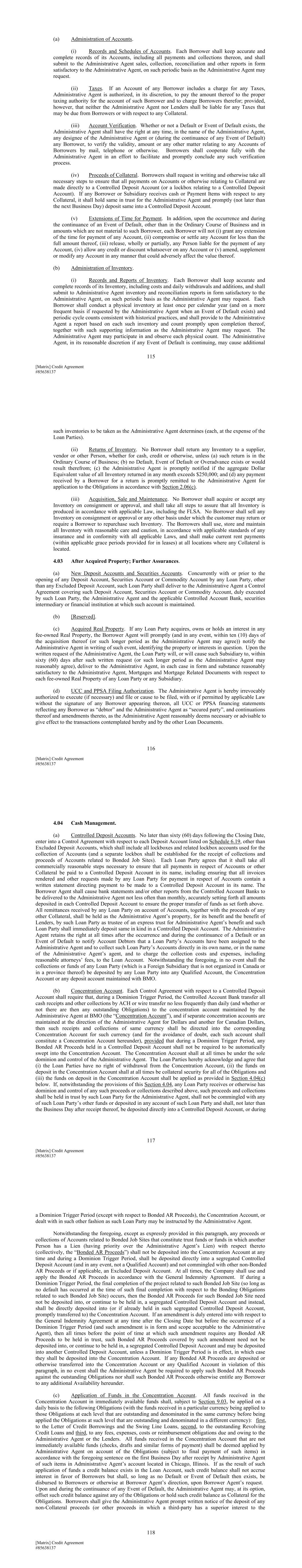 (a)账户管理。(i)帐目记录和附表。各借款人应当保持对其账目的准确、完整记录,包括对其进行的所有付款和收款,并应当按照行政代理人要求的定期定期向行政代理人提交行政代理人满意的形式的销售、收款、对账等报告。(二)税收。如任何借款人的帐户包括任何税款的押记,则授权行政代理人酌情就该借款人的帐户向适当的税务机关支付该款额,并就此向借款人收取费用;但条件是,行政代理人或贷款人均不对借款人可能应缴的任何税款或任何抵押品承担责任。(三)账户核查。无论是否存在违约或违约事件,行政代理人有权随时以行政代理人、行政代理人的任何指定人员或(在任何违约事件持续期间)任何借款人的名义,通过邮寄、电话或其他方式核实与借款人的任何账户有关的有效性、金额或任何其他事项。借款人应与行政代理人充分合作,努力便利并迅速结束任何此类核查过程。(四)抵押品收益。借款人应以书面要求并以其他方式采取一切必要步骤,以确保所有账户上或与抵押品有关的付款均直接支付给受控存款账户(或与受控存款账户有关的密码箱)。任何借款人或子公司收到与任何抵押品有关的现金或支付物品的,应为行政代理人以信托方式持有,并及时(不迟于下一个工作日)将其存入受控存款账户。(五)延长付款时间。此外,在违约事件发生时及持续期间,除在正常业务过程中及以对该借款人并不重要的金额外,每名借款人将不会(i)批准任何延长任何帐户的付款时间,(ii)妥协或结算任何帐户少于其全部金额,(iii)全部或部分释放任何对任何帐户负有付款责任的人,(iv)允许任何帐户的任何信贷或折扣,或(v)修订,以任何可能对账户价值产生不利影响的方式补充或修改任何账户。(b)库存管理。(i)库存的记录和报告。各借款人应保持其盘存的准确、完整记录,包括成本和日常提现、新增,并应按行政代理人要求定期以行政代理人满意的形式向行政代理人提交盘存和对账报告。每个借款人应在每个历年至少进行一次实物盘存(如果存在违约事件时行政代理人提出要求,则更频繁地进行)和符合历史惯例的定期周期盘点,并应根据每一份此类盘存向行政代理人提供一份报告,并在盘存完成后立即进行盘点,连同行政代理人可能要求的证明信息。行政代理人可以参加并观察每一次实物清点。如果任何违约事件仍在继续,行政代理人可在其合理的酌处权下,导致额外的115 [ Matrix ]信贷协议# 85638137这类存货被视为行政代理人确定的(每一项,费用由贷款方承担)。(二)存货的返还。任何借款人不得将任何库存退回供应商、供应商或其他人,无论是以现金、信贷或其他方式,除非(a)此类退回是在正常业务过程中;(b)不存在违约、违约事件或超支事件或将由此导致;(c)如果在任何月份退回的所有库存的美元等值总额超过250,000美元,则立即通知行政代理人;以及(d)借款人收到的任何退货付款立即汇给行政代理人,以根据第2.06(c)节适用于债务。(三)购置、销售和维修。任何借款人均不得托运或接受任何库存,并应采取一切步骤确保所有库存均按照适用法律生产,包括按照FLSA生产。任何借款人不得以托运或批准的方式出售任何存货或客户可能退回或要求借款人回购该存货的任何其他依据。借款人应根据任何保险的适用标准和所有适用法律,以合理谨慎和谨慎的方式使用、储存和维护所有库存, 并应在任何抵押品所在的所有地点(在租约规定的适用宽限期内)支付当期租金。4.03在获得财产后;进一步保证。(a)新增存款账户和证券账户。任何贷款方在开立任何存款账户、证券账户或商品账户的同时或之前,除任何除外存款账户外,该贷款方应向行政代理人交付一份涵盖该存款账户、证券账户或商品账户的控制协议,该协议由该贷款方、行政代理人及开立该账户的适用的受控账户银行、证券中介机构或金融机构正式签署。(b)[保留]。(c)购置不动产。如任何贷款方取得、拥有或持有任何收费自有不动产的权益,借款人代理人将立即(无论如何,在取得该不动产后十(10)天内(或行政代理人可能同意的较长期限内))将该事件书面通知行政代理人,指明有关财产或权益。根据行政代理人的书面请求,贷款方将或将促使该附属公司在该书面请求后的六十(60)天内(或行政代理人合理同意的较长期限),就任何贷款方或任何附属公司的每项收费自有不动产向行政代理人交付在形式和实质上均令行政代理人合理满意的抵押和抵押相关文件。(d)UCC和PPSA备案授权。兹不可撤销地授权行政代理人在适用法律允许的情况下(如有必要)签署或安排备案,而无需在其上出现任何借款人的签名,所有反映任何借款人为“债务人”而行政代理人为“被担保方”的UCC或PPSA融资报表,以及行政代理人合理地认为为使特此设想的交易和其他贷款文件生效所必需或可取的这些报表的延续及其修订。116 [矩阵]授信协议# 856381374.04现金管理。(a)受控存款账户。不迟于截止日期后六十(60)天内,就附表6.19所列的每个存款账户订立控制协议,但除外存款账户除外,该账户应包括所有用于收款的密码箱和相关密码箱账户(并应设立一个单独的密码箱,用于收取与保税工作场所有关的账户的收款和收益)。每一贷款方同意,应采取一切商业上合理的必要步骤,确保以其名义向受控存款账户支付与账户或其他抵押品有关的所有款项,包括确保