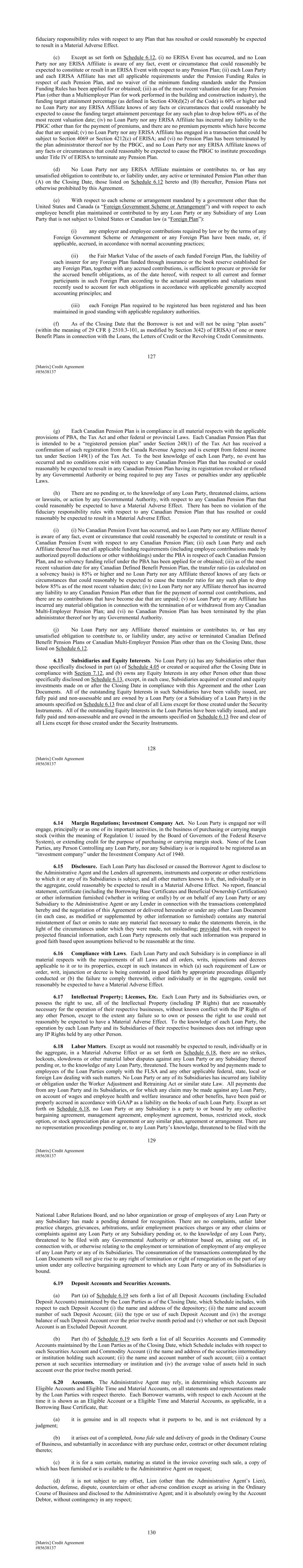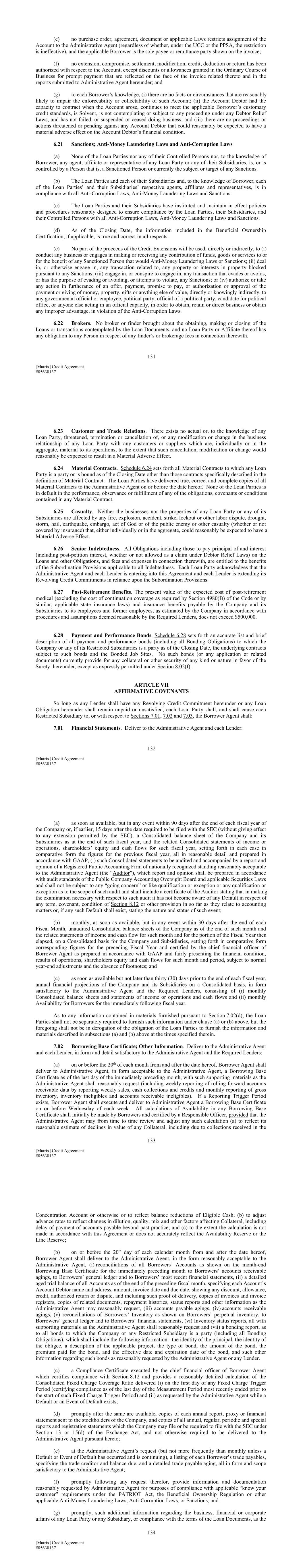 (e)没有任何定购单、协议、文件或适用法律限制将账户转让给行政代理人(无论根据UCC或PPSA,该限制是否无效),且适用的借款人是发票上显示的唯一收款人或汇款方;(f)没有就该账户授权延期、妥协、结算、修改、贷记、扣除或退回,(g)据每一借款人所知,(i)不存在合理可能损害该账户的可执行性或可收回性的事实或情况;(ii)账户债务人在账户产生时有能力订立合同,继续符合适用的借款人的习惯信贷标准,具有偿付能力,不考虑或受任何债务人救济法规定的任何程序的约束,但在正常业务过程中为及时付款而给予的折扣或津贴除外,且没有失败,或暂停或停止经营业务;及(iii)没有任何可合理预期会对账户债务人的财务状况产生重大不利影响的针对任何账户债务人的诉讼或行动受到威胁或待决。6.21制裁;反洗钱法和反腐败法(a)贷款方或其任何受控制人,或据借款人所知,任何贷款方或其任何子公司的任何代理人、关联公司或代表,均不是或受其控制的人,该人是受制裁的人,或目前是任何制裁的对象或对象。(b)贷款方及其每一子公司,以及据借款人所知,每一贷款方及其子公司各自的代理人、关联公司和代表均遵守所有反腐败法、反洗钱法和制裁。(c)贷款方及其子公司制定并维持有效的政策和程序,这些政策和程序经过合理设计,以确保贷款方、其子公司及其受控制人员遵守所有反腐败法、反洗钱法和制裁。(d)截至截止日期,受益所有权证明(如适用)中包含的信息在所有方面都是真实和正确的。(e)信贷展期所得款项的任何部分将不会直接或间接用于(i)开展任何业务或从事向任何受制裁人或为其利益作出或接受任何资金、货物或服务的任何贡献,以反洗钱法律或制裁;(ii)从事或以其他方式从事与根据任何制裁被封锁的任何财产或财产权益有关的任何交易;(iii)从事或共谋从事任何规避或避免的交易,或具有规避或避免的目的,或企图违反,任何制裁;或(iv)授权或采取任何行动,以促进直接或明知间接向任何政府官员或雇员、政党、政党官员、政治职位候选人或任何以官方身份行事的其他人提供、付款、承诺付款,或授权或批准付款或给予金钱、财产、礼物或任何其他有价值的东西,以获取、保留或指导业务或获得任何不正当优势,违反反贪法。6.22经纪商。没有任何经纪人或发现者促成贷款文件所设想的贷款或交易的获得、作出或完成,也没有任何贷款方或其关联机构就与此有关的任何发现者或经纪费对任何人承担任何义务。131 [矩阵]信贷协议# 856381376.23客户与贸易关系。任何贷款方与任何客户或供应商的业务关系不存在实际的或据任何贷款方所知的威胁、终止或取消,或任何单独或总体上对其经营具有重要意义的业务关系的任何修改或变更,只要这种取消、修改或变更将合理地预期会导致重大不利影响。6.24物资合同。附表6.24列出了除材料合同定义中具体描述的合同之外,任何贷款方在截止日期为一方当事人或受约束的所有材料合同。贷款双方已于本协议之日或之前向行政代理人交付了真实、正确、完整的全部材料合同副本。任何贷款方在履行、遵守或履行任何重大合同所载的任何义务、契诺或条件方面均不违约。6.25伤亡。任何贷款方或其任何附属公司的业务或物业均不受任何 爆炸、事故、罢工、停工或其他劳资纠纷、干旱、风暴、冰雹、地震、禁运、天灾或公敌的行为或其他伤亡(无论是否在保险范围内),可单独或合计合理地预期会产生重大不利影响。6.26高级负债。所有债务,包括就贷款和其他债务支付本金和利息(包括请愿后利息,无论是否根据债务人救济法被允许作为债权)以及与此有关的费用和开支,均有权享受适用于所有债务的从属条款的好处。各贷款方确认,行政代理人和各贷款人正在订立本协议,而各贷款人正在根据从属条款延长其循环信贷承诺。6.27退休后福利。退休后医疗的预期费用(不包括《守则》第4980(b)节或类似的、适用的州保险法要求的继续保险的费用)以及公司及其子公司根据所需贷款人认为合理的程序和假设估计的应付给其雇员和前雇员的保险福利的现值不超过500,000美元。6.28缴款和履约保证金。附表6.28列出了截至交割日公司或其任何受限制子公司作为一方的所有付款和履约保证金(包括所有保税义务)、受该等保证金约束的基础合同以及保税工地的准确清单和简要说明。除第8.02(f)条明文准许的情况外,该等债券(或任何申请或相关文件)目前并无就任何种类或性质的任何抵押品或其他担保作出规定,以根据该等规定的担保人为受益人。第七条申明盟约,只要任何贷款人在本协议项下有任何循环信贷承诺或本协议项下的任何贷款义务仍未得到支付或未得到履行,每一贷款方均应,并应促使每一受限制的附属公司,或就第7.01、7.02和7.03条而言,借款人代理人应:7.01财务报表。尽快向行政代理人和每个贷款人交付:132 [矩阵]信贷协议# 85638137(a),但无论如何在公司每个财政年度结束后的90天内,或者,如果更早,则在要求向SEC提交文件的日期(不影响SEC允许的任何延期)后的15天内,公司及其子公司截至该财政年度结束时的合并资产负债表,以及该财政年度的相关合并收入或经营报表、股东权益和现金流量,在每种情况下,以比较形式列出上一财政年度的数字,所有这些数字均以合理的细节并按照公认会计原则编制,(i)此类合并报表