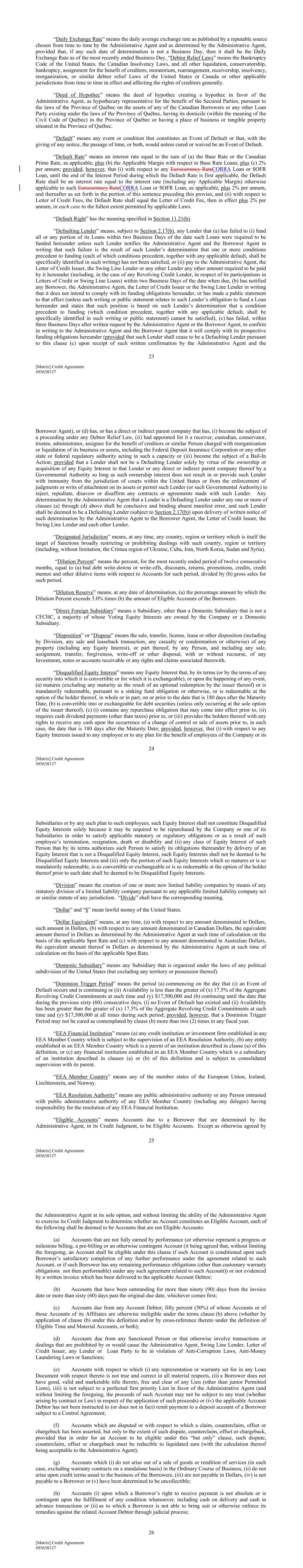 “每日汇率”是指由行政代理人不时选择的信誉良好的来源公布并由行政代理人确定的每日平均汇率,但如任何该等确定日期不是营业日,则应为截至最近结束的营业日的每日汇率。“债务人救济法”是指美国《破产法》、加拿大《破产法》以及所有其他清算、监管、破产、为债权人利益而转让、暂停、重新安排、接管、破产、重组或美国或加拿大或其他不时生效并普遍影响债权人权利的适用法域的类似债务人救济法。“Hypothec契据”是指根据魁北克省法律就任何加拿大借款人或根据魁北克省法律存在的任何其他贷款方的资产、其住所(在魁北克民法典的含义内)在魁北克省或拥有位于魁北克省的营业地或有形财产的行政代理人作为为有担保当事人的利益而设立有利于该行政代理人的抵押契据。“违约”是指构成违约事件的任何事件或条件,或者随着任何通知的发出,时间的流逝,或两者兼而有之,除非得到纠正或豁免,否则将构成违约事件。“违约率”是指利率等于(a)基准利率或加拿大最优惠利率(如适用)加上(b)基准利率贷款的适用保证金,再加上(c)每年2%的总和;但前提是(i)就任何欧元汇率CORRA贷款或SOFR贷款而言,直至首次适用违约率的利息期结束,违约率应为等于该等欧元汇率CORRA贷款或SOFR贷款(如适用)以其他方式适用的利率(包括任何适用的保证金)的利率,再加上每年2%,其后按本但书之前本句部分的规定,以及(ii)就信用证费用而言,违约率应等于信用证费用,然后在适用法律允许的最大范围内,在每种情况下均有效加上每年2%。“违约权”具有第11.21(b)条规定的含义。“违约贷款人”是指,在符合第2.17(b)节的规定下,任何贷款人(a)未能(i)在根据本协议要求为此类贷款提供资金之日起两个营业日内为其全部或任何部分贷款提供资金,除非该贷款人书面通知行政代理人和借款人代理人,该失败是由于该贷款人确定提供资金的一个或多个先决条件(其中每个先决条件,连同任何适用的违约,均应在该书面中具体指明)尚未得到满足,或(ii)向该行政代理人付款,信用证发行人、周转额度贷款人或任何其他贷款人在到期之日起两个营业日内(就任何循环信贷贷款人而言,包括就其参与信用证或周转额度贷款而言)根据本协议要求其支付的任何其他金额,(b)已书面通知任何借款人、行政代理人、信用证发行人或周转额度贷款人,其不打算遵守其在本协议项下的资金义务,或已作出大意如此的公开声明(除非该书面或公开声明涉及该贷款人根据本协议为贷款提供资金的义务,并声明该立场是基于该贷款人确定无法满足提供资金的先决条件(该先决条件连同任何适用的违约应在该书面或公开声明中具体指明),(c)在行政代理人或借款人代理人提出书面请求后三个营业日内未能,向行政代理人和借款人代理人书面确认,其将遵守其在本协议项下的预期筹资义务(前提是该贷款人在收到行政代理人和23 [ Matrix ]信贷协议# 85638137借款人代理人的书面确认后,根据本条款(c)不再是违约贷款人),或(d)已拥有或拥有一家直接或间接母公司,该母公司已(i)成为任何债务人救济法下的程序主体,(ii)已为其指定接管人、托管人、保管人、受托人、管理人,为债权人或被控对其业务或资产进行重组或清算的类似人的利益受让人, 包括联邦存款保险公司或以这种身份行事的任何其他州或联邦监管机构,或(iii)成为保释诉讼的主体;但贷款人不得仅凭借对任何股权的所有权或获得而成为违约贷款人该贷款人或政府当局对其任何直接或间接的母公司,只要该所有权权益不会导致或向该贷款人提供豁免,使其不受美国境内法院的管辖权或对其资产执行判决或扣押令状的豁免,或允许该贷款人(或该政府当局)拒绝、否定、否认或否认与该贷款人订立的任何合同或协议。行政代理人根据上述(a)至(d)条中的任何一项或多项确定贷款人为违约贷款人,应为无明显错误的结论性和有约束力的,且该贷款人应在行政代理人向借款人代理人、信用证发行人、周转额度贷款人和相互贷款人送达有关该确定的书面通知时被视为违约贷款人(在不违反第2.17(b)条的情况下)。“指定管辖”是指在任何时候,任何国家、地区或领土本身就是广泛限制或禁止与这些国家、地区或领土(包括但不限于乌克兰的克里米亚地区、古巴、伊朗、朝鲜、苏丹和叙利亚)进行交易的制裁目标。“稀释百分比”是指在最近结束的连续十二个月期间,等于(a)坏账减记或注销、折扣、退货、促销、信贷、信用备忘和该期间账户的其他稀释项目,除以(b)该期间的销售总额的百分比。“稀释准备金”是指,在任何确定日期,(a)稀释百分比超过5.0%的百分比金额乘以(b)借款人的合格账户金额。“直接外国子公司”是指除不是CFCHC的国内子公司外,其多数表决权股权由公司或国内子公司拥有的子公司。“处置”或“处置”是指任何人对任何财产(包括任何股权)或其部分的出售、转让、许可、租赁或其他处置(包括通过分割、任何售后回租交易、任何伤亡或谴责或其他方式),包括对任何投资、票据或应收账款或与之相关的任何权利和债权的任何出售、转让、转让、豁免、注销或其他处置,无论是否有追索权。“不合格股权”是指根据其条款(或根据其可转换成或可交换的任何证券的条款),或在任何事件发生时,(a)到期(不包括因发行人可选择赎回而导致的任何