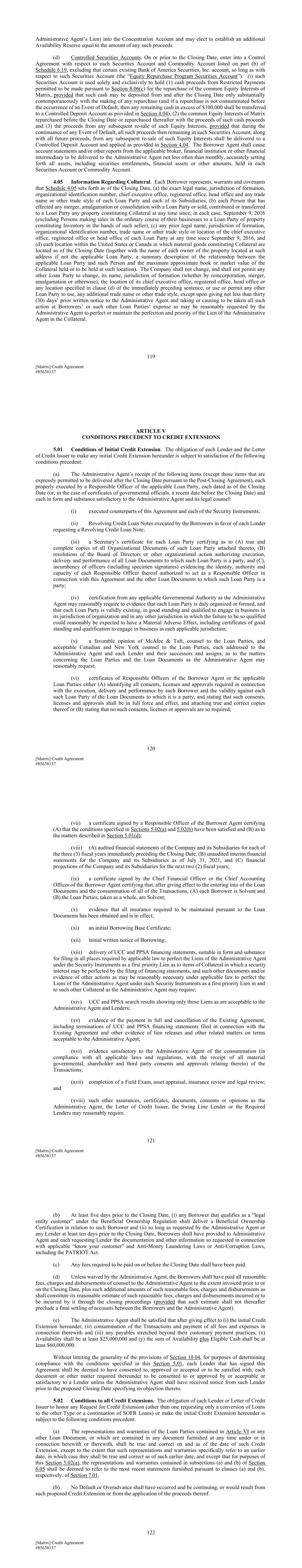 行政代理人留置权)进入集中账户,并可选择建立与任何此类收益金额相等的额外可用性准备金。(d)受控证券账户。在截止日期或之前,就附表6.19(b)部分所列的每个证券账户和商品账户订立控制协议,但不包括某些现有的Bank of America Securities,Inc.账户,只要就该证券账户(“股权回购计划证券账户”):(i)该证券账户仅用于持有(1)根据第8.06(c)节允许为回购Matrix的共同股权而进行的限制性付款的现金收益,但此类现金只能在进行任何回购的实质上同时从截止日期及之后存入(如果在违约事件发生之前未完成回购,则任何超过100,000美元的剩余现金应按照第4.04条的规定转入受控存款账户),(2)Matrix在截止日期之前回购的普通股权益或此后用此类现金收益回购的普通股权益,以及(3)此类股权的任何后续再出售的收益,但在任何违约事件持续期间,该证券账户中当时剩余的所有该等收益,连同该等股权的任何后续再出售的所有未来收益,应交付至受控存款账户,并按第4.04节的规定适用。借款人代理人应当促使适用的经纪商、金融机构或其他金融中介机构的账户报表和/或其他报告不少于每月一次交付给行政代理人,准确列明每个证券账户或商品账户中持有的所有资产,包括证券权益、金融资产或其他金额。4.05关于抵押品的信息。每名借款人声明、保证及契诺,附表4.05载列截至截止日期,(a)每名贷款方及其每一附属公司的确切法定名称、成立司法管辖权、组织识别号码、行政总裁办公室、注册办事处、总部及任何商号或其他贸易样式,(b)自(在每种情况下)9月9日以来的任何时间与贷款方进行任何合并、合并或合并,或向贷款方出售、出资或转让构成抵押品的任何财产的每一人,2016年(不包括在正常经营过程中向该出卖人手中构成存货的财产的贷款方进行销售的人员),(c)自2016年9月9日以来的任何时间,每一贷款方的首席执行官办公室、注册办事处或总部的任何先前法定名称、形成管辖权、组织识别号、商号或其他交易样式或地点,(d)截至交割日构成抵押品的重要货物所在的美国或加拿大境内的每个地点(连同位于该地址的财产的每个所有者的名称(如果不是适用的贷款方),适用的贷款方与该人之间关系的概要描述以及在该地点持有或将持有的抵押品的最大近似账面价值或市场价值)。公司不得变更、也不得允许任何其他贷款方变更其名称、组建管辖权(无论是通过重新组建、合并、合并或其他方式)、其首席执行官办公室、注册办事处、总部或紧接前句(d)款规定的任何地点,或使用或允许任何其他贷款方使用、任何额外的商号或其他贸易样式,除非提前不少于三十(30)天向行政代理人发出书面通知,并采取或促使采取一切由借款人或行政代理人合理要求的其他贷款方承担费用的行动,以完善或维持行政代理人在担保物上的留置权的完善和优先权。119 [矩阵]信贷协议# 85638137第五条信贷展期的先决条件5.01初始信贷展期的条件。每一贷款人和信用证发行人根据本协议作出任何初始信贷延期的义务须满足以下先决条件:(a)行政代理人收到下列物品(根据交割后协议明确允许在交割日期之后交付的物品除外),每件物品均由适用的贷款方的负责官员妥善执行,每件物品的日期均为截止日期(或,如为政府官员的证书, 截止日期前的最近日期)以及行政代理人及其法律顾问各自满意的形式和实质内容:(i)本协议和每份担保文书的已执行对应方;(ii)借款人为要求循环信用贷款票据的每个贷款人签立的循环信用贷款票据;(iii)每个贷款方的秘书证明,证明(a)所附该贷款方的所有组织文件的真实完整副本,(b)董事会决议或授权执行的其他组织行动,交付和履行该贷款方作为一方当事人的所有贷款文件,以及(c)证明其被授权担任与本协议有关的负责官员及其作为该贷款方作为一方当事人的其他贷款文件的负责官员的身份、权限和能力的高级职员(包括样本签名);(iv)作为行政代理人可能合理要求的任何适用的政府当局的证明,以证明每一贷款方均已适当组织或组建,且每一贷款方均有效存在,信誉良好并有资格在其组织管辖范围内以及任何其他法域从事业务,如果不具备这种资格可以合理地预期会产生重大不利影响,包括在每个适用法域从事业务的良好信誉和资格证明;(v)McAfee & Taft、贷款方的法律顾问以及贷款方的可接受的加拿大和纽约法律顾问的赞成意见,每一方均发给行政代理人和每个贷款人及其继任者和受让人,关于与贷款方有关的事项以及行政代理人可能合理要求的贷款文件;(vi)借款人代理人或适用的贷款方负责人员的证明(a)指明与每个借款人执行、交付和履行有关的所有同意、许可和批准,以及其作为当事方的贷款文件对每个此类贷款方的有效性,并说明这些同意、许可和批准应具有充分的效力和效力,并附上其真实和正确的副本或(b)说明不需要此类同意、许可或批准;120 [矩阵]信贷协议# 85638137(vii)由借款人代理人的负责官员签署的证明,证明(a)第5.02(a)和5.02(b)条规定的条件已得到满足,以及(b)关于第5.01(d)条所述事项;(viii)(a)公司及其子公司在紧接截止日期前三(3)个财政年度各经审计的财务报表,(b)公司及其附属公司截至2021年7月31日的未经审计的中期财务报表,及(c)公司及其附属公司未来两(2)个会计年度的财务预测;(ix)由借款人代理的首席财务官或首席财务官签署的证明,证明在订立贷