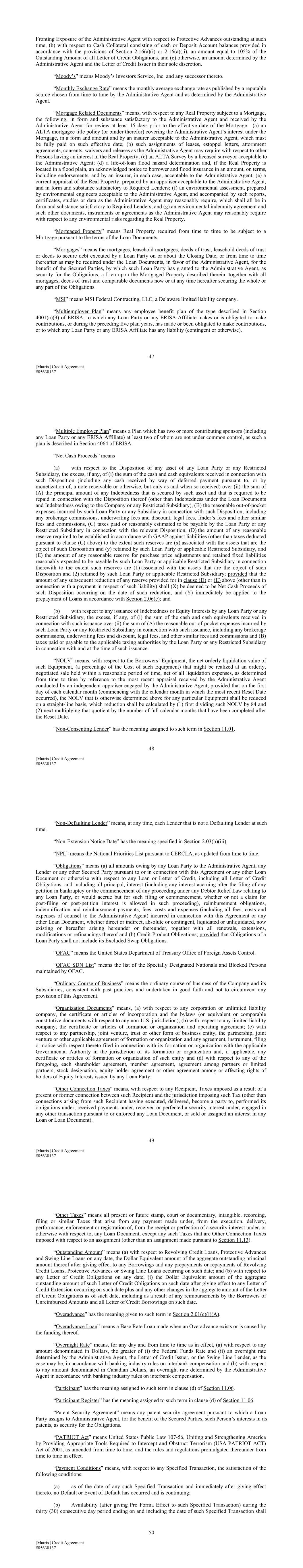 行政代理人对当时未偿还的保护性垫款的正面风险敞口,(b)涉及根据第2.16(a)(i)或2.16(a)(ii)节的规定提供的现金或存款账户余额组成的现金抵押品,金额相当于所有信用证债务未偿金额的105%,以及(c)否则,由行政代理人和信用证发行人自行决定的金额。“穆迪”是指穆迪投资者服务公司及其任何继任者。“每月汇率”是指由行政代理人不时选择的信誉良好的来源公布并由行政代理人确定的每月平均汇率。“抵押相关单据”是指,就任何受抵押约束的不动产而言,在形式和实质上令行政代理人满意并由行政代理人至少在抵押生效日期前15天收到供审查的以下内容:(a)ALTA抵押权人所有权保单(或其活页夹),涵盖行政代理人在抵押项下的权益,其形式和金额以及由行政代理人可接受的保险人提供,该保单必须在该生效日期全额支付;(b)此类转让租约、禁止反言书、授权协议、同意书,就与不动产有利害关系的其他人而言,作为行政代理人可能要求的豁免和解除;(c)由行政代理人可接受的持牌测量师进行ALTA调查;(d)贷款期限洪水灾害的确定,如果不动产位于洪泛平原,则根据行政代理人可接受的条款(包括背书)和保险人(在每种情况下)向借款人和洪水保险发出的确认通知;(e)由行政代理人可接受的评估师编制的不动产现行评估,(f)环境评估,由行政代理人可接受的环境工程师编制,并附有行政代理人可能合理要求的报告、证书、研究或数据,其形式和实质均应令要求的贷款人满意;(g)环境赔偿协议以及行政代理人可能合理要求的与不动产有关的任何环境风险的其他文件、文书或协议。「抵押财产」指根据贷款文件的条款不时须受抵押规限的不动产。「抵押权」指贷款方于截止日或前后,或其后根据贷款文件的规定不时为有担保方的利益而以行政代理人为受益人而签立的抵押、租赁抵押、信托契据、租赁信托契据或担保债务的契据,据此,该贷款方已授予行政代理人对其中所述抵押财产的留置权,作为债务的担保,连同所有抵押,现在或以后任何时间为全部或任何部分义务提供担保的信托契约和类似文件。“MSI”意为MSI Federal Contracting,LLC,一家特拉华州有限责任公司。“多雇主计划”指ERISA第4001(a)(3)节所述类型的任何雇员福利计划,任何贷款方或任何ERISA关联公司向其作出或有义务作出贡献,或在前五个计划年度内已作出或有义务作出贡献,或任何贷款方或任何ERISA关联公司对其承担任何责任(或有或其他)。47 [ Matrix ]信贷协议# 85638137“多个雇主计划”是指有两个或两个以上的出资发起人(包括任何贷款方或任何ERISA关联公司)的计划,其中至少两个人不在共同控制之下,正如ERISA第4064节中所描述的那样。“现金收益净额”是指(a)就任何贷款方或任何受限制子公司的任何资产的处置而言,(i)就此类处置而收到的现金和现金等价物的总和(包括根据应收票据或其他方式通过延期付款或货币化方式收到的任何现金)的超额部分(如有),但仅限于收到时)超过(ii)(a)由该资产作担保的任何债务的本金(贷款文件项下的债务及欠公司或任何受限制附属公司的债务除外)的总和,(b)该贷款方或任何附属公司就该处置而招致的合理自付费用,包括任何经纪佣金、承销费和折扣、法律费用, finder的费用和其他类似的费用和佣金,(c)贷款方或任何受限制的子公司就相关处置已支付或合理估计应支付的税款,(d)要求根据公认会计原则针对负债建立的任何合理准备金的金额(根据上述(c)条扣除的税款除外),前提是这些准备金与作为此类处置对象的资产相关(x),以及(y)由该贷款方或适用的受限制的子公司保留,(e)该贷款方或适用的受限制附属公司合理预期应就购买价格调整支付的任何合理准备金和保留的固定负债的金额,前提是该等准备金(1)与作为该处置对象的资产相关,以及(2)由该贷款方或适用的受限制附属公司保留;提供上述(d)或(e)条所规定的任何储备金的任何后续削减(与就该等负债的付款有关的除外)的金额,须视为(x)在该削减日期发生的该等处置的现金收益净额,及(Y)根据第2.06(c)条立即适用于提前偿还贷款;及(b)就任何贷款方或任何受限制附属公司的任何债务或股权发行而言,超出部分(如有),(i)就该发行而收到的现金及现金等价物的总和,超过(ii)(a)该贷款方或任何受限制附属公司就该发行而产生的合理自付费用的总和,包括任何经纪佣金、承销费和折扣、法律费用以及其他类似的费用和佣金,以及(b)贷款方或任何受限制附属公司就该发行及在该发行时向适用的税务机关支付或应付的税款。“NOLV”是指,就借款人的设备而言,在合理期限内持有的可能有序实现的此类设备的净有序清算价值(此类设备成本的百分比),扣除所有清算费用后,不时参照行政代理人聘请的独立评估师对行政代理人收到的最近一次评估确定;但条件是,在每个日历月的第一天(从最近一次重置日期发生的日历月开始),任何特定设备的上述其他确定的NOLV应按直线法减少,该减少应通过(1)先将该NOLV除以84和(2)再乘以该商数再计算重置日期后已完成的整个日历月数。“非同意贷款人”具有第11.01条赋予该术语的含义。48 [矩阵]信贷协议# 85638137“非违约贷款人”是指,在任何时候,每个在这种时候不是违约贷款人的贷款人。“不延期通知日期”具有第2.03(b)(iii)节规定的含义。“NPL”是指根据CERCLA的国家优先事项清单,不时更新。“