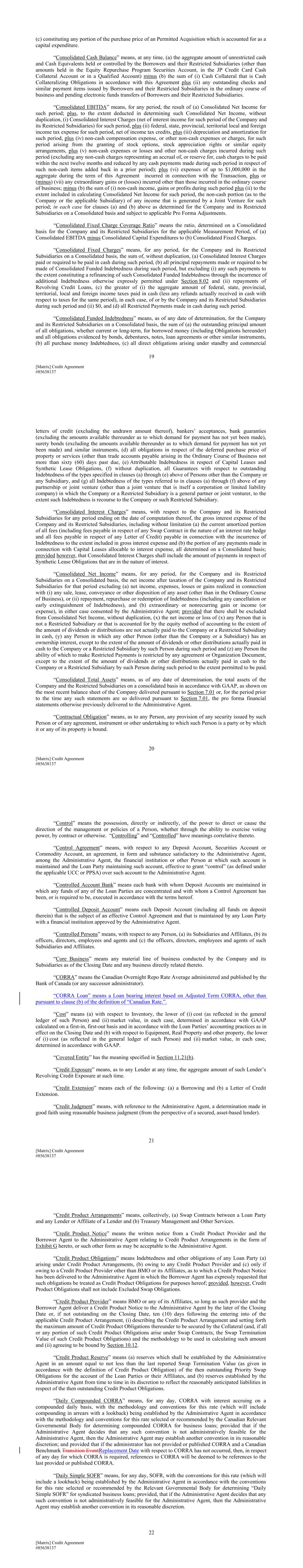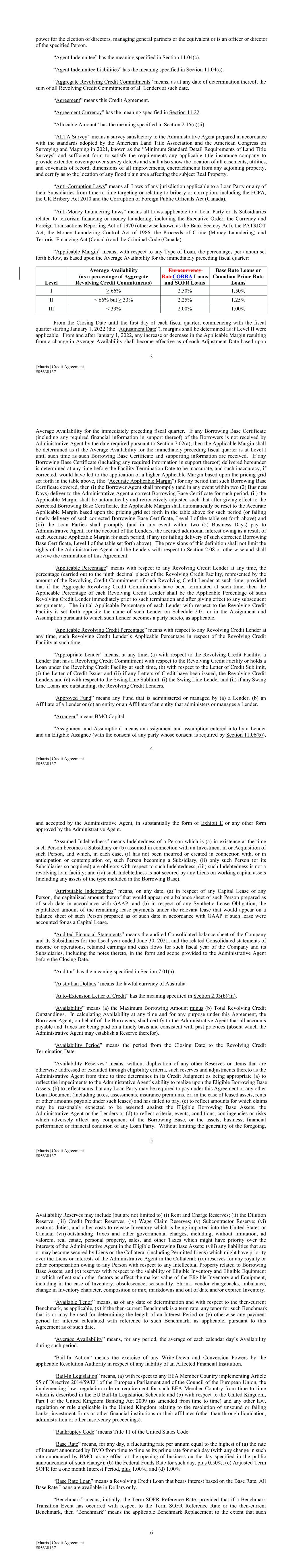 3 [矩阵]信贷协议# 856381371.50% EuroCurrency RateCORRA Loans and SOFR Loans II Base Rate Loans or Canadian Prime Rate Loans < 66% but > 33% 2.25% 1.25% Level I III < 33% > 66% 2.00%平均可用性(占总循环信贷承诺的百分比)1.00% 2.50%从截止日期起至每个财政季度的第一天,从2022年1月1日开始的财政季度(“调整日”)开始,保证金应按适用Level II的方式确定。自2022年1月1日起及之后,因平均可用性的变化而导致适用保证金的任何增加或减少,应根据选举董事、管理普通合伙人或同等人员的权力,或作为指定人员的高级职员或董事,自每个调整日期起生效。“代理受偿人”具有第11.04(c)节规定的含义。“代理受偿人负债”具有第11.04(c)节规定的含义。“总循环信贷承诺”是指,在其确定的任何日期,所有贷款人在该日期的所有循环信贷承诺的总和。“协议”是指这份信贷协议。“协议货币”具有第11.22条规定的含义。“可分配金额”具有第2.15(c)(ii)节规定的含义。“ALTA调查”是指根据美国土地所有权协会和美国测绘大会于2021年通过的标准编制的令行政代理人满意的调查,称为“土地权调查的最低标准细节要求”,以及满足任何适用的所有权保险公司对调查缺陷提供扩展承保范围的要求的充分形式,还应显示所有地役权、公用事业和记录契约的位置、所有改进的尺寸、来自任何相邻财产的侵占,并对影响标的不动产的任何洪泛区所在地进行证明。“反腐败法”是指适用于贷款方或其任何子公司的任何司法管辖区不时针对或与贿赂或腐败有关的所有法律,包括《反海外腐败法》、《2010年英国反贿赂法》和《外国公职人员腐败法》(加拿大)。“反洗钱法”是指适用于贷款方或其子公司的与恐怖主义融资或洗钱有关的所有法律,包括行政命令、1970年《货币和外国交易报告法》(又称《银行保密法》)、《爱国者法案》、1986年《洗钱控制法》、《犯罪所得(洗钱)和恐怖主义融资法案(加拿大)和《刑法》(加拿大)。“适用保证金”是指,就任何类型的贷款而言,以下列出的每年百分比,基于上一财政季度的平均可用性:上一财政季度的平均可用性。如果行政代理人在根据第7.02(a)节要求的日期之前未收到借款人的任何借款基础证书(包括证明其所需的任何财务信息),则应确定适用的保证金,如同上一个财政季度的平均可用性处于I级,直至收到该借款基础证书和证明信息为止。如根据本协议交付的任何借款基础凭证(包括证明其所需的任何信息)在融资终止日期之前的任何时间被确定为不准确,且该不准确如得到纠正,将导致在该借款基础凭证所涵盖的任何期间适用基于上表所列定价网格的更高适用保证金(“准确适用保证金”),则(i)借款人代理人应迅速(无论如何在两(2)个工作日内)向行政代理人交付该期间的正确借款基础凭证,(二)适用保证金应自动追溯调整,使更正后的借款基础凭证生效后,适用保证金应自动重置为基于上表所列该期间的定价网格的准确适用保证金(或未能及时交付该更正后的借款基础凭证,上表所列级别I)和(三)贷款方应迅速(无论如何在两(2)个工作日内)向行政代理人支付,为贷款人的账户,因该期间的该等准确适用保证金而产生的应计额外利息(如有)(或未能交付该更正借款基础凭证, 上述表格的I级)。本定义的规定不应限制行政代理人和贷款人就第2.08条或其他方面的权利,并应在本协议终止后继续有效。“适用百分比”是指就任何循环信贷贷款人而言,在任何时间,循环信贷融资的百分比(执行到小数点后第九位),以该循环信贷贷款人在该时间的循环信贷承诺金额表示;但如果总循环信贷承诺已在该时间终止,则每个循环信贷贷款人的适用百分比应为紧接该终止前和在任何后续转让生效后该循环信贷贷款人的适用百分比,。每个贷款人就循环信贷融资的初始适用百分比在附表2.01或在该贷款人成为本协议当事人所依据的转让和假设(如适用)中与该贷款人的名称相对的地方列出。“适用循环信贷百分比”是指在任何时间就任何循环信贷贷款人而言,该循环信贷贷款人在该时间就循环信贷融资而言的适用百分比。“适当贷款人”是指,在任何时候,(a)就循环信贷融资而言,就循环信贷融资而言,有循环信贷承诺的贷款人或在该时间持有循环信贷融资项下的贷款,(b)就信用证分限额而言,(i)信用证发行人和(ii)如果已签发任何信用证,循环信贷贷款人和(c)就周转额度分限额而言,(i)周转额度贷款人和(ii)如果有任何周转额度贷款未偿还,则为循环信贷贷款人。“认可基金”是指由(a)贷款人、(b)贷款人的关联公司或(c)实体或管理贷款人的实体的关联公司管理或管理的任何基金。“Arranger”是指BMO资本。“转让和承担”是指由贷款人和合格受让人(经第11.06(b)节要求其同意的任何一方同意)、4 [矩阵]信贷协议# 85638137订立并由行政代理人接受的转让和承担,其基本形式为附件 E或行政代理人批准的任何其他形式。“假定债务”是指(a)在该人成为子公司时仍存在的人的债务,或(b)就对该人的投资或收购承担的债务,而在每种情况下,(i)没有因该人成为子公司而发生或产生,或在预期或考虑中,(ii)只有该人(或其如此获得的子公司)是该债务的债务人,(iii)该等债务并非循环贷款融资;及(iv)该等债务并非以营运资金资产(包括借款基础所包括的任何类别的资产)的任何留置权作担保。“应占债务”是指,在任何日期,(a)