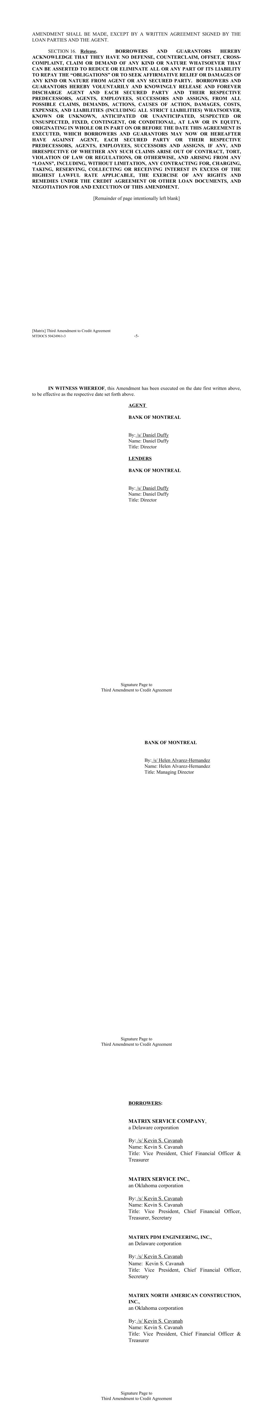 应作出修正,但借款方和代理人签署的书面协议除外。第16节。发布。借款人和担保人在此承认,他们没有任何可以被断言为减少或消除其全部或任何部分偿还“义务”或向代理人或任何被担保方寻求任何种类或性质的肯定救济或损害的任何抗辩、反诉、抵消、交叉申诉、索赔或要求。借款人和担保人在此自愿和知情地从所有可能的索赔、要求、行动、行动、行动原因、损害、成本、费用和负债(包括所有严格负债)中释放和永远解除代理人和每个有担保方及其各自的前任、代理人、雇员、继任者和受让人的责任(包括所有已知或未知的继任者和受让人(如有),无论是否因合同、侵权、违反法律或法规或其他原因产生任何此类索赔,以及产生于任何“贷款”,包括但不限于任何承包、收费、收取、保留、收取或收取超过适用的最高合法利率的利息、行使任何权利和补救措施[页数剩余部分有意留空] [矩阵]信贷协议MTDOCS 50424961v3-5-的第三次修订证人,本修订已于上述首次写入的日期执行,自上述相应日期起生效。蒙特利尔代理银行作者:/s/Daniel Duffy姓名:Daniel Duffy职务:董事LENDERS MONTRAL银行作者:/s/Daniel Duffy姓名:Daniel Duffy职务:蒙特利尔信贷协议银行第三修正案董事签名页作者:/s/Helen Alvarez-Hernandez姓名:Helen Alvarez-Hernandez职务:董事总经理信贷协议借款人第三修正案签名页:Matrix Service Company,a Delaware company by:/s/Kevin S. Cavanah姓名:丨Kevin S. Cavanah Kevin S. Cavanah职务:副总裁、首席财务官兼财务主管Matrix Service INC.,a Oklaha公司by:/s/丨Kevin S。首席财务官、财务主管、秘书MATRIX PDM Engineering,INC.,an Delaware corporation by:/s/Kevin S. Cavanah Name:Kevin S. Cavanah title:Vice President,首席财务官,Secretary MATRIX NORTH AMERICAN CONSTRUCTION,INC.,an Oklahoma corporation by:/s/Kevin S. Cavanah Name:TERM0 KevinS. Cavanah Kevin S. Cavanah title:Vice President,首席财务官 & Treasurer Signature Page to Third Amendment to Credit Agreement