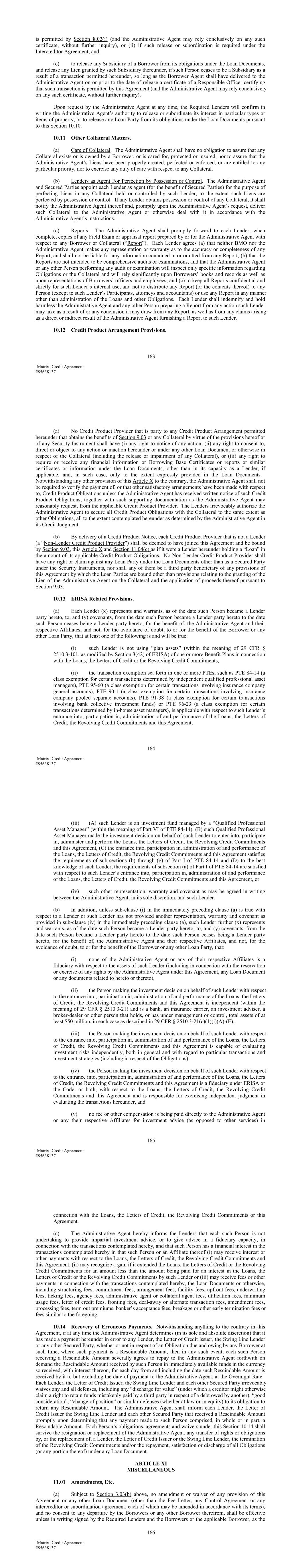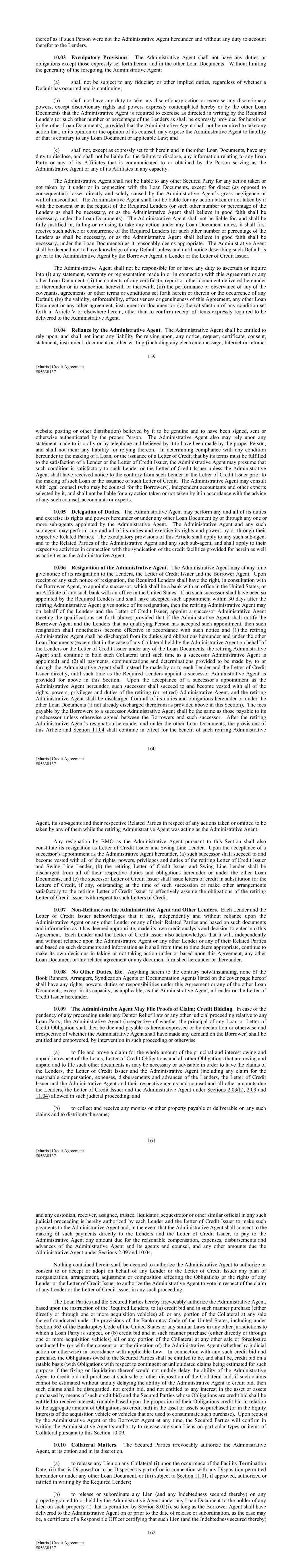 第8.02(i)条所允许的(而行政代理人可最终依赖任何该等证书,而无须进一步查询),或(ii)如根据债权人间协议要求解除或从属;及(c)解除借款人的任何附属公司根据贷款文件所承担的义务,并解除该附属公司根据贷款文件所授予的任何留置权,如该人因根据本协议所允许的交易而不再是附属公司,只要借款人代理人应已在解除之日或之前向行政代理人交付负责官员的证明,证明此类交易是本协议允许的(并且行政代理人可以最终依赖任何此类证明,无需进一步查询)。经行政代理人随时提出要求,所需贷款人将书面确认行政代理人有权解除其在特定类型或财产项目上的权益或使其从属地位,或根据本条第10.10款解除任何贷款方在贷款文件下的义务。10.11其他抵押事项。(a)抵押品的保管。行政代理人没有义务保证任何担保物存在或为借款人所有,或受到照顾、保护或保险,也没有义务保证行政代理人的留置权已经适当设定、完善或强制执行,或有权享有任何特定的优先权,也没有义务对任何担保物行使任何注意义务。(b)出借人作为代理人以管有或控制方式进行完善。行政代理人和有担保当事人指定每个贷款人为代理人(为有担保当事人的利益),目的是完善对该贷款人持有或控制的任何抵押品的留置权,但以此种留置权通过占有或控制完善为限。出借人取得抵押物占有权或者控制权的,应当通知行政代理人,经行政代理人请求,迅速将该抵押物交付行政代理人或者按照行政代理人的指示以其他方式处理。(c)报告。行政代理人就任何借款人或担保物编制或为其编制的任何实地考试或评估报告(“报告”),如完整,应迅速转发给每个贷款人。各贷款人同意(a)BMO或行政代理人概不对任何报告的准确性或完整性作出任何陈述或保证,且不对任何报告中包含或遗漏的任何信息承担责任;(b)该等报告并非旨在进行全面审计或检查,以及执行任何审计或审查的行政代理人或任何其他人将仅检查有关债务或抵押品的具体信息,并将在很大程度上依赖借款人的账簿和记录以及借款人的高级职员和雇员的陈述;以及(c)对所有报告进行保密并严格供该贷款人内部使用,并且不向任何人(该贷款人的参与者、律师和会计师除外)分发任何报告(或其内容)或以管理贷款和其他义务以外的任何方式使用任何报告。每一贷款人应就该贷款人因其可能从任何报告中采取的任何行动或得出的任何结论,以及因该行政代理人向该贷款人提供报告而直接或间接产生的任何索赔,对该行政代理人和编制报告的任何其他人进行赔偿并使其免受损害。10.12信贷产品安排规定。163 [ Matrix ]信贷协议# 85638137(a)任何信贷产品提供者,如是根据本协议允许的任何信贷产品安排的一方,并凭借本协议或任何担保文书的规定获得第9.03条或任何担保品的利益,均不得拥有(i)任何通知任何行动的权利,(ii)任何同意、指示或反对根据本协议或根据任何其他贷款文件或以其他方式就担保品采取的任何作为或不作为的权利(包括任何担保品的解除或减值),或(iii)根据贷款文件要求或接受任何财务资料或借入基本证明或报告或类似证明或资料的任何权利,但如适用,其作为贷款人的身份除外,在这种情况下,仅在贷款文件中明确规定的范围内。尽管本条第十款另有相反规定,但不得要求行政代理人核实信用产品义务的支付情况,或就信用产品义务作出其他满意安排,除非行政代理人已收到该信用产品义务的书面通知, 连同行政代理人可能合理要求的证明文件,向适用的信贷产品提供者提供。出借人不可撤销地授权行政代理人以担保物担保所有信用产品债务,其担保范围与其他债务相同,均为行政代理人在其信用判决中确定的本协议项下设想的范围。(b)通过交付信贷产品通知,每一非贷款人的信贷产品提供者(“非贷款人信贷产品提供者”)应被视为已加入本协议,并受第9.03条、本条第十条和第11.04(c)条的约束,如同其是本协议项下持有其适用信贷产品义务金额的“贷款”的贷款人。除作为担保文书下的担保方外,任何非贷款人信贷产品提供商不得根据贷款单证对任何贷款方享有任何权利或索赔,也不得将其中任何一方作为贷款方受约束的本协议任何条款的第三方受益人,但与根据第9.03节授予行政代理人对担保物的留置权及其收益的适用有关的条款除外。10.13 ERISA相关规定。(a)每名贷款人(x)代表及保证,自该人成为本协议的贷款方之日起至该人不再是本协议的贷款方之日止,为行政代理人及其各自的附属公司的利益,而不是为免生疑问而代表或为借款人或任何其他贷款方的利益,至少有以下一项是真实的,并且将是真实的:(i)该等贷款人没有就贷款、信用证或循环信贷承诺使用一个或多个福利计划的“计划资产”(在29 CFR § 2510.3-101的含义内,经ERISA第3(42)节修改),(ii)一个或多个PTE中规定的交易豁免,例如PTE 84-14(由独立的合格专业资产管理人确定的某些交易的类别豁免),PTE 95-60(涉及保险公司一般账户的某些交易的类别豁免),PTE 90-1(涉及保险公司池独立账户的某些交易的类别豁免)、PTE 91-38(涉及银行集体投资基金的某些交易的类别豁免)或PTE 96-23(由内部资产管理人确定的某些交易的类别豁免),适用于该等贷款人进入、参与、管理和履行贷款、信用证、循环信贷承诺和本协议,164 [矩阵]信贷协议# 85638137(iii)(a)该等贷款人是由“合格的专业资产管理