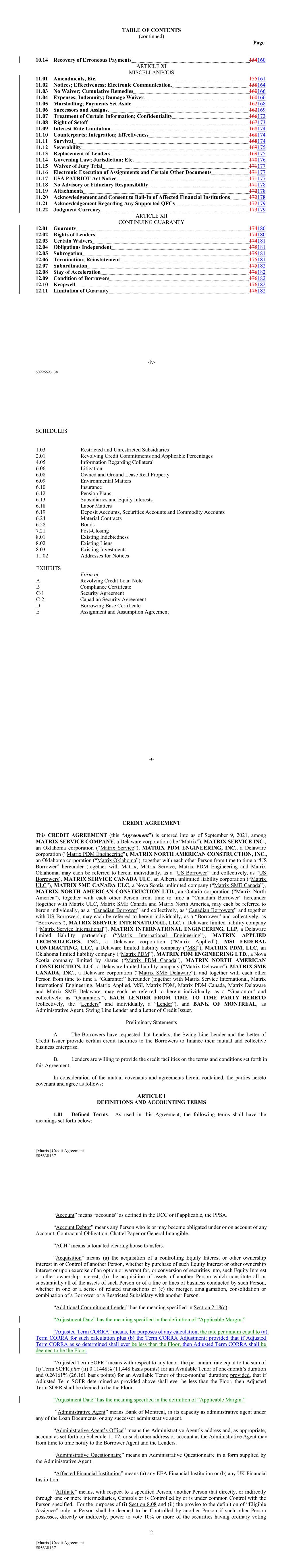 目录(续)page-iv-60996693 _ 3810.14追回误付款项154160条XI杂项11.01修改等15516111.02通知;效力;电子通信。15816411.03不放弃;累计补救16016611.04费用;赔偿;损害免责。16016611.05编组;付款搁置16216811.06继任者和受让人。16216911.07某些信息的处理;保密性16617311.08抵销权16717311.09利率限制16817411.10对应方;整合性;有效性16817411.11生存16817411.12可处置性16917511.13更换贷款人16917511.14管辖法律;管辖权等17017611.15放弃陪审团审判17117711.16转让和某些其他文件的电子执行17117711.17美国爱国者法案通知17117711.18无咨询或信托责任17117811.19附件17217811.20确认及同意受影响的金融机构保释17217811.21关于任何受支持的QFII的确认17217911.22判断货币173179第十二条持续担保12.01担保17418012.02出借人的权利17418012.03某些豁免17418112.04义务独立17518112.05代位求偿17518112.06终止;恢复原状17518112.07从属17518212.08加速中止17618212.09借款人的条件17618212.10 Keepwell 17618212.11担保限额176182-i-7.2 16.09交割后2.01环境事项8.01现有债务循环信用承诺和适用百分比8.0 26.10现有留置权附表保险8.03现有投资11.0 26.12通知的地址4.05养老金计划展览有关抵押品的信息表6.13 A循环信用贷款票据子公司和股权B合规证书6.18 C-1 6.06担保协议劳动事项1.03 C-2加拿大担保协议诉讼6.19 D借款基础凭证存款账户、证券账户和商品账户E转让和承担协议受限制和不受限制的子公司6.246.08拥有的材料合同和地租赁不动产6.28债券信贷协议本信贷协议(本“协议”)自9月9日起订立,2021年,在特拉华州公司Matrix Service Company(“Matrix”)、俄克拉荷马州公司Matrix Service INC.(“美佳工程”)、特拉华州公司Matrix PDM Engineering,INC.(“Matrix PDM Engineering”)、俄克拉荷马州公司Matrix NORTH AMERICAN CONSTRUCTION,INC.(“Matrix Oklahoma”)中,相互之间不时成为本协议项下的“美国借款人”(连同Matrix、美佳工程、Matrix PDM Engineering和Matrix Oklahoma,可在本文中分别称为“美国借款人”,统称为“美国借款人”),Matrix Service Canada新斯科舍无限公司(“Matrix SME Canada”)、安大略省公司MATRIX NORTH AMERICAN CONSTRUCTION LTD.(“Matrix North America”),连同其他不时成为本协议项下“加拿大借款人”的人(连同Matrix ULC、Matrix SME Canada和Matrix North America,可在本文中分别称为“加拿大借款人”,统称为“加拿大借款人”,与美国借款人可在本文中分别单独称为“借款人”,统称为“借款人”)、特拉华州有限责任公司MATRIX SERVICE INTERNATIONAL,LLC(“美佳工程国际”)、MATRIX国际工程,特拉华州有限责任合伙企业(“Matrix International Engineering”)、特拉华州公司Matrix Applied TECHNOLOGIES,INC.(“Matrix Applied”)、特拉华州有限责任公司(“MSI”)、俄克拉荷马州有限责任公司Matrix PDM,LLC(“Matrix PDM”)、新斯科舍股份有限公司Matrix PDM Engineering LTD.(“Matrix PDM Canada”)、特拉华州有限责任公司Matrix NORTH AMERICAN CONSTRUCTION,LLC(“Matrix Delaware”)、特拉华州公司Matrix SME CANADA,INC.(“Matrix SME Delaware”)Matrix PDM Canada(Matrix Delaware)和Matrix SME Delaware(Matrix SME Delaware)可能在本文中分别被称为“担保人”和统称为“担保人”),每个贷款人(统称为“贷款人”和单独的“贷款人”),以及蒙特利尔银行(Bank of MONTRAL)作为行政代理人、周转额度贷款人和信用证发行人。初步声明A.借款人已要求贷款人, 周转额度贷款人和信用证发行人向借款人提供一定的信贷便利,为其相互和集体经营企业融资。B.贷款人愿意根据本协议规定的条款和条件提供信贷便利。考虑到本协议所载的相互盟约和协议,本协议各方约定如下:第一条定义和会计术语1.01定义的术语。本协议中使用的以下术语应具有下述含义:[ Matrix ] Credit Agreement # 85638137“account”是指在UCC或(如适用)PPSA中定义的“账户”。“账户债务人”是指根据或因任何账户、合同义务、动产票据或一般无形资产承担或可能承担义务的任何人。“ACH”是指自动清算所转账。“收购”是指(a)收购另一人的控股股权或其他所有权权益或控制权,无论是通过购买该股权或其他所有权权益,还是在行使该股权或其他所有权权益的期权或认股权证或将证券转换为该股权或其他所有权权益时,(b)收购另一人的资产,这些资产构成该人的全部或基本全部资产或由该人进行的一条或多条业务线,无论是在一项或一系列相关交易中,还是(c)合并、合并,借款人或受限制的附属公司与另一人合并或合并。“额外承诺贷款人”具有第2.18(c)节规定的含义。“调整日期”具有“适用保证金”定义中规定的含义。“调整后的期限CORRA”是指,就任何计算而言,每年的利率等于(a)此类计算的期限CORRA加上(b)期限CORRA调整;前提是,如果如此确定的调整后的期限CORRA永远低于下限,则调整后的期限CORRA应被视为下限。“调整后期限SOFR”是指就任何期限而言,年利率等于(i)期限SOFR加上(ii)一个月期限的可用期限的0.11448%(11.448个基点)和三个月期限的可用期限的0.26161%(26.16 1个基点)之和;但如果按上述规定确定的调整后期限SOFR应始终低于最低限额,则调整后的期限SOFR应被视为最低限额。“调整日期”具有“适用保证金”定义中规定的含义。“行政代理人”是指蒙特利尔银行,以其作为任何贷款文件下的行政代理人的身份,或任何继任的行政代理人。「行政代理人办事处」指附表11.02所列的行政代理人的地址及(视乎情况而定的帐户,或行政代理人可能不时通知借款人代理