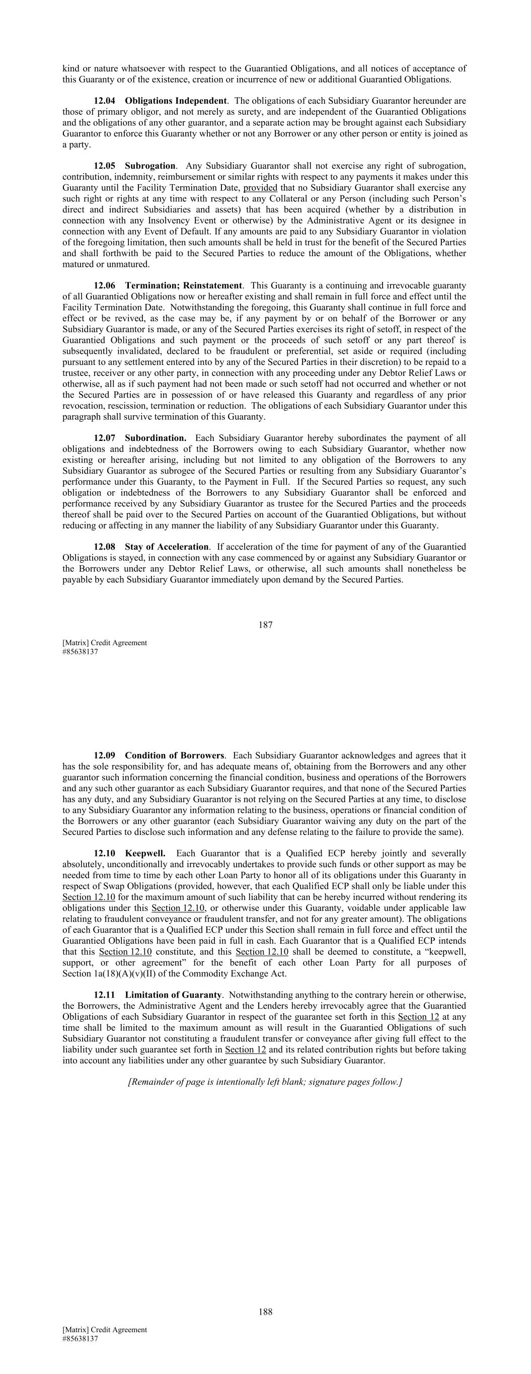 与担保义务有关的任何种类或性质,以及接受本担保或存在、设定或产生新的或额外担保义务的所有通知。12.04义务独立。各附属担保人在本协议项下的义务是主要义务人的义务,而不仅仅是作为担保人,并且独立于担保义务和任何其他担保人的义务,并且可以对各附属担保人单独提起诉讼,以强制执行本担保,无论是否有任何借款人或任何其他个人或实体作为一方加入。12.05代位权。任何附属担保人在融资终止日期之前,不得就其根据本担保支付的任何款项行使任何代位权、分担、赔偿、偿还或类似权利,但任何附属担保人不得在任何时候就行政代理人或其指定人就任何违约事件获得的任何抵押品或任何人(包括该人的直接和间接子公司和资产)行使任何该等权利或权利。如果违反上述限制向任何附属担保人支付了任何金额,则这些金额应为有担保当事人的利益以信托形式持有,并应立即支付给有担保当事人以减少债务的金额,无论到期或未到期。12.06终止;复职。本担保是对现在或以后存在的所有担保义务的持续和不可撤销的担保,并应在融资终止日期之前保持完全有效。尽管有上述规定,如果由借款人或任何附属担保人或代表借款人或任何附属担保人支付任何款项,或任何有担保当事人就担保债务行使其抵销权,并且该等付款或该抵销的收益或其任何部分随后被作废、被宣布为欺诈或优惠,则本担保应继续完全有效或恢复(视情况而定),搁置或要求(包括根据任何有担保当事人酌情订立的任何和解)向受托人、接管人或任何其他当事人偿还,与根据任何债务人救济法或其他方式进行的任何程序有关,所有这些如同未支付或未发生此种抵销,无论有担保当事人是否拥有或已解除此担保,也不论任何先前的撤销、撤销、终止或减少。各附属担保人在本款项下的义务在本担保终止后继续有效。12.07从属。各附属担保人特此将借款人欠各附属担保人的所有义务和债务的支付,无论是现在存在的还是以后产生的,包括但不限于借款人作为有担保当事人的代位受让人或任何附属担保人履行本担保项下所产生的对任何附属担保人的任何义务,从属于全额支付。有担保当事人提出请求的,借款人对任何附属担保人的任何该等义务或债务应予强制执行,任何附属担保人作为有担保当事人的受托人所收到的履行及其收益应因担保义务而付予有担保当事人,但不以任何方式减少或影响任何附属担保人在本担保项下的责任。12.08保持加速。如果任何担保债务的加速支付时间被搁置,与任何附属担保人或借款人根据任何债务人救济法启动或针对任何债务人救济法律启动的任何案件有关,或以其他方式,所有这些金额仍应由每个附属担保人在有担保当事人提出要求后立即支付。187 [矩阵]授信协议# 8563813712.09借款人条件。各附属担保人承认并同意,其对从借款人和任何其他担保人处获得各附属担保人所要求的有关借款人和任何其他担保人的财务状况、业务和运营的信息负有唯一责任,并拥有充分的手段,且任何有担保当事人均无任何义务,任何附属担保人均不依赖于任何有担保当事人,向任何附属担保人披露与业务有关的任何信息, 借款人或任何其他担保人的运营或财务状况(各附属担保人免除担保方披露此类信息的任何义务以及与未能提供此类信息有关的任何抗辩)。12.10 Keepwell。作为合格ECP的每一担保人在此共同和个别地绝对、无条件和不可撤销地承诺提供彼此贷款方可能不时需要的资金或其他支持,以履行其在本担保项下与互换义务有关的所有义务(但前提是,每一合格ECP仅应根据本条第12.10条对在此可承担的此类责任的最高金额承担责任,而无需根据本条第12.10条或以其他方式根据本担保承担义务,根据与欺诈性转让或欺诈性转让有关的适用法律可作废,且不得以任何更大的金额作废)。作为符合条件的ECP的每一担保人在本节项下的义务应保持完全有效,直至以现金全额支付担保义务为止。作为合格ECP的每个担保人都打算将本第12.10条构成,并且本第12.10条应被视为构成为《商品交易法》第1a(18)(a)(v)(II)条的所有目的而为彼此贷款方的利益而订立的“keepwell、支持或其他协议”。12.11担保时效。尽管本文中有任何相反的内容或其他情况,借款人,行政代理人和贷款人在此不可撤销地同意,各附属担保人在任何时候就本条第12款规定的担保所承担的担保义务,在充分落实第12款规定的该担保项下的责任及其相关分担权之后,但在考虑到该附属担保人在任何其他担保项下的任何责任之前,应以导致该附属担保人的担保义务不构成欺诈性转让或转让的最高金额为限。【页面剩余部分故意留空;签名页跟随。】188 [矩阵]信用协议# 85638137