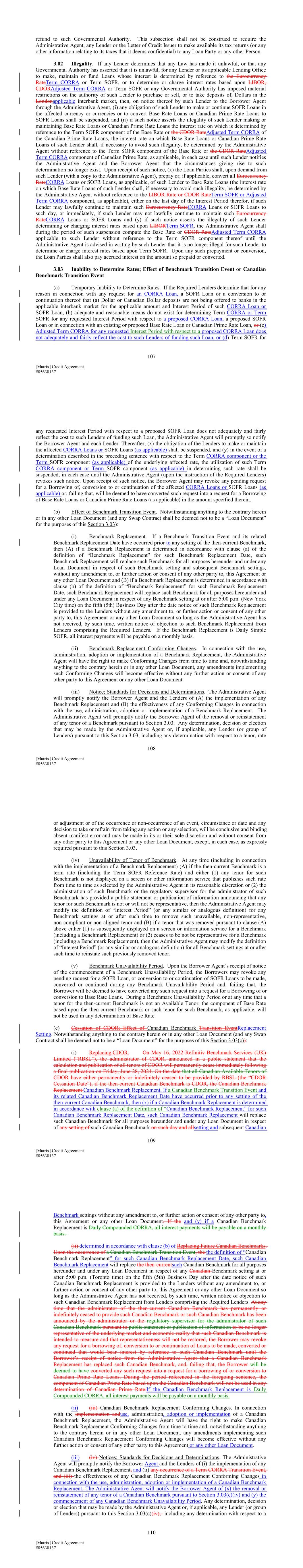 期限、费率或调整,或事件、情况或日期的发生或不发生,以及采取或不采取任何行动或任何选择的任何决定,在没有明显错误的情况下,将是决定性和具有约束力的,可由其或其自行酌情决定,无需征得本协议或任何其他贷款文件的任何其他方的同意,但在每种情况下,根据本第3.03(c)(iv)条明确要求的除外。(四)(五)加拿大无法获得加拿大基准的期限。尽管本文或任何其他贷款文件中有任何相反的规定,但在任何时候(包括与实施加拿大基准更换有关的情况),(a)如果当时的当时的当时的加拿大基准是定期利率(包括Term CORRA或CDOR),然后(i))或(1)该加拿大基准的任何期限未显示在不时公布行政代理人选定的该等费率的屏幕或其他信息服务上,可解除其合理酌情权的任何期限,或(2)该加拿大基准的管理人的监管主管因已提供公开声明或发布信息,宣布该加拿大基准的任何期限不具有或将不具有代表性,然后,行政代理人可以在该时间或之后修改任何加拿大基准设置的“利息期”(或任何类似或类似定义)的定义,以删除此类不可用或不具代表性的期限,以及(b)如果根据上述第(1)款(a)项被删除的期限随后显示在加拿大基准(包括加拿大基准替换)设置的屏幕或信息服务上,并且(ii)或(2)不是或不再是,但须公告其不代表或将不代表加拿大基准(包括加拿大基准替换),然后,行政代理人可以在该时间或之后修改所有加拿大基准设置的“利息期”(或任何类似或类似的定义)的定义,以恢复加拿大基准设置的任何此类先前取消的期限(包括加拿大基准替换)。(vi)次级期限CORRA转换。尽管本文或任何贷款文件中有任何相反的规定,并在符合本条款以下但书的情况下,如果发生了CORRA期限转换事件及其相关的CORRA期限转换日期,则在该期限CORRA转换日期(i)及之后,该定义第(1)(a)款中所述的加拿大基准替换将在本协议项下或任何贷款文件项下就该日期的任何设定及随后的所有设定取代当时的加拿大基准,而无需对,或本协议或任何其他贷款文件的任何其他方的进一步行动或同意;及(ii)每笔在CORRA过渡期未偿还的、按当时现行加拿大基准计息的贷款应在当时的付息期的最后一天转换,成该定义第(1)(a)款所述的按加拿大基准替换计息的贷款,其期限与紧接转换前适用于该贷款的付息期或借款人可能选择并经行政代理人同意的其他加拿大可用期限大致相同;但除非行政代理人已向贷款人和借款人交付定期CORRA通知,且只要行政代理人未收到,则本(v)款不具有效力,在CORRA期限通知日期后的第五(5)个营业日下午5:00(多伦多时间)之前,由所需贷款人或借款人组成的贷款人发出反对此类转换为CORRA期限的书面通知。(五)加拿大基准不可用期限。在借款人代理收到加拿大基准不可用期间开始的通知后,加拿大111 [矩阵]信贷协议# 85638137借款人可以撤销在任何加拿大基准不可用期间提出、转换为或继续进行CORRA贷款的任何未决请求,CORRA贷款的利率类型是参照当时的加拿大基准确定的,否则,加拿大借款人将被视为已将任何此类请求转换为借入或转换为加拿大最优惠利率贷款的请求。3.04成本增加。(a)成本普遍增加。法律发生变更的,应当:(i)对其资产、存放于其账户或为其账户的存款、发放或参与的信贷施加、修改或认为适用任何准备金、专项存款、强制贷款、保险费或类似要求, 任何贷款人(第3.04(e)条所设想的任何准备金要求除外)或信用证发行人;(ii)使任何贷款人或信用证发行人就本协议、任何信用证、任何参与信用证、任何欧元汇率CORRA贷款或其作出的任何SOFR贷款承担任何种类的税项,或更改就该协议向该贷款人或信用证发行人支付的款项的课税基础(第3.01条所涵盖的弥偿税项或其他税项除外,以及征收,(iii)向任何贷款人或信用证发行人或伦敦适用的银行间市场施加影响本协议的任何其他条件、成本或费用,Eurocurrency RateCORRA贷款或由该贷款人提供的SOFR贷款或任何信用证或参与其中;而上述任何一种情况的结果应是增加该贷款人提供或维持任何贷款的成本,而该贷款的利息是参照LIBOR或Term SOFR确定的(或维持其提供任何此类贷款的义务),或增加该贷款人或信用证发行人发行或维持任何信用证的成本(或维持其发行任何信用证的义务),或减少该贷款人或信用证发行人根据本协议收到或应收的任何款项的金额(不论本金、利息或任何其他金额),然后,应该贷款人或信用证发行人的要求,贷款方将向该贷款人或信用证发行人(视情况而定)支付额外的金额,以补偿该贷款人或信用证发行人(视情况而定)所招致或遭受的额外费用。(b)资本要求。如任何贷款人或信用证发行人确定影响该贷款人或信用证发行人或该贷款人或该贷款人的任何贷款办事处或该贷款人或该信用证发行人的控股公司(如有)有关资本或流动性要求的任何法律变更已经或将会产生因本协议而降低该贷款人或该信用证发行人的资本或该信用证发行人的控股公司(如有)的资本回报率的影响,该等贷款人的循环信贷承诺或该等贷款人作出的贷款或参与其持有的信用证,或信用证发行人签发的信用证,至低于该贷款人或信用证发行人或该贷款人或信用证发行人的控股公司本可达到的水平,但若无此类法律变更(考虑到该贷款人或信用证发行人的政策以及该贷款人或信用证发行人的控股公司关于资本112 [矩阵]信贷协议# 85638137充足性的政策),则贷款方将不时根