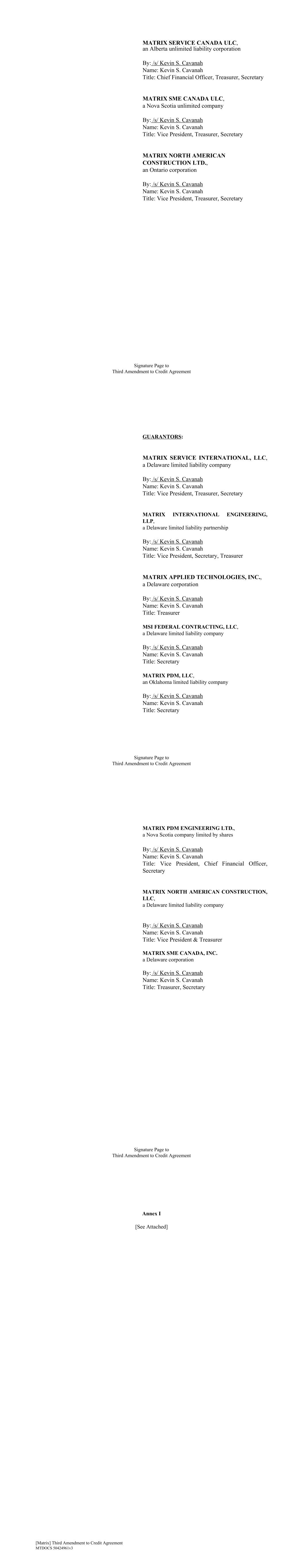 Matrix Service Canada ULC,一家艾伯塔省无限责任公司,由:/s/Kevin S. Cavanah Name:attract:matrix SME CANADA ULC,a Nova Scotia Unlimited Company by:/s/Kevin S. Cavanah Name:Kevin S. Cavanah Title:Vice President,Treasury,Secretary Matrix NORTH AMERICAN CONSTRUCTION LTD.,an Ontario Corporation by:/s/Kevin S. Cavanah Name:title:Vice President,Treasury,Secretary Signature Page to Third Amendment to Credit Agreement Guarantors:MatrCavanah财务主管,Secretary MATRIX INTERNATIONAL Engineering,LLP,a Delaware limited liability partnership by:/s/Kevin S. Cavanah Name:Kevin S. Cavanah Title:Vice President,Secretary,Treasurer MATRIX Applied TECHNOLOGIES,INC.,a Delaware company by:/s/Kevin S. Cavanah Name:Kevin S. Cavanah title:Treasurer TERM0 MSI MSI FEDERAL CONTRACTING,LLC,a Delaware limited liability company by:/s/Kevin S. Cavanah Name:TERM0 Kevin S. Cavanah Kevin S. Cavanah Title:Secretary MATRIX PDM,LLC,an Oklahoma Nova Scotia股份有限公司by:/s/Kevin S. Cavanah Name:Kevin S. Cavanah Title:Vice President,首席财务官,Kevin S. Cavanah Secretary MATRIX NORTH AMERICAN CONSTRUCTION,LLC,a Delaware limited limited liability company by:/s/Kevin S. Cavanah Name:Kevin S. Cavanah Title:Vice President & Treasurer MATRIX SME CANADA,INC. a Delaware corporation by:/s/Kevin S. Cavanah Name:TERM0 Kevin S. Cavanah TERM6 Title:Treasurer,Secretary Signature Page to Third Amendment to Credit Agreement Annex I [见附件] [ Matrix ] Third Am
