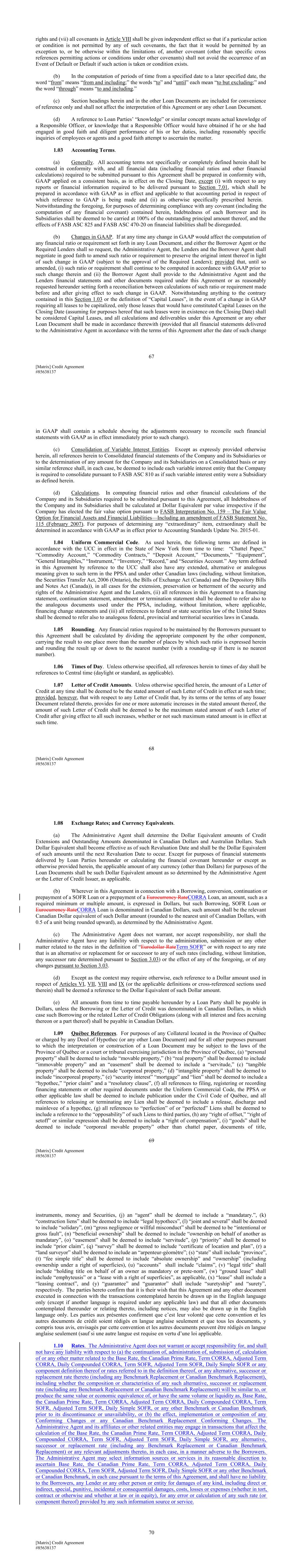 权利和(vii)第VIII条中的所有契诺应被赋予独立效力,以便如果某一特定行动或条件不被任何此类契诺所允许,则该行动或条件将被另一契诺的例外允许或以其他方式在另一契诺的限制范围内(除了允许其他契诺下的行动或条件的特定交叉引用)这一事实不应避免违约或违约事件的发生,如果采取了此类行动或条件存在。(b)在计算从指定日期到较后指定日期的时间段时,“从”一词表示“从并包括”;“到”和“直到”各表示“到但不包括”;“通过”一词表示“到并包括”。(c)此处和其他贷款文件中的章节标题仅为便于参考而列入,不影响对本协议或任何其他贷款文件的解释。(d)提及贷款方的“知情”或类似概念是指对负责官员的实际知情,或如果负责官员本着诚意和勤勉地履行其职责,包括对雇员或代理人进行合理具体的询问以及为查明该事项而进行的善意尝试,他或她本会获得的知情。1.03会计术语。(a)一般而言。此处未具体或完全定义的所有会计术语均应按照,根据本协议要求提交的所有财务数据(包括财务比率和其他财务计算)均应按照在一致基础上适用的公认会计原则编制,如在截止日期生效,但(i)根据第7.01节要求提交的任何报告或财务信息除外,应根据有效的公认会计原则编制,并适用于正在提及公认会计原则的会计期间,以及(ii)本文另有具体规定。尽管有上述规定,为确定遵守此处所载的任何契诺(包括计算任何财务契诺),每个借款人及其子公司的债务应被视为按其未偿本金金额的100%列账,应忽略FASB ASC 825和FASB ASC 470-20对金融负债的影响。(b)公认会计原则的变化。如果在任何时候,GAAP的任何变化将影响任何贷款文件中规定的任何财务比率或要求的计算,而借款人代理人或被要求的贷款人应提出要求,则行政代理人、贷款人和借款人代理人应本着诚意协商,根据GAAP的此类变化修改该比率或要求,以保持其原意(以被要求的贷款人的批准为前提);但在如此修改之前,(i)该等比率或要求应在该等变动前继续按照公认会计原则计算,及(ii)借款人代理人应向行政代理人及贷款人提供本协议所要求或根据本协议合理要求的财务报表及其他文件,列明在该等比率或要求的计算在使该等变动在公认会计原则生效之前及之后作出的调节。尽管本条第1.03款或“资本租赁”的定义中有任何相反的规定,如果GAAP发生变化,要求所有租赁资本化,则只有那些在截止日期本应构成资本租赁的租赁(为本协议的目的,假设此类租赁在截止日期存在)才应被视为资本租赁,本协议或任何其他贷款文件项下的所有计算和可交付成果均应按照该协议进行(前提是在此类变更日期之后根据本协议条款交付给行政代理人的所有财务报表67 [ Matrix ] GAAP中的信用协议# 85638137应包含一份附表,其中显示为使此类财务报表与紧接此类变更之前有效的GAAP进行核对所需的调整)。(c)合并可变利益实体。除本文另有明确规定外,本文中所有提及公司及其子公司的合并财务报表或确定公司及其子公司在合并基础上的任何金额或任何类似提及,在每种情况下均应被视为包括公司根据FASB ASC 810被要求合并的每个可变利益实体,如同该可变利益实体是本文定义的子公司一样。(d)计算。在计算财务比率和根据本协议要求提交的公司及其子公司的其他财务计算中, 公司及其子公司的所有债务均应按等值美元面值计算,无论公司是否已根据FASB解释第159号——金融资产和金融负债的公允价值选择权——包括对FASB声明第115号(2007年2月)的修订选择了公允价值选择权。为确定任何“非常”项目,非常应根据会计准则更新第201-01号之前有效的公认会计原则确定。1.04统一商法典。如本文所用,以下术语是根据纽约州不时生效的UCC定义的:“动产票据”、“商品账户”、“商品合同”、“存款账户”、“文件”、“设备”、“一般无形资产”、“工具”、“存货”、“记录”和“证券账户”。本协议中通过提及UCC定义的任何术语还应具有PPSA和其他加拿大法律(包括但不限于2006年《证券转让法》(安大略省)、《交易法》(加拿大)和《存托票据和票据法案》(加拿大))中赋予该术语的任何扩展、替代或类似含义,在所有情况下均用于延长、保全或改善行政代理人和贷款人的担保和权利,(ii)本协议中所有提及融资声明、延续声明,修正或终止声明应被视为也提及PPSA下使用的类似文件,包括但不限于适用的融资变更声明,以及(iii)所有提及美国联邦或州证券法的行为应被视为也提及加拿大类似的联邦、省和地区证券法。1.05四舍五入。借款人根据本协议要求保持的任何财务比率,应通过将适当部分除以另一部分计算得出,将结果带到比此处表示该比率的地方数多一个地方,并将结果向上或向下四舍五入到最接近的数字(如果没有最接近的数字,则四舍五入)。每日1.06次。除非另有说明,本文对一天中时间的所有引用均应是对中部时间(如适用,为日光或标准时间)的引用。1.07信用证金额。除本文另有规定外,任何时候的信用证金额均应被视为当时有效的该信用证的规定金额;但条件是,就任何信用证而言,根据其条款或与之相关的任何发行人单证的条款,规定其规定金额的一次或多次自动增加,则该信用证的金额应被视为该信用证在所有该等增加生效后规定的最高金额,无论该最高规定金额在此时是否有效。68 [矩阵]信用协议# 856381371.08