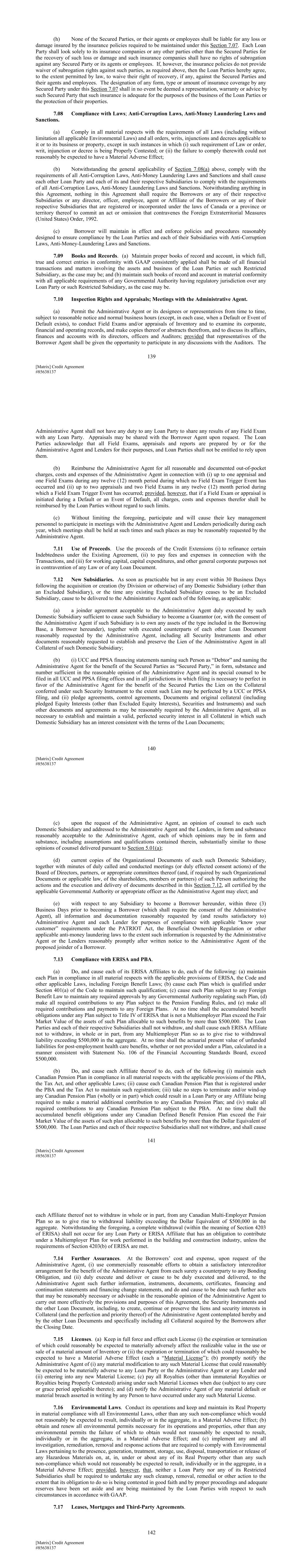 (h)任何有担保当事人或其代理人或雇员均不对根据本条第7.07条要求维持的保险单所承保的任何损失或损害承担责任。每一贷款方应仅向其保险公司或除担保方以外的任何其他方寻求此类损失或损害的追偿,且该等保险公司对任何担保方或其代理人或雇员不享有代位权。但是,如果保险单未按上述要求规定放弃对这类当事人的代位求偿权,则贷款当事人特此同意,在法律允许的范围内,放弃对有担保当事人及其代理人和雇员的任何追偿权(如有)。任何有担保方根据本条第7.07款指定任何形式、类型或保险范围的金额,在任何情况下均不应被视为该有担保方关于此类保险足以用于贷款方的业务或保护其财产的陈述、保证或建议。7.08遵纪守法;反腐败法、反洗钱法和制裁。(a)在所有重大方面遵守所有法律(包括但不限于所有适用的环境法)的要求以及适用于其或适用于其业务或财产的所有命令、令状、强制令和法令,但(i)法律或命令、令状、强制令或法令的此类要求正在受到适当争议的情况除外;或(ii)不能合理地预期不遵守这些要求会产生重大不利影响;(b)尽管上述第7.08(a)条普遍适用,但遵守所有反腐败法律的要求,反洗钱法律和制裁,并应促使对方贷款方及其各自及其子公司遵守所有反腐败法律、反洗钱法律和制裁的要求。尽管本协议有任何规定,本协议中的任何规定均不得要求借款人或其各自的任何子公司或借款人的任何董事、高级职员、雇员、代理人或关联公司或其各自根据加拿大或其某省或地区的法律注册或注册成立的任何子公司实施违反1992年《外国治外措施(美国)令》的作为或不作为。(c)借款人将保持有效并执行合理设计的政策和程序,以确保贷款方及其每个子公司遵守反腐败法、反洗钱法和制裁。7.09书籍和记录。(a)保持适当的记录和账簿,其中应按照一贯适用的公认会计原则对涉及贷款方或此类受限子公司(视情况而定)的资产和业务的所有财务交易和事项进行完整、真实和正确的分录;(b)保持此类记录和账簿在实质上符合对任何贷款方或此类受限子公司(视情况而定)具有监管管辖权的任何政府当局的所有适用要求。7.10检查权利和评估;与行政代理人的会议。(a)允许行政代理人或其指定人员或代表在合理通知和正常营业时间的情况下(在每种情况下,当存在违约或违约事件时除外)不时对库存进行实地检查和/或评估,并检查其公司、财务和经营记录,并制作其副本或摘要,并与其董事、高级职员和审计员讨论其事务、财务和账目;但借款人代理人的代表应有机会参与与审计员的任何讨论。139 [矩阵]信贷协议# 85638137行政代理人对任何贷款方没有义务与任何贷款方分享任何实地考试的结果。评估可应要求与借款人代理人共享。贷款方承认,所有实地考试、评估和报告均由行政代理人和贷款人为其目的编制或为其编制,贷款方无权依赖它们。(b)向行政代理人偿还行政代理人与(i)在没有发生外地考试触发事件的任何十二(12)个月期间最多一次评估和一次外地考试有关的所有合理和有文件证明的自付费用、成本和开支,以及(ii)在发生外地考试触发事件的任何十二(12)个月期间最多两次评估和两次外地考试;但前提是,如果在违约或违约事件期间启动了外地考试或评估,则所有费用, 相关成本和费用应由贷款方偿还,不考虑此类限制。(c)在不限制前述规定的情况下,参加并将促使其关键管理人员在每年期间定期参加与行政代理人和贷款人的会议,哪些会议应在行政代理人合理要求的时间和地点举行。7.11收益用途。将信贷展期所得款项(i)用于为现有协议项下的某些债务再融资,(ii)支付与交易有关的费用和开支,以及(iii)用于营运资金、资本支出以及不违反任何法律或任何贷款文件的其他一般公司用途。7.12新设子公司。在切实可行范围内尽快但无论如何在任何国内子公司(除被排除的子公司外)收购或创建(通过分割或其他方式)后30个营业日内,或任何现有的被排除的子公司不再是被排除的子公司时,安排向行政代理人交付以下各项(如适用):(a)由该国内子公司正式签立的行政代理人可接受的合并协议,足以导致该子公司成为担保人(或,经行政代理人同意,如果该子公司要拥有借款基础中包含的任何类型的资产,则为本协议项下的借款人),连同行政代理人合理要求的彼此已执行的对应借款文件,包括合理要求的所有担保工具和其他文件,以建立和维护行政代理人在该境内子公司的所有抵押品上的留置权;(b)(i)将该人命名为“债务人”,并将为担保方利益的行政代理人命名为“担保方”,行政代理人及其特别顾问合理认为足以在所有UCC和PPSA备案处备案的形式、实质和数量上,以及在为有担保方的利益完善有利于行政代理人的该等担保文书下授予的担保物的留置权所必需的所有司法管辖区,只要该留置权可以通过UCC或PPSA备案予以完善,以及(ii)质押协议、控制协议、文件和原始担保物(包括质押的股权(不包括股权),证券和票据)以及行政代理人可能合理要求的其他文件和协议,均视需要在该境内子公司拥有权益的所有抵押品上建立和维持与贷款文件条款一致的有效、完善的担保权益;140 [矩阵]信贷协议# 85638137(c)应行政代理人的请求,向每一该等境内子公司提供律师意见并发给行政代理人和贷款人,其形式和实质均为行政代理人合理接受,每一项意见的形式和实