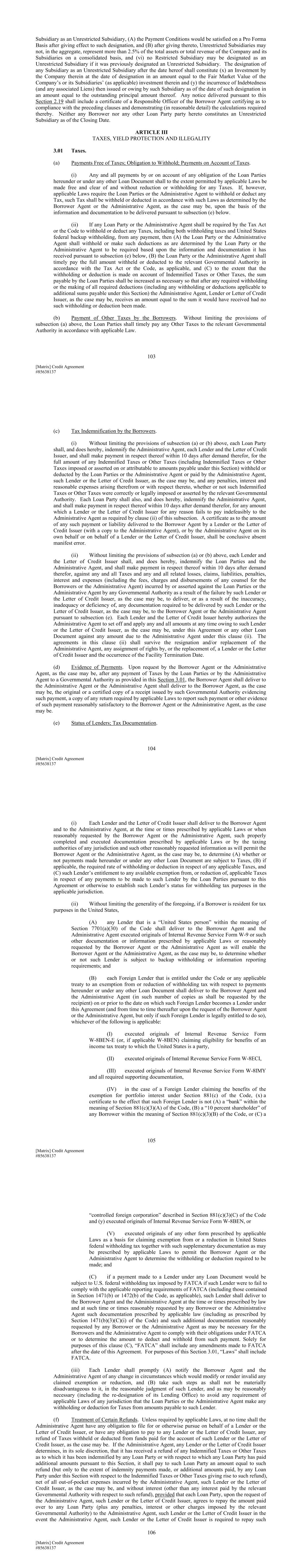 附属公司作为非受限制附属公司,(a)付款条件在作出该等指定后将在备考基础上获得满足,及(b)在作出该等指定后,非受限制附属公司合计不得占公司及其附属公司综合基础上的总资产或总收入的2.5%以上,及(vi)任何受限制附属公司如先前被指定为非受限制附属公司,则不得被指定为非受限制附属公司。在本协议日期后指定任何附属公司为非受限制附属公司,将构成(x)公司于指定日期对其进行的投资,金额相当于公司或其附属公司(如适用)在其中的投资的公平市场价值,以及(y)该附属公司于该指定日期当时发行或欠下的债务(及任何相关留置权)的产生,金额相当于其未偿还本金。依据本条第2.19款交付的任何通知,应包括借款人代理人负责官员的证书,证明遵守上述条款,并(在合理的细节上)证明由此所需的计算。截至截止日,本协议的任何借款人或任何其他贷款方均不构成无限制附属公司。第三条征税、产量保护和非法性3.01征税。(a)免税付款;代扣代缴义务;因应纳税而付款。(i)贷款方根据本协议或根据任何其他贷款文件所承担的任何义务所支付的任何和所有款项,应在适用法律允许的范围内,免于和清除任何税款,且不减免或预扣任何税款。但是,如果适用的法律要求贷款当事人或行政代理人代扣代缴或扣除任何税款,则应根据借款人代理人或行政代理人(视情况而定)根据根据下文(e)款提供的资料和文件确定的法律代扣代缴或扣除此类税款。(ii)如《税法》或《守则》要求任何贷款方或行政代理人从任何付款中预扣或扣除任何税款,包括预扣税和美国联邦备用预扣税,则(a)贷款方或行政代理人应根据其根据下文(e)款收到的信息和文件,预扣或作出贷款方或行政代理人确定的所要求的扣除,(b)贷款方或行政代理人应根据《税法》或《守则》(如适用)及时向有关政府当局支付全额代扣代缴或扣除的款项,以及(c)在代扣代缴或扣除是因赔偿税款或其他税款的情况下,贷款方应支付的款项应视需要增加,以便在任何必要的代扣代缴或作出所有必要的扣除(包括适用于根据本条应支付的额外款项的任何代扣代缴或扣除)后,行政代理人,贷款人或信用证发行人(视情况而定)收到的金额等于如果不进行此类预扣或扣除,它本应收到的金额。(b)借款人缴纳其他税款。在不限制上述(a)款规定的情况下,贷款方应根据适用法律及时向相关政府当局缴纳任何其他税款。103 [矩阵]信贷协议# 85638137(c)借款人的税务赔偿。(i)在不限制上述(a)或(b)款的规定的情况下,各贷款方须并确实在此向行政代理人、各贷款人及信用证发行人作出赔偿,并须在要求后10天内就该等赔偿而支付由贷款方或行政代理人代扣代缴或扣除或由该行政代理人、该贷款人或信用证发行人支付的任何已获赔偿税款或其他税款(包括已获赔偿税款或根据本条征收或主张征收或可归因于根据本条应付款项的其他税款)的全数,视情况而定,以及由此产生或与之有关的任何罚款、利息及合理开支,不论有关政府当局是否正确或合法地征收或主张征收该等弥偿税款或其他税项。各贷款方还应,并在此作出赔偿,行政代理人,并应在要求后10天内支付有关款项, 就贷款人或信用证发行人因任何理由未能按本款第(ii)款规定向行政代理人以不可撤销方式支付的任何款项。由贷款人或信用证发行人(附一份副本给行政代理人),或由行政代理人代表自己或代表贷款人或信用证发行人交付给借款人代理人的任何该等付款或负债的金额的证明,在没有明显错误的情况下,应为结论性的。(ii)在不限制上述(a)或(b)款条文的情况下,各贷款人及信用证发行人须并确实在此向贷款方及行政代理人作出赔偿,并须在要求后10天内就任何及所有税项及任何及所有有关的损失、索偿、法律责任、罚款、利息及开支(包括费用、借款人或行政代理人的任何法律顾问的费用及付款)因该贷款人或信用证发行人(视属何情况而定)未能根据(e)款向借款人代理人或行政代理人交付或由于该贷款人或信用证发行人(视属何情况而定)所要求交付的任何文件不准确、不充分或不足而招致或由任何政府当局向贷款方或行政代理人主张。各贷款人及信用证发行人特此授权行政代理人根据本协议或任何其他贷款文件(视情况而定)在任何时间抵销及适用欠该贷款人或信用证发行人的任何及所有款项,以抵销根据本条款(ii)项应付行政代理人的任何款项。第(ii)款中的协议应在行政代理人辞职和/或更换、贷款人或信用证发行人的任何权利转让或更换以及融资终止日期发生后继续有效。(d)付款证据。经借款人代理人或行政代理人(视情况而定)要求,在贷款方或行政代理人按本条第3.01款规定向某一政府机关缴纳税款后,借款人代理人应当向该行政机关交付或者行政机关应当向借款人代理人(视情况而定)交付该政府机关出具的证明该项缴纳的收据的原件或者经核证的副本,适用法律规定的任何申报表的副本,以报告借款人代理人或行政代理人(视属何情况而定)合理满意的该等付款或该等付款的其他证据。(e)贷款人的地位;税务文件。104 [矩阵]信贷协议# 85638137(i)各贷款人和信用证发行人应在适用法律规定的一个或多个时间,或在借款人代理人或行政代理人合理要求时,向借款人代理人和行政代理人交付适用法律或任何司法管辖区税务机关规定的适当填写和执行的文件,以及借款人代理