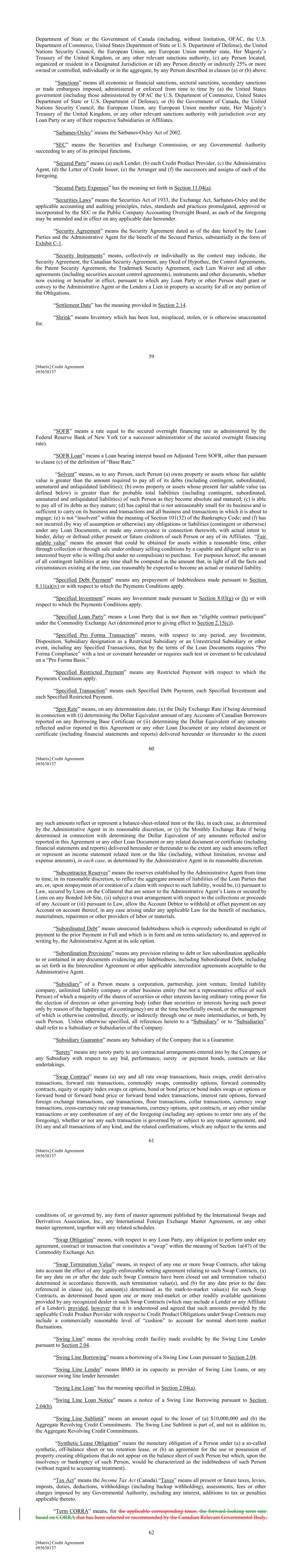 国务院或加拿大政府(包括但不限于OFAC、美国商务部、美国国务院或美国国防部)、联合国安全理事会、欧盟、任何欧盟成员国、英国女王陛下财政部或任何其他相关制裁当局,(c)位于、组织或居住在指定司法管辖区的任何人,或(d)由上述(a)或(b)条所述任何人直接或间接拥有或控制25%或以上的个人或合计拥有或控制的任何人。“制裁”是指(a)美国政府(包括由OFAC、美国商务部、美国国务院或美国国防部管理的制裁),或(b)加拿大政府、联合国安全理事会、欧盟、任何欧盟成员国、英国女王陛下财政部或对任何贷款方或其各自的任何子公司或关联公司具有管辖权的任何其他相关制裁机构不时实施、管理或执行的所有经济或金融制裁、部门制裁、二级制裁或贸易禁运。“萨班斯-奥克斯利法案”意指2002年《萨班斯-奥克斯利法案》。“SEC”是指证券交易委员会,或接替其任何主要职能的任何政府机构。“担保方”是指(a)每一贷款人、(b)每一信贷产品提供者、(c)行政代理人、(d)信用证发行人、(e)安排人和(f)上述每一项的继承人和受让人。“担保方费用”具有第11.04(a)节规定的含义。“证券法”是指1933年《证券法》、《交易法》、《萨班斯-奥克斯利法案》以及SEC或上市公司会计监督委员会颁布、批准或纳入的适用会计和审计原则、规则、标准和惯例,因为上述每一项都可能被修订,并在本协议下的任何适用日期生效。“担保协议”是指贷款方和为担保方利益的行政代理人于本协议签署之日签署的担保协议,其实质形式为附件 C-1。“担保文书”是指担保协议、加拿大担保协议、Hypothec的任何契据、控制协议、专利担保协议、商标担保协议、每一项留置权豁免和所有其他协议(包括证券账户控制协议)、文书和其他文件,无论是现在存在的还是以后有效的,据此,任何贷款方或其他人应向行政代理人或贷款人授予或转让财产留置权,作为全部或任何部分债务的担保。“结算日”具有第2.14节规定的含义。“缩水”是指丢失、放错地方、被盗或以其他方式下落不明的存货。59 [矩阵]信贷协议# 85638137“SOFR”是指与纽约联邦储备银行(或担保隔夜融资利率的继任管理人)管理的有担保隔夜融资利率相等的利率。“SOFR贷款”是指根据调整后期限SOFR计息的贷款,但根据“基准利率”定义的(c)条除外。“偿付能力”是指,就任何人而言,该人(a)拥有的财产或资产的公允可售货价值高于支付其所有债务(包括或有、次级、未到期和未清算负债)所需的金额;(b)拥有的财产或资产的当前公允可售货价值(定义见下文)高于可能的负债总额(包括或有、次级、(c)有能力在债务到期时偿付其全部债务;(d)拥有对其业务而言并非不合理的小额资本,并足以开展其业务和交易以及其即将从事的所有业务和交易;(e)不是《破产法》第101(32)条所指的“资不抵债”;(f)没有(通过承担或其他方式)承担任何贷款文件项下的任何义务或负债(或有或其他),或作出与此有关的任何转易,其实际意图是阻碍、延迟或欺诈该人或其任何关联公司的现有或未来债权人。“公允可销售价值”是指在合理的时间内,通过收款或通过由有能力和勤勉的卖方在普通出售条件下出售给愿意(但不是在强制情况下)购买的感兴趣的买方,可以为资产获得的金额。为本协议的目的,任何时候所有或有负债的金额应计算为, 结合当时存在的所有事实和情节,可以合理预期成为实际或已到期的负债。“特定债务支付”是指根据第8.11(a)(iv)条或付款条件适用的任何提前偿还债务。“特定投资”是指根据第8.03(g)或(h)条进行的或适用付款条件的任何投资。“特定贷款方”是指根据《商品交易法》(在实施第2.15(c)条之前确定),当时不属于“合格合同参与方”的贷款方。“特定备考交易”是指,就任何期间而言,任何投资、处置、附属公司被指定为受限制附属公司或非受限制附属公司或其他事件,包括任何特定交易,根据贷款文件的条款,要求“备考遵守”本协议项下的测试或契诺,或要求该测试或契诺按“备考基准”计算。“特定受限付款”是指适用付款条件的任何受限付款。“特定交易”是指每一笔特定的债务支付、每一笔特定的投资和每一笔特定的限制性支付。“即期汇率”是指,在任何确定日期,(x)每日汇率,如果确定的是(i)确定在任何借款基础证书上报告的加拿大借款人的任何账户的美元等值金额,或(ii)确定本协议或任何其他贷款文件或根据本协议或根据本协议交付的任何相关文件或证书(包括财务报表和报告)中反映和/或报告的任何金额的美元等值,只要60 [矩阵]信贷协议# 85638137任何此类金额反映或代表资产负债表相关项目或类似项目,在每种情况下,由行政代理人在其合理酌情权下确定,或(y)与确定本协议或任何其他贷款文件或根据本协议或根据本协议交付的任何相关文件或凭证(包括财务报表和报告)中反映和/或报告的任何金额的等值美元有关的每月汇率,只要任何此类金额反映或代表损益表相关项目或类似项目(包括但不限于收入和费用金额),在每种情况下,由行政代理人在其合理酌情权下确定。“分包商准备金”是指行政代理人在其合理的酌处权范围内不时为反映贷款方的负债总额而设立的准备金,这些负债总额是,或在未支付或产生与此种负债有关的债权时,将是:(i)依法以优先于行政代理人留置权的抵押品上的