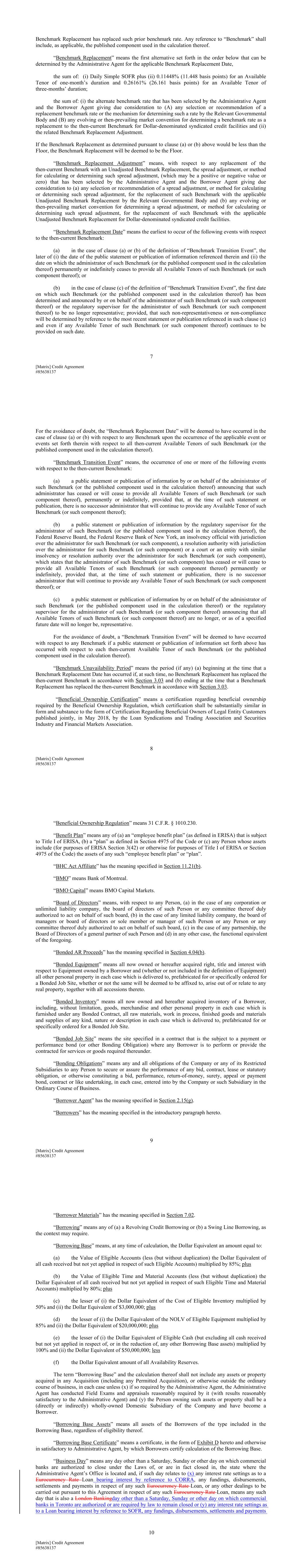 基准置换取代了此前的这种基准利率。任何提及“基准”的内容应包括(如适用)在计算其时使用的已发布组件。“基准更换”是指行政代理人可以为适用的基准更换日期确定的以下顺序中列出的第一个备选方案,(i)每日简单SOFR加(ii)一个月期限的可用期限为0.11448%(11.448个基点)和三个月期限的可用期限为0.26161%(26.16 1个基点)之和;以下各项之和:(i)备用基准利率行政代理人和借款人代理人在适当考虑(a)任何替代基准利率的选择或建议或相关政府机构确定此类利率的机制以及(b)任何正在演变或当时流行的确定基准利率的市场惯例,以替代当时美元计价的银团信贷便利的基准,以及(ii)相关的基准替代调整后选择的。如果根据上述(a)或(b)条确定的基准更替将低于下限,则基准更替将被视为下限。“基准置换调整”是指,就任何以未经调整的基准置换取代当时的基准而言,由行政代理人和借款方代理人适当考虑(a)任何选择或建议的利差调整,或计算或确定这种利差调整的方法(可能是正值或负值或零)选择的利差调整,或计算或确定这种利差调整的方法,由相关政府机构以适用的未调整基准替代替代此类基准和(b)任何正在演变或当时盛行的确定利差调整的市场惯例,或计算或确定此类利差调整的方法,以美元计价银团信贷额度的适用的未调整基准替代此类基准。“基准替换日期”是指与当时的基准相关的以下事件最早发生的日期:(a)在“基准转换事件”定义的(a)或(b)条的情况下,(i)公开声明或公布其中所指信息的日期,以及(ii)该基准(或计算该基准时使用的已公布部分)的管理人永久或无限期停止提供该基准(或其此类部分)的所有可用期限的日期,两者中较后者为准;或(b)在“基准过渡事件”定义的(c)条的情况下,此类基准(或其计算中使用的已公布组成部分)由此类基准(或其此类组成部分)的管理人或代表确定并宣布不再具有代表性的此类基准(或其此类组成部分)的管理人的监管主管的第一个日期;条件是,此类不代表性或不遵守情况将通过参考此类条款(c)中提及的最近的声明或出版物来确定,即使在该日期继续提供此类基准(或其此类组成部分)的任何可用期限。7 [ Matrix ]信贷协议# 85638137为免生疑问,在(a)或(b)条有关任何基准的情况下,在发生适用的事件或其中所述的有关该基准的所有当时可用期限(或计算该基准时使用的已公布组成部分)的事件时,将被视为发生了“基准更换日期”。“基准过渡事件”是指,就当时的基准发生以下一项或多项事件:(a)由或代表该基准的管理人(或其计算中使用的已公布组成部分)发表的公开声明或发布信息,宣布该管理人已永久或无限期停止或将停止提供该基准(或其此类组成部分)的所有可用期限,但前提是,在该声明或发布时,没有继任管理人将继续提供此类基准(或其此类组成部分)的任何可用期限;(b)监管主管为此类基准(或其计算中使用的已公布组成部分)的管理人、联邦储备委员会、纽约联邦储备银行、对此类基准(或此类组成部分)的管理人具有管辖权的破产官员公开声明或公布信息, 对这类基准(或这类组成部分)的管理人具有管辖权的解决机构或对这类基准(或这类组成部分)的管理人具有类似破产或解决权限的法院或实体,其中规定,这类基准(或这类组成部分)的管理人已停止或将停止永久或无限期地提供这类基准(或其这类组成部分)的所有可用期限,但条件是,在这类声明或公布时,没有继任管理人将继续提供此类基准(或其此类组成部分)的任何可用期限;或(c)由此类基准(或其计算中使用的已发布组成部分)的管理人或代表该基准(或其计算中使用的已发布组成部分)的管理人或该基准(或其此类组成部分)的监管主管发表公开声明或发布信息,宣布此类基准(或其此类组成部分)的所有可用期限不再具有代表性,或截至指定的未来日期将不再具有代表性。为免生疑问,如果就该基准的每个当时可用期限(或计算该期限时使用的已公布部分)发生了上述公开声明或信息的公布,则将被视为就任何基准发生了“基准过渡事件”。“基准不可用期间”是指(如果有的话)(a)自基准更换日期发生之时开始的期间,如果此时没有基准更换按照第3.03节取代当时的基准,以及(b)在基准更换按照第3.03节取代当时的基准时结束。“实益所有权认证”是指《实益所有权条例》要求的关于实益所有权的认证,该认证在形式和实质上应与2018年5月由贷款银团交易协会和证券业与金融市场协会联合发布的关于法人实体客户实益所有人的认证形式实质相似。8 [矩阵]信贷协议# 85638137“受益所有权监管”是指31 C.F.R. § 1010.230。“福利计划”是指(a)受ERISA标题I约束的“员工福利计划”(定义见ERISA)、(b)《守则》第4975节定义的“计划”或(c)其资产包括(就ERISA第3(42)节或ERISA标题I或《守则》第4975节而言)任何此类“员工福利计划”或“计划”资产的任何人。“BHC Act Affiliate”具有第11.21(b)节规定的含义。“BMO”意为蒙特利尔银行。“BMO资本”是指BMO资本市场。“董事会”是指,就任何人而言,(a)就任何法团或无限责任公司而言,该人的董事会或其任何委员会获正式授权代表该董事会行事,(b)就任何有限责任公司而言,经理人董事会或董事会或该人的唯一成员或经理或任何人或其任何委员会获正式授权代表该董事会行事,(c)就任何合伙而言,该人士的普通合伙人的董事会,