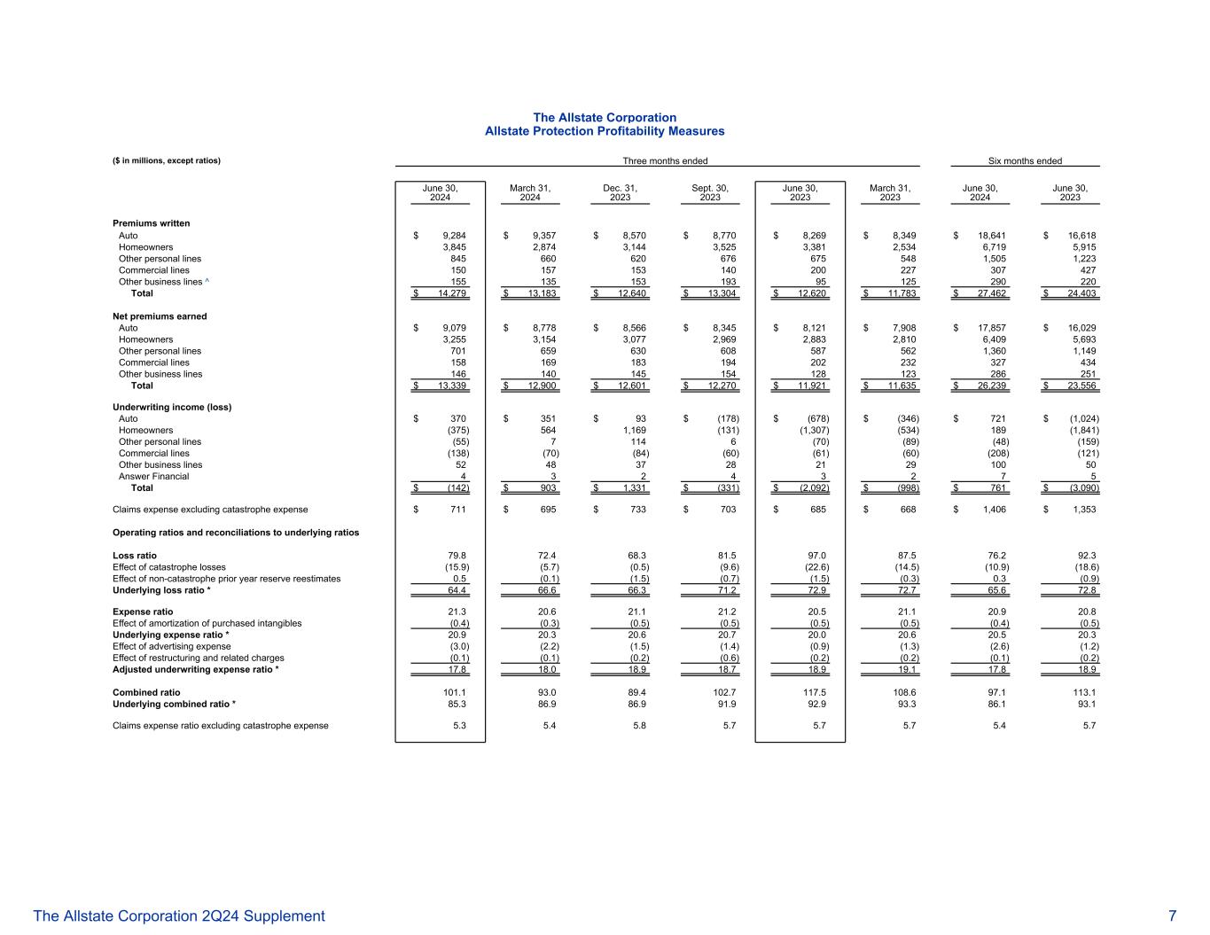 好事达保险公司好事达保险保护盈利能力衡量标准(百万美元,比率除外)截至2024年6月30日止六个月的三个月2024年3月31日2023年12月31日2023年9月30日2023年6月30日2023年3月31日2024年6月30日,2023 Premiums written Auto $ 9,284 $ 9,357 $ 8,570 $ 8,770 $ 8,269 $ 8,349 $ 18,641 $ 16,618 Homeowners 3,8452,8743,1443,5253,3812,5346,7195,915 Other personal lines 8456606206766755481,5051,223 Commercial lines 150157153140200227307427 Other business lines ^ 15513515319395125290220 total $ 14,279 $ 13,183 $ 12,640 $ 13,304 $ 12,620 $ 11,783 $ 27,462 $ 24,403 Net premiums earned Aut3,2553,1543,0772,9692,8832,8106,4095,693其他个人线路7016596306085875621,3601,149商业线路158169183194202232327434其他业务线路146140145154128123286251合计$ 13,339 $ 12,900 $ 12,601 $ 12,270 $ 11,921 $ 11,635 $ 26,239 $ 23,556承保收入(亏损)汽车$ 370 $ 351 $ 93 $(178)$(678)$(346)$ 721 $(1,024)房主(375)5641,169(131)(1,307)(534)189(1,841)其他个人线路(55)71146(70)(89)(48)(159)商业(138)(70)(84)(60)(61)(60)(208)(121)其他业务线52483728212910050答案财务43243275合计$(142)$ 903 $ 1,331 $(331)$(2,092)$(998)$ 761 $(3,090)不包括巨灾费用的索赔费用$ 711 $ 695 $ 733 $ 703 $ 685 $ 668 $ 1,406 $ 1,353营业比率与基础比率的调节损失率79.87 2.468.38 1.597.08 7.576.29 2.3巨灾损失的影响(15.9)(5.7)(0.5)(9.6)(22.6)(14.5)(10.9)(18.6)非巨灾上一年准备金重估的影响0.5(0.1)(1.5)(0.7)(1.5)(0.3)0.3(0.9)基础损失率* 64.466.66 6.37 1.27 2.97 2.765.67 2.8费用率21.32 0.62 1.12 1.52 1.12 0.92 0.8外购无形资产摊销的影响(0.4)(0.3)(0.5)(0.5)(0.5)(0.4)(0.5)基础费用率* 20.92 0.32 0.62 0.72 0.02 0.62 0.52 0.3广告费影响(3.0)(2.2)(1.5)(1.4)(0.9)(2.6)(1.2)重组及相关费用的影响(0.1)(0.1)(0.2)(0.6)(0.2)(0.2)(0.2)(0.1)(0.2)调整后承保费用率* 17.8 18.0 18.9 18.7 18.9 19.117.8 18.9合并比率101.19 3.089.4 102.71 17.5 108.69 7.11 13.1基础合并比率* 85.386.98 6.99 1.99 2.99 3.386.19 3.1不包括巨灾费用的索赔费用率5.35.45.85.75.75.75.75.75.75.75.75.75.75.75.75.75.75.75.75.75.75.75.75.75.75.75.75.75.75.75.75.75.75.75.75.75.75.75.75.75.75.75.75.75.75.75.75.75.75.75.75.75.75.75.75.75.75.75.75.75.75.75.75.75.75.75.75.75.75.75.75.75.75.75.75.75.75.75.75.75.75.75.75.75.75.75.75.75.75.75。