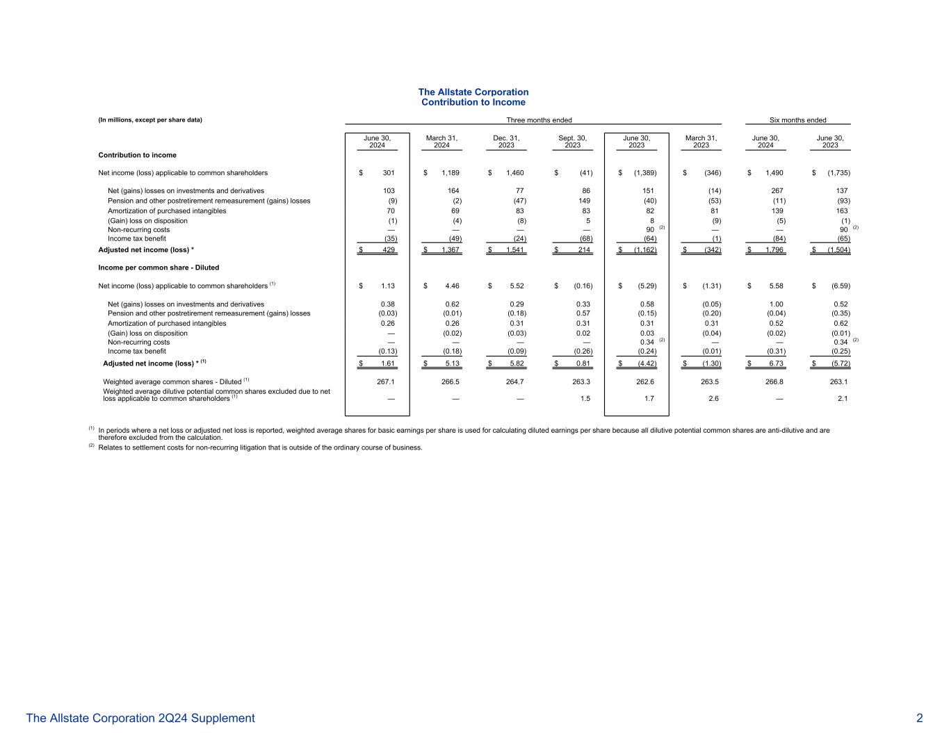 对收入的贡献(以百万计,每股数据除外)截至2024年6月30日止三个月2024年3月31日12月31日2023年9月30日2023年6月30日2023年6月30日2023年3月31日2024年6月30日,2023年对收入的贡献适用于普通股股东的净收入(亏损)301美元1189美元1460美元(41)美元(1389)美元(346)美元1490美元(1735)投资和衍生品净(收益)亏损1031647786151(14)267137养老金及其他退休后重新计量(收益)损失(9)(2)(47)149(40)(53)(11)(93)外购无形资产摊销706983838281139163(收益)处置损失(1)(4)(8)58(9)(5)(1)非经常性成本———— 90(2)—— 90(2)所得税优惠(35)(49)(24)(68)(64)(1)(84)(65)调整后净收益(亏损)* 429美元1367美元1541美元214美元(1,162)美元(342)美元1,796美元(1,504)每股普通股收益-适用于普通股股东的摊薄净收益(亏损)(1)1.13美元4.46美元$ 5.52 $(0.16)$(5.29)$(1.31)$ 5.58 $(6.59)投资和衍生品净(收益)损失0.38 0.62 0.29 0.33 0.58(0.05)1.00 0.52养老金及其他退休后重新计量(收益)损失(0.03)(0.01)(0.18)0.57(0.15)(0.20)(0.04)(0.35)外购无形资产摊销0.26 0.26 0.3 10.3 10.3 10.3 10.3 10.52 0.52 0.62(收益)处置损失—(0.02)(0.03)0.02 0.03(0.04)(0.02)(0.01)非经常性成本———— 0.34(2)—— 0.34(2)所得税收益(0.13)(0.18)(0.09)(0.26)(0.24)(0.01)(0.31)(0.25)调整后净收益(亏损)*(1)$ 1.61 $ 5.13 $ 5.82 $ 0.81 $(4.42)$(1.30)$ 6.73 $(5.72)加权平均普通股-稀释后(1)267.12 66.52 64.7263.3262.6263.5266.8 263.1 We由于适用于普通股股东的净亏损而排除的稀释性潜在普通股(1)———— 1.5 1.7 2.6 — 2.1(1)在报告净亏损或调整后净亏损的期间,计算稀释每股收益时使用基本每股收益的加权平均股份,因为所有稀释性潜在普通股都具有反稀释性,因此被排除在计算之外。(二)涉及正常经营过程之外的非经常性诉讼的和解费用。好事达保险公司 2Q24补充资料2