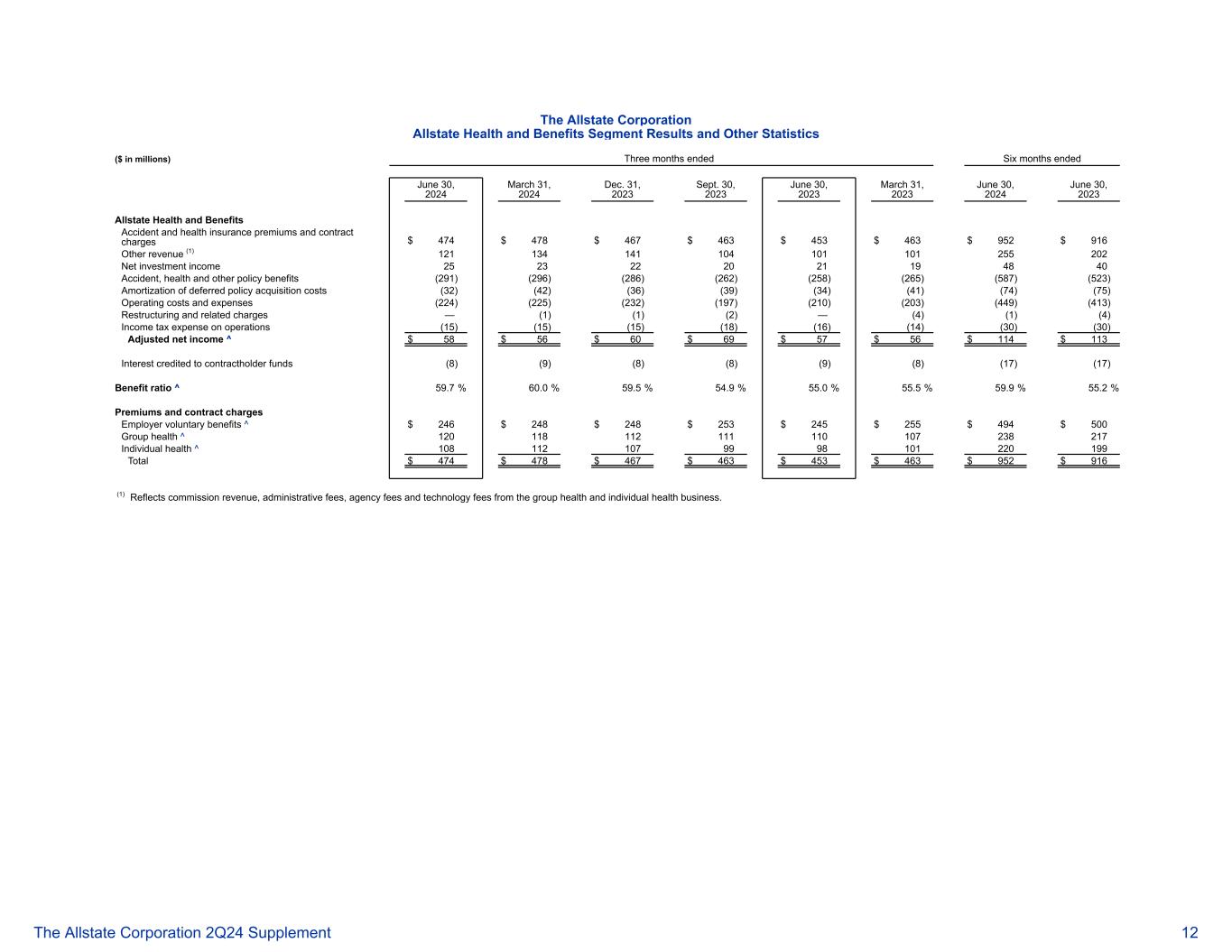 好事达保险公司好事达保险健康和福利部门业绩和其他统计数据(百万美元)截至2024年6月30日止三个月2024年3月31日12月31日2023年9月30日2023年6月30日2023年3月31日2023年6月30日2023年3月31日2024年6月30日2023年6月30日2023年6月30日好事达保险健康和福利事故和健康保险费和合同费用$ 474 $ 478 $ 467 $ 463 $ 453 $ 463 $ 952 $ 916其他收入(1)12113141104 101101255202净投资收益2523222021194840事故,健康及其他保单利益(291)(296)(286)(262)(258)(265)(587)(523)递延保单购置成本摊销(32)(42)(36)(39)(34)(41)(74)(75)营业成本和费用(224)(225)(232)(197)(210)(203)(449)(413)重组及相关费用—(1)(1)(2)—(4)(1)(4)运营所得税费用(15)(15)(15)(18)(16)(14)(30)(30)调整后净收益^ $ 58 $ 56 $ 60 $ 69 $ 57 $ 56 $ 114 $ 113记入合同持有人资金的利息(8)(9)(8)(9)(8)(8)(17)(17)受益率^ 59.7% 60.0% 59.5% 54.9% 55.0% 55.5% 59.9% 55.2%溢价和合同收费雇主自愿福利^ $ 246 $ 248 $ 248 $ 253 $ 245 $ 255 $ 494 $ 500团体健康^ 120118112111110107238217个人健康^ 1081121079998101220 199总计$ 474 $ 478 $ 467 $ 463 $ 453 $ 463 $ 463 $ 952 $ 916(1)反映来自团体健康和个人健康业务的佣金收入、行政费用、代理费用和技术费用。好事达保险公司 2Q24补充资料12