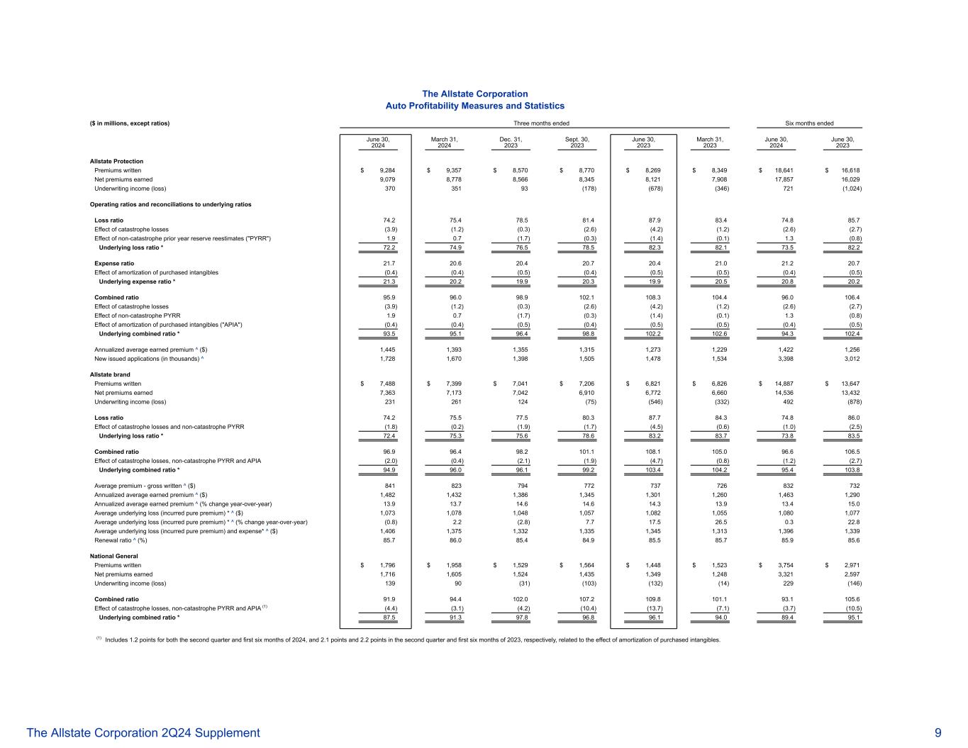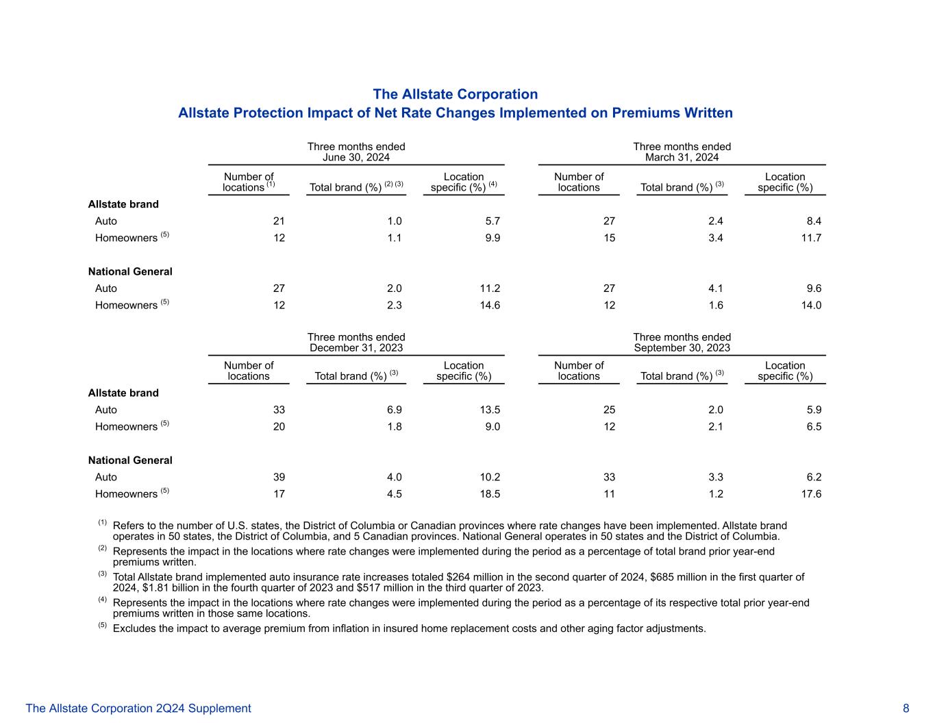 截至2024年6月30日止三个月的保费所实施的净费率变动对好事达保险公司的保护影响,截至2024年3月31日止三个月,地点数量(1)总品牌(%)(2)(3)特定地点(%)(4)地点数量总品牌(%)(3)特定地点(%)好事达保险品牌Auto 211.05.7 272.48.4业主(5)121.19.91 53.41 1.7全国通用汽车272.01 1.22 74.19.6业主(5)122.31 4.61 4.0截至2023年12月31日止三个月,2023年地点数量总品牌(%)(3)特定地点(%)地点数量总品牌(%)(3)特定地点(%)好事达保险品牌Auto 336.91 3.5 252.05.9房主(5)2011.89.01 22.16.5全国通用汽车394.0 10.23 33.36.2房主(5)174.5 18.5 111.217.6(1)是指实施了费率变化的美国各州、哥伦比亚特区或加拿大省份的数量。好事达保险品牌在50个州、哥伦比亚特区和加拿大5个省开展业务。National General在50个州和哥伦比亚特区开展业务。(2)表示在该期间实施费率变化的地点的影响占品牌上年末保费总额的百分比。(3)总计好事达保险品牌实施的汽车保险费率上调在2024年第二季度总计为2.64亿美元,在2024年第一季度(6.85亿美元),在2023年第四季度(18.1亿美元)和在2023年第三季度(5.17亿美元)。(4)表示在该期间实施费率变动的地点的影响占其各自在这些相同地点承保的上一年终总保费的百分比。(5)在投保的房屋重置成本和其他老化因素调整中排除通货膨胀对平均保费的影响。好事达保险公司 2Q24补充资料8