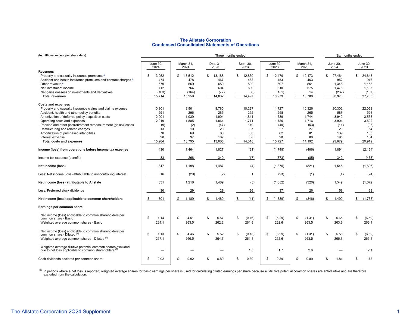 好事达保险公司简明合并经营报表(以百万计,每股数据除外)截至2024年6月30日止三个月2024年3月31日2023年12月31日2023年9月30日2023年6月30日2023年3月31日2024年6月30日,2023年收入财产和意外伤害保险费^ 13,952美元13,512美元13,188美元12,839美元12,470美元12,173美元27,464美元24,643美元事故和健康保险费和合同费用^ 474478467463453463952916其他收入^ 6796696505925975611,3481,158投资净收益7127646046896105751,4761,185投资和衍生品净收益(损失)(103)(164)(77)(86)(151)14(267)(137)总收入15,71415,25914,83214,49713,97913,78630,97327,765成本和费用财产和意外伤害保险索赔和索赔费用10,8019,5018,78010,23711,72710,32620,3022,053事故,健康和其他保单福利291296286262258265587523摊销递延保单购置成本2,0011,9391,9041,8411,7891,7443,9403,533营业成本和费用2,0 191,8851,8641,7711,7861,7163,9043,502养老金和其他退休后重新计量(收益)损失(9)(2)(47)149(40)(53)(11)(93)重组及相关费用13102887272354购入无形资产摊销706983838281139163利息费用9897 107889886195184总成本及费用15,28413,79513,00514,51815,72714,19229,07929,919营业收入(亏损)所得税前费用4301,4641,827(21)(1,748)(406)1,894(2,154)所得税费用(收益)83266340(17)(373)(85)349(458)净收益(亏损)3471,1981,487(4)(1,375)(321)1,545(1,696)减:归属于非控股权益的净利润(亏损)16(20)(2)1(23)(1)(4)(24)归属于好事达保险的净利润(亏损)3311,2181,489(5)(1,352)(320)1,549(1,672)减:优先股股息3029293637265963适用于普通股股东的净利润(亏损)$ 301 $ 1,189 $ 1,460每股普通股收益适用于普通股股东的每股普通股净收入(亏损)-基本$ 1.14 $ 4.51 $ 5.57 $(0.16)$(5.29)$(1.31)$ 5.65 $(6.59)加权平均普通股-基本264.1263.5262.2261.8262.6263.5263.8263.1适用于普通股股东的每股普通股净收入(亏损)-稀释后(1)$ 1.13 $ 4.46 $ 5.52 $(0.16)$(5.29)$(1.31)$ 5.58 $(6.59)加权平均普通股-稀释后(1)267.1266.52 61.8262.6263.5266.8263.1加权平均稀释性潜在普通股除外,原因是适用于普通股股东的净亏损(1)———— 1.5 1.7 2.6 — 2.1每股普通股宣布的现金股息0.92美元0.92美元0.89美元0.89美元0.89美元0.89美元0.89美元1.89美元1.84美元1.78美元(1)在报告净亏损期间,计算稀释每股收益时使用基本每股收益的加权平均股份,因为所有具有稀释性的潜在普通股都具有反稀释性,因此被排除在计算之外。好事达保险公司 2Q24补充1