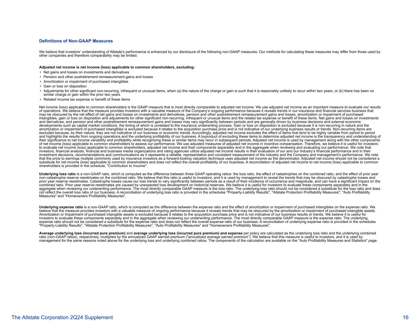 非GAAP衡量标准的定义我们认为,我们对以下非GAAP衡量标准的披露增强了投资者对好事达保险业绩的理解。我们计算这些衡量标准的方法可能与其他公司使用的方法不同,因此可比性可能有限。调整后的净收入是适用于普通股股东的净收入(亏损),不包括:•投资和衍生工具的净损益•养老金和其他退休后重新计量损益•购买的无形资产的摊销或减值•处置损益•其他重大非经常性、不经常或不寻常项目的调整,当(a)费用或收益的性质使得其在两年内合理地不太可能再次发生时,或(b)在过去两年内没有类似的费用或收益•这些项目的相关所得税费用或收益适用于普通股股东的净收入(亏损)是与调整后净收入最直接可比的GAAP衡量标准。我们使用调整后的净收入作为评估我们的经营业绩的重要衡量标准。我们认为,该衡量标准为投资者提供了衡量公司持续业绩的有价值的衡量标准,因为它揭示了我们的保险和金融服务业务的趋势,这些趋势可能被投资和衍生工具的净损益、养老金和其他退休后重新计量损益、购买的无形资产的摊销或减值、处置损益以及其他重大非经常性、不经常或不寻常项目的调整以及这些项目的相关税收费用或收益的净影响所掩盖。投资和衍生工具的净损益以及养老金和其他退休后重新计量损益在不同时期可能会有很大差异,通常受商业决策和外部经济发展(如资本市场状况)的驱动,其时间安排与保险承保过程无关。处置收益或损失被排除在外,因为它是非经常性的,购买的无形资产的摊销或减值被排除在外,因为它与收购购买价格有关,并不代表我们的基本业务结果或趋势。非经常性项目被排除在外,因为就其性质而言,它们并不代表我们的业务或经济趋势。因此,调整后的净收入不包括不同时期往往高度可变的项目的影响,并突出了持续经营的结果和我们业务的基本盈利能力。排除这些项目以确定调整后净收入的一个副产品是透明度和对其对净收入可变性和盈利能力重要性的理解,同时确认这些或类似项目可能会在后续期间再次出现。管理层将调整后的净收入与适用于普通股股东的净收入(亏损)的其他组成部分一起用于评估我们的业绩。我们在激励薪酬中使用调整后净收入的调整措施。因此,我们认为投资者在审查和评估我们的业绩时,单独和综合评估适用于普通股股东的净收入(亏损)、调整后的净收入及其组成部分是有用的。我们注意到,投资者、金融分析师、金融和商业媒体机构以及评级机构在评估我们和我们行业的财务业绩以及在他们的投资决策、建议和沟通中使用调整后的净收入结果,因为它代表了对行业和公司以及管理层业绩的可靠、有代表性和一致的衡量。我们注意到,保险投资者常用的市盈率倍数作为前瞻性估值技术,是以调整后的净利润作为分母。调整后的净收入不应被视为可替代适用于普通股股东的净收入(亏损),也不能反映我们业务的整体盈利能力。附表“对收益的贡献”中提供了适用于普通股股东的调整后净收入与净收入(亏损)的对账。基础损失率是一种非GAAP比率,计算为三个GAAP运营比率之间的差异:损失率、巨灾对合并比率的影响以及上一年非巨灾准备金重新估计对合并比率的影响。我们认为,这一比率对投资者很有用,管理层用它来揭示可能被巨灾损失和上一年准备金重新估计所掩盖的趋势。巨灾损失导致我们的损失趋势因其发生的发生率和规模而在不同时期之间存在显着差异, 并能对合并比率产生显著影响。上一年度的储备重新估计是由历史储备的意外损失发展引起的。我们认为,投资者在审查我们的承销业绩时,单独和综合评估这些组成部分是有用的。最直接可比的GAAP衡量标准是损失率。基础损失率不应被视为损失率的替代品,不能反映我们业务的整体损失率。附表“财产-责任结果”、“好事达保险保护盈利能力措施”、“汽车盈利能力措施”和“房主盈利能力措施”中提供了基础损失率的调节。基础费用率是一种非公认会计原则的比率,计算为费用率与购买的无形资产摊销或减值对费用率的影响之间的差额。我们认为,该衡量标准为投资者提供了一个有价值的持续业绩衡量标准,因为它揭示了可能被购买的无形资产的摊销或减值所掩盖的趋势。购买的无形资产的摊销或减值被排除在外,因为它与收购购买价格有关,并不代表我们的业务结果或趋势。我们认为,投资者在审查我们的承销业绩时,单独和综合评估这些组成部分是有用的。最直接可比的GAAP衡量标准是费用率。基础费用率不应被视为费用率的替代品,不能反映我们业务的整体费用率。附表“物业-负债结果”、“好事达保险保护盈利能力措施”、“汽车盈利能力措施”和“业主盈利能力措施”中提供了基础费用率的调节。平均基础损失(已发生纯保费)和平均基础损失(已发生纯保费)以及每份保单的费用分别计算为基础损失率和基础综合比率(非GAAP比率),乘以年化GAAP已赚保费(“年化平均已赚保费”)。我们认为,这一衡量标准对投资者是有用的,管理层出于上述相同原因将其用于基础损失和基础综合比率。该计算的组成部分可在“汽车盈利能力衡量和统计”页面上查阅。好事达保险公司 2Q24补充资料16