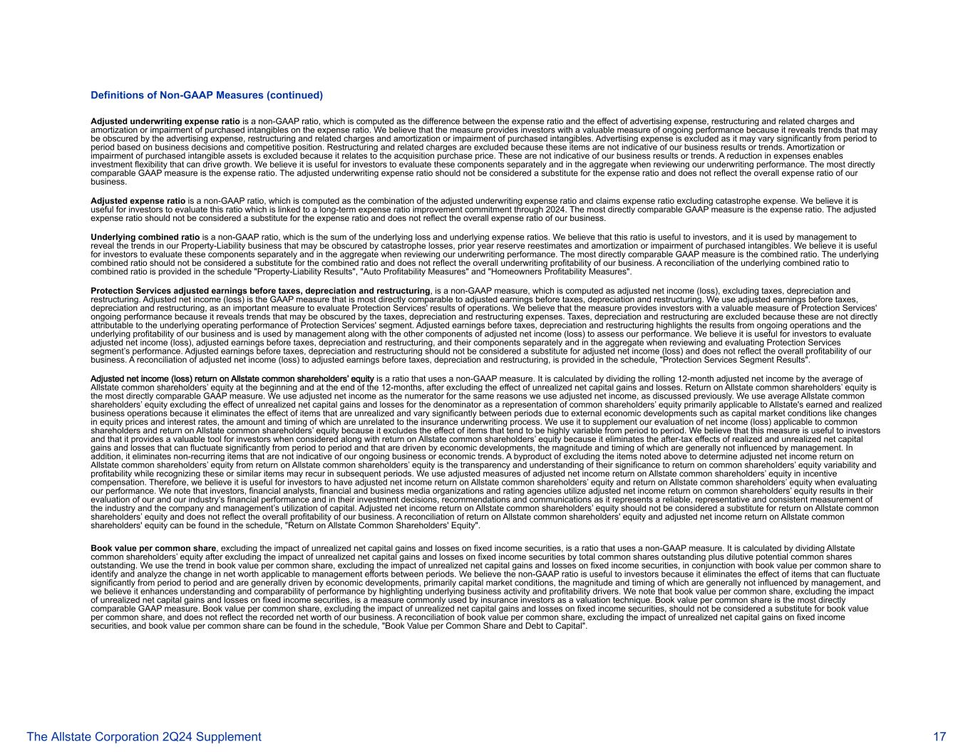 Non-GAAP措施的定义(续)调整后的承保费用率是一种非GAAP比率,计算为费用率与广告费用、重组和相关费用以及购买的无形资产的摊销或减值对费用率的影响之间的差额。我们认为,该衡量标准为投资者提供了一个衡量持续业绩的有价值的衡量标准,因为它揭示了可能被广告费用、重组和相关费用以及购买的无形资产的摊销或减值所掩盖的趋势。广告费用被排除在外,因为根据业务决策和竞争地位,不同时期的广告费用可能会有很大差异。重组和相关费用被排除在外,因为这些项目并不代表我们的业务结果或趋势。购买的无形资产的摊销或减值被排除在外,因为它与收购购买价格有关。这些并不代表我们的业务成果或趋势。费用减少可带来投资灵活性,从而推动增长。我们认为,投资者在审查我们的承销业绩时,单独和综合评估这些组成部分是有用的。最直接可比的GAAP衡量标准是费用率。调整后的承保费用率不应被视为费用率的替代,不能反映我们业务的整体费用率。调整后的费用率是一种非公认会计原则的比率,计算为调整后的承保费用率和不包括巨灾费用的索赔费用率的组合。我们认为,投资者评估这一与2024年之前的长期费用率改善承诺相关的比率是有用的。最直接可比的GAAP衡量标准是费用率。调整后的费用率不应被视为费用率的替代,不能反映我们业务的整体费用率。基础综合比率是一种非公认会计准则比率,是基础亏损和基础费用率的总和。我们认为,这一比率对投资者很有用,管理层用它来揭示我们的财产负债业务的趋势,这些趋势可能被巨灾损失、上一年准备金重新估计以及购买的无形资产的摊销或减值所掩盖。我们认为,投资者在审查我们的承销业绩时,单独和综合评估这些组成部分是有用的。最直接可比的GAAP衡量标准是合并比率。标的合并比率不应被视为合并比率的替代品,也不能反映我们业务的整体承保盈利能力。附表“财产-负债结果”、“汽车盈利衡量标准”和“房主盈利衡量标准”中提供了基础合并比率与合并比率的对账。Protection Services调整后的税前利润、折旧和重组前利润是一种非GAAP衡量标准,计算为调整后的净收入(亏损),不包括税项、折旧和重组。调整后的净收入(亏损)是与调整后的税前利润、折旧和重组前利润最直接可比的GAAP衡量标准。我们使用调整后的税前利润、折旧和重组,作为评估Protection Services经营业绩的重要衡量标准。我们认为,该措施为投资者提供了一个衡量Protection Services持续业绩的有价值的指标,因为它揭示了可能被税收、折旧和重组费用所掩盖的趋势。税收、折旧和重组被排除在外,因为这些不能直接归因于保护服务部门的基本经营业绩。调整后的税前利润、折旧和重组突出了持续运营的结果和我们业务的基本盈利能力,管理层将其与调整后净收入(亏损)的其他组成部分一起用于评估我们的业绩。我们认为,投资者在审查和评估保护服务部门的业绩时,单独和综合评估调整后的净收入(亏损)、调整后的税前利润、折旧和重组,及其组成部分是有用的。调整后的税前利润、折旧和重组不应被视为可替代调整后的净收入(亏损),也不能反映我们业务的整体盈利能力。附表中提供了调整后净收入(亏损)与调整后税前利润、折旧和重组前利润的对账, “保护服务分部业绩”。好事达保险普通股股东权益的调整后净收入(亏损)回报率是一个使用非公认会计原则衡量的比率。它的计算方法是,在排除未实现净资本损益的影响后,将滚动的12个月调整后净收益除以这12个月期初和期末好事达保险普通股股东权益的平均值。好事达保险普通股股东权益回报率是最直接可比的GAAP衡量标准。我们使用调整后的净收入作为分子,原因与我们使用调整后的净收入相同,如前所述。我们使用剔除未实现净资本损益影响的平均好事达保险普通股股东权益作为主要适用于好事达保险已赚取和已实现业务运营的普通股股东权益的表示,因为它消除了未实现的项目的影响,并且由于诸如股权价格和利率变化等外部经济发展而在不同时期之间存在显着差异,其金额和时间与保险承保过程无关。我们用它来补充我们对适用于普通股股东的净收入(亏损)和好事达保险普通股股东权益回报率的评估,因为它排除了不同时期往往变化很大的项目的影响。我们认为,这一措施对投资者有用,并且在与好事达保险普通股股东权益回报率一起考虑时,它为投资者提供了一个有价值的工具,因为它消除了已实现和未实现的净资本损益的税后影响,这些影响可能会在不同时期大幅波动,并且受经济发展的驱动,其幅度和时间通常不受管理层的影响。此外,它消除了不代表我们正在进行的业务或经济趋势的非经常性项目。将上述项目排除在外以从好事达保险普通股股东权益报酬率中确定调整后的好事达保险普通股股东权益净收益报酬率的一个副产品是透明度和对其对普通股股东权益报酬率可变性和盈利能力的重要性的理解,同时确认这些或类似项目可能会在后续期间再次出现。我们在激励薪酬中使用调整后的好事达保险普通股股东权益净收益回报率计量方法。因此,我们认为投资者在评估我们的业绩时,有必要调整好事达保险普通股股东权益的净收入回报率和好事达保险普通股股东权益回报率。我们注意到,投资者、金融分析师、金融和商业媒