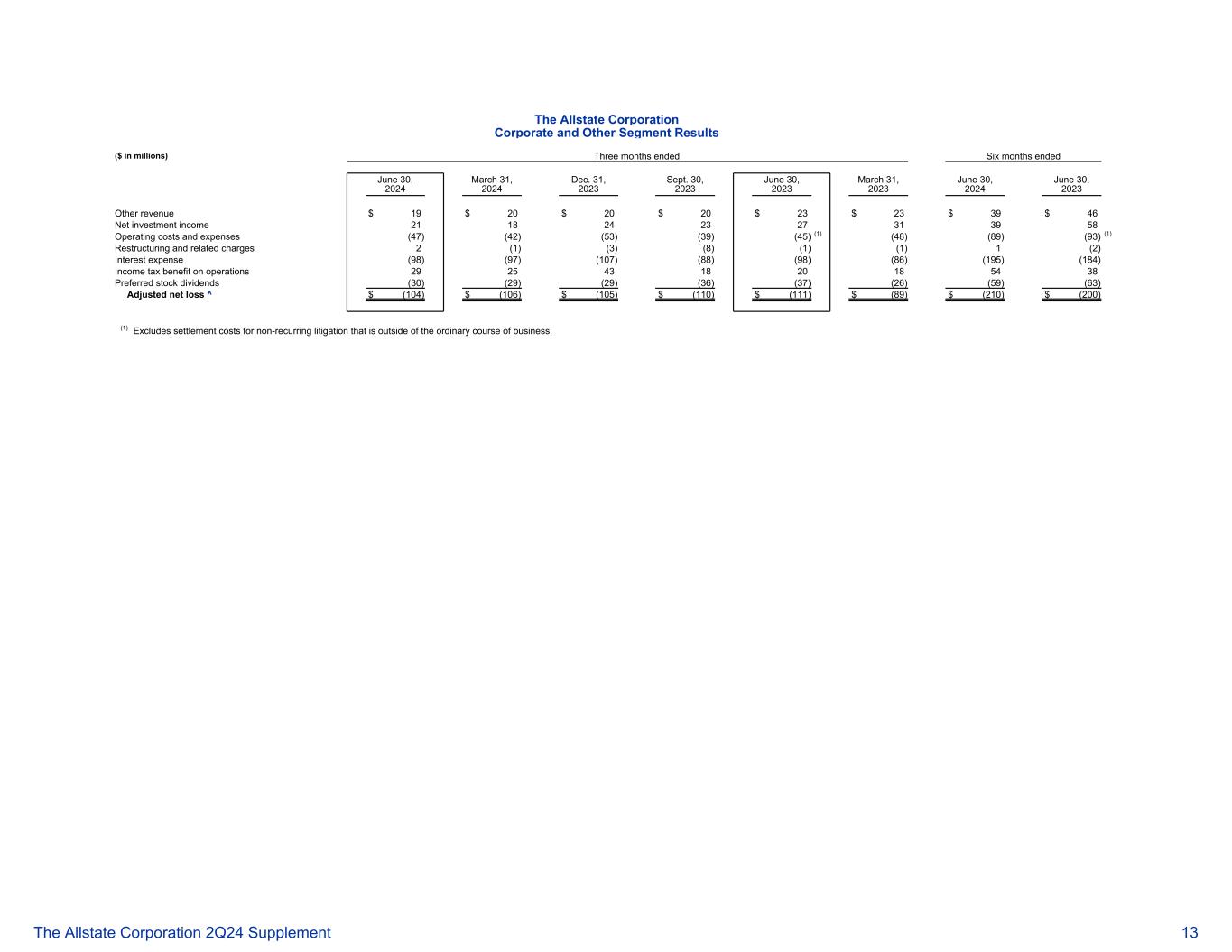 好事达保险公司公司及其他分部业绩(百万美元)截至2024年6月30日止三个月2024年3月31日2023年12月31日2023年9月30日2023年6月30日2023年3月31日2024年6月30日,2023其他收入$ 19 $ 20 $ 20 $ 20 $ 23 $ 23 $ 39 $ 46净投资收益2118242327313958营业成本和费用(47)(42)(53)(39)(45)(1)(48)(89)(93)(1)重组及相关费用2(1)(3)(8)(1)(1)1(2)利息支出(98)(97)(107)(88)(98)(86)(195)(184)经营所得税优惠2925431820185438优先股股息(30)(29)(29)(36)(37)(26)(59)(63)调整后净亏损^ $(104)$(106)$(105)$(110)$(111)$(89)$(210)$(200)(1)不包括超出正常业务过程的非经常性诉讼的和解费用。好事达保险公司 2Q24补充资料13