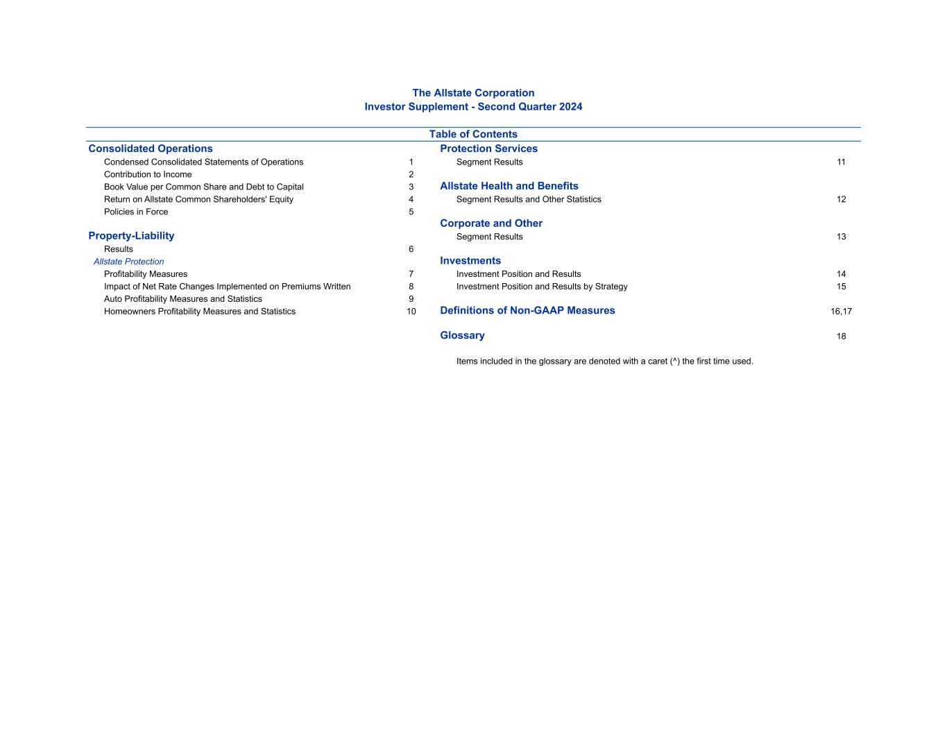 好事达保险公司投资者补充资料-2024年第二季度目录合并运营保护服务简明合并运营报表1分部业绩11对收益的贡献2每普通股的账面价值和债务对资本的影响3 好事达保险 Health and Benefits对好事达保险普通股股东权益的回报率4分部业绩和其他统计数据12项现行政策5公司和其他财产-负债分部业绩13项业绩6 好事达保险 Protection Investments Profitability Measures 7 Investment Position and Results 14 Impact of net rate changes implemented on premiums written 8 Investment Position和结果按战略15汽车盈利能力衡量和统计9房主盈利能力衡量和统计10非公认会计原则衡量的定义16,17词汇表中包含的18个项目在首次使用时以插值(^)表示。