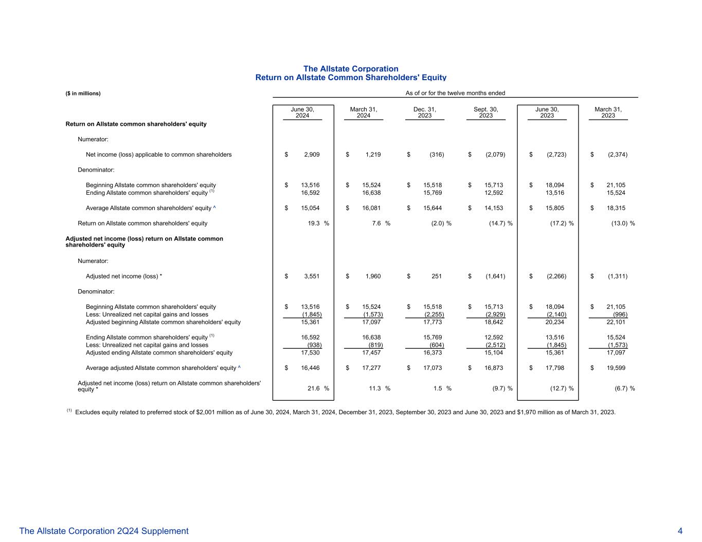 截至2024年6月30日止十二个月的好事达保险公司好事达保险普通股股东权益回报率(百万美元)2024年3月31日2023年12月31日2023年9月30日2023年6月30日,2023 好事达保险普通股股东权益回报率分子:适用于普通股股东的净收入(亏损)$ 2,909 $ 1,219 $(316)$(2,079)$(2,723)$(2,374)分母:期初好事达保险普通股股东权益$ 13,516 $ 15,524 $ 15,518 $ 15,713 $ 18,094 $ 21,105期末好事达保险普通股股东权益(1)16,59216,63815,76912,59213,51615,524平均好事达保险普通股股东权益^ $ 15,054 $ 16,081 $ 15,644 $ 14,153 $ 15,805 $ 18,315 好事达保险普通股股东权益回报率19.3% 7.6%(2.0)%(14.7)%(17.2)%(13.0普通股股东权益分子:调整后净收入(亏损)* 3551美元1960美元251美元(1641)美元(2266)美元(1311)分母:期初好事达保险普通股股东权益13,516美元15,524美元15,518美元15,713美元18,094美元21,105美元减:未实现净资本损益(1,845)(1,573)(2,255)(2,929)(2,140)(996)调整后期初好事达保险普通股股东权益15,36117,09717,77318,64220,23422,101期末好事达保险普通股股东权益(1)16,59216,63815,76912,59213,51615,524减:未实现净资本利得和亏损(938)(819)(604)(2,512)(1,845)(1,573)调整后期末好事达保险普通股股东权益17,53017,45716,37315,10415,36117,097平均调整后的好事达保险普通股股东权益^ $ 16,446 $ 17,277 $ 17,073 $ 16,873 $ 17,798 $ 19,599调整后的好事达保险普通股股东权益净收入(亏损)回报率* 21.6% 11.3% 1.5%(9.7)%(12.7)%(6.7)%(1)不包括截至2024年6月30日、2024年3月31日、2023年12月31日、2023年9月30日和2023年6月30日与优先股相关的股本为20.01亿美元,截至2023年3月31日为19.7亿美元。好事达保险公司 2Q24补充4