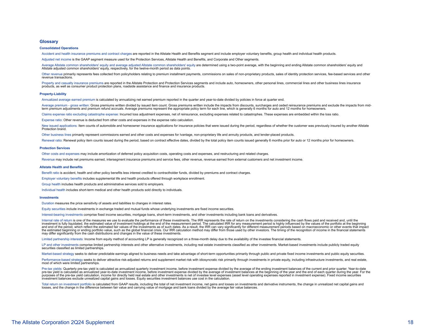 名词解释合并运营事故和健康保险费和合同费用在好事达保险健康和福利部门报告,包括雇主自愿福利、团体健康和个人健康产品。调整后的净收入是用于保护服务、好事达保险健康和福利以及公司和其他部门的GAAP部门衡量标准。平均好事达保险普通股股东权益和平均调整后好事达保险普通股股东权益采用两点平均确定,分别以十二个月期间的期初和期末好事达保险普通股股东权益和好事达保险调整后普通股股东权益为数据点。其他收入主要指向投保人收取的与保费分期付款、销售非专有产品的佣金、销售身份保护服务、收费服务和其他收入交易有关的费用。财产和意外伤害保险保费在好事达保险保护和保护服务部门报告,包括汽车、房主、其他个人险种、商业险种和其他业务险种的保险产品,以及消费者产品保护计划、路边援助以及金融和保险产品。财产-负债年化平均已赚保费的计算方法是将本季度和年初至今报告的净已赚保费年化除以季度末有效的保单。平均保费-毛承保:毛承保保费除以已签发的件数。毛保费包括折扣、附加费和分出再保险保费的影响,不包括中期保费调整和保费退款应计的影响。平均保费代表每个险种的适当保单期限,汽车一般为6个月,房主为12个月。不含巨灾费用的理赔费用率:已发生损失调整费用,扣除再保险,不含与巨灾相关的费用。这些费用都包含在赔付率中。费用率:其他收入在费用率计算中扣除其他成本费用。新签发的申请:期间签发的保单的汽车和房主保险申请的项目计数,无论客户之前是否投保了其他好事达保险保障品牌。其他业务线主要代表Ivantage、非专有寿险和年金产品以及贷方配售产品的佣金收入以及其他成本和费用。续期比率:期间签发的续期保单项目计数,以合同生效日期为基础,除以一般为汽车提前6个月或为房主提前12个月签发的保单项目总数。保护服务其他成本和费用可能包括递延保单购置成本的摊销、运营成本和费用以及重组和相关费用。收入可能包括已赚取的净保费、分部间保险费和服务费、其他收入、从外部客户赚取的收入和净投资收益。好事达保险 Health and Benefits福利比率是意外、健康和其他保单福利减去记入合同持有人资金的利息,除以保费和合同费用。雇主自愿福利包括通过工作场所注册提供的补充生活和健康产品。团体健康包括出售给雇主的健康产品和行政服务。个人健康包括直接面向个人销售的短期医疗及其他健康产品。投资久期衡量资产和负债对利率变化的价格敏感性。权益类证券包括投资于基础投资为固定收益证券的交易所交易和共同基金。计息投资包括固定收益证券、抵押贷款、短期投资,以及包括银行贷款和衍生品在内的其他投资。内部收益率是我们用来评估这些投资绩效的衡量标准之一。IRR表示考虑到支付和收到的现金流的投资收益率,以及在投资完全清算之前,在计量期结束时投资持股的估计价值。任何计量期间的计算IRR都受到该期间开始和结束时投资组合价值的高度影响,这些价值反映了截至这些日期的投资的估计公允价值。因此,基于宏观经济或其他影响估计的期初或期末投资组合价值的事件,内部收益率在不同的衡量期间可能会有显着差异, 比如全球金融危机。我们的IRR计算方法可能与其他投资者使用的方法有所不同。在财务报表中确认收入的时间可能与这些投资的现金分配和价值变化有很大不同。有限合伙权益:权益会计法LP的收益一般因被投资单位财务报表的可获得性而延迟三个月确认。LP和其他投资包括有限合伙权益和其他另类投资,包括归类为其他投资的房地产投资。以市场为基础的投资包括归类为有限合伙企业的公开交易股本证券。基于市场的战略寻求提供与业务需求相一致的可预测收益,并主要通过公共和私人固定收益投资和公共股票证券利用短期机会。基于绩效的策略寻求提供有吸引力的风险调整后回报,并主要通过对私募股权的投资(包括基础设施投资)和房地产(其中大多数是有限合伙企业)以特殊风险补充市场风险。税前收益率:季度税前收益率计算为年化季度投资收益,投资费用前除以当期和上一季度期末投资余额的平均值。年初至今税前收益率的计算方法为年化年初至今投资收益,投资费用前除以年初和年内各季度末投资余额的平均值。就税前收益率计算而言,直接持有的房地产和其他投资的收益是扣除被投资方层面的费用(在投资费用中列报的资产层面的运营费用)。固定收益证券投资余额不包括未实现的资本损益。权益类证券投资余额在计算中使用成本。投资组合的总回报是根据公认会计原则结果计算的,包括净投资收益、投资和衍生工具的净损益、未实现净资本损益的变化、抵押贷款和银行贷款的公允价值和账面价值之间的差额的变化除以平均公允价值余额的总和。好事达保险公司 2Q24补充资料18